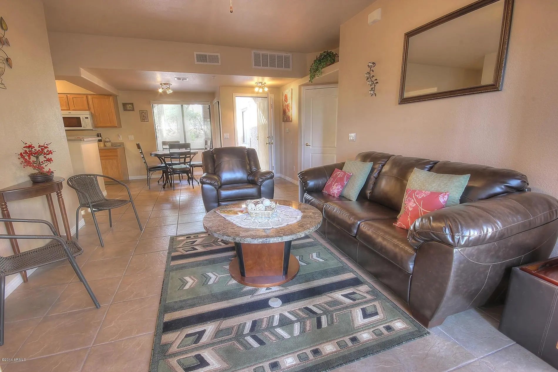 Perfect ground level unit with a beautiful natural desert wash just steps from your backyard. Inside is an open great room, dining area and connected kitchen. Both oversized bedrooms are split on either side of the unit, the guest bedroom with a big walk in closet, and the master bedroom with a private exit out to the patio. Plus this great community offers a heated saltwater pool, jacuzzi, and gym.