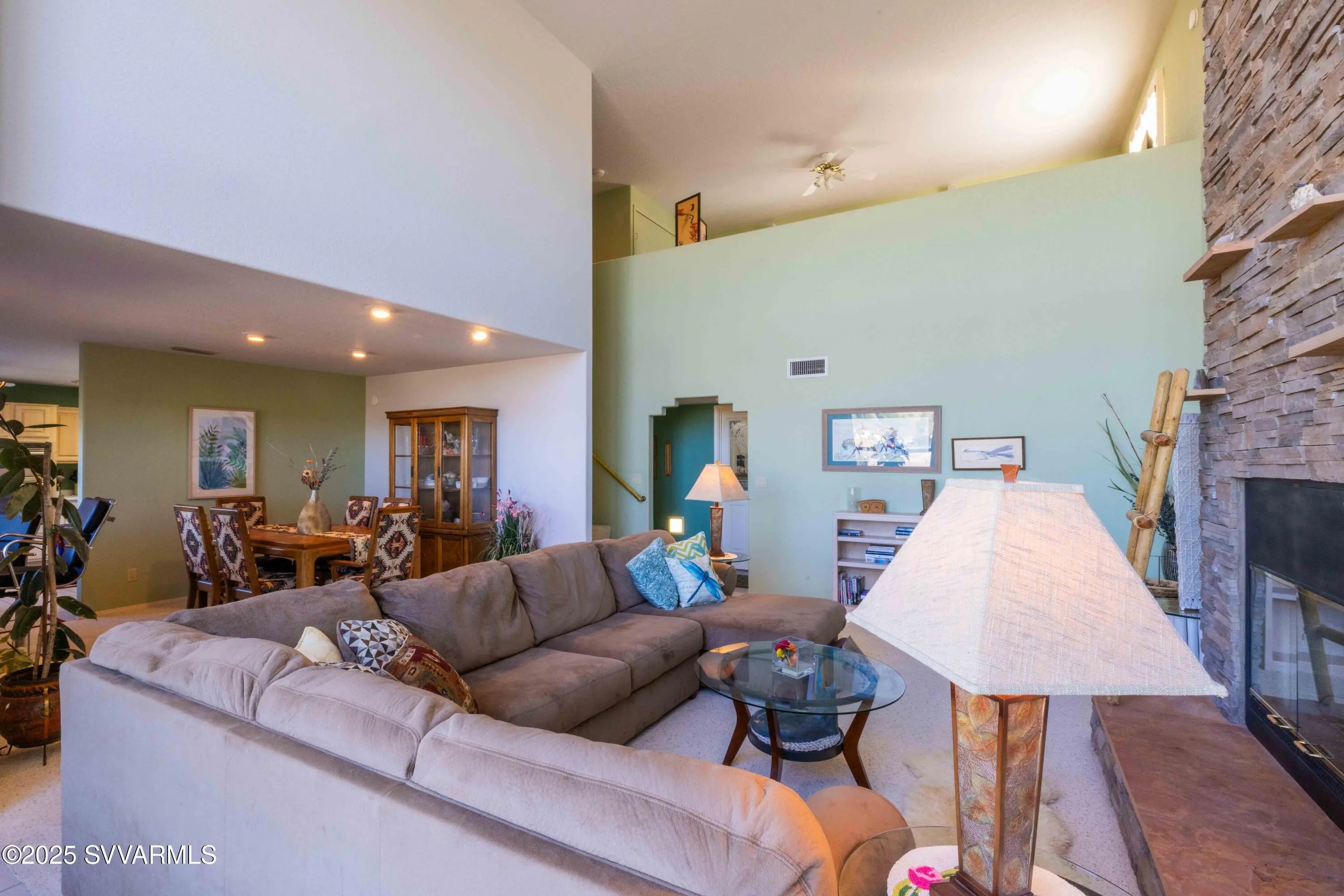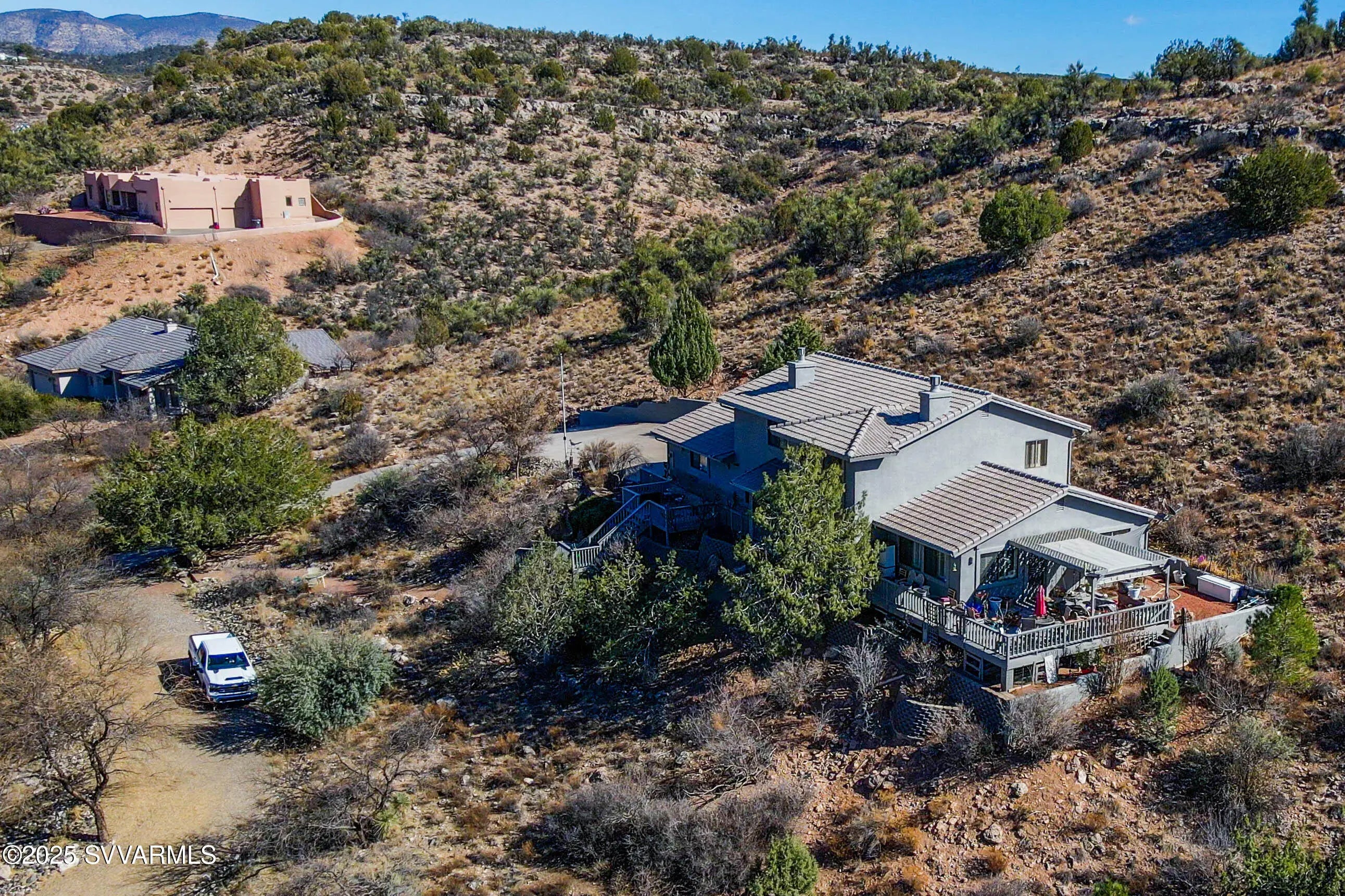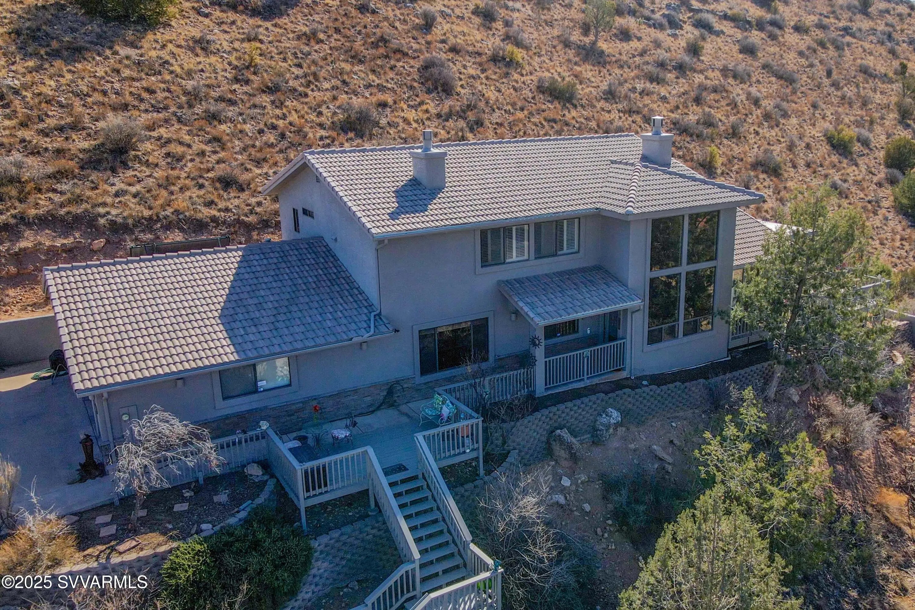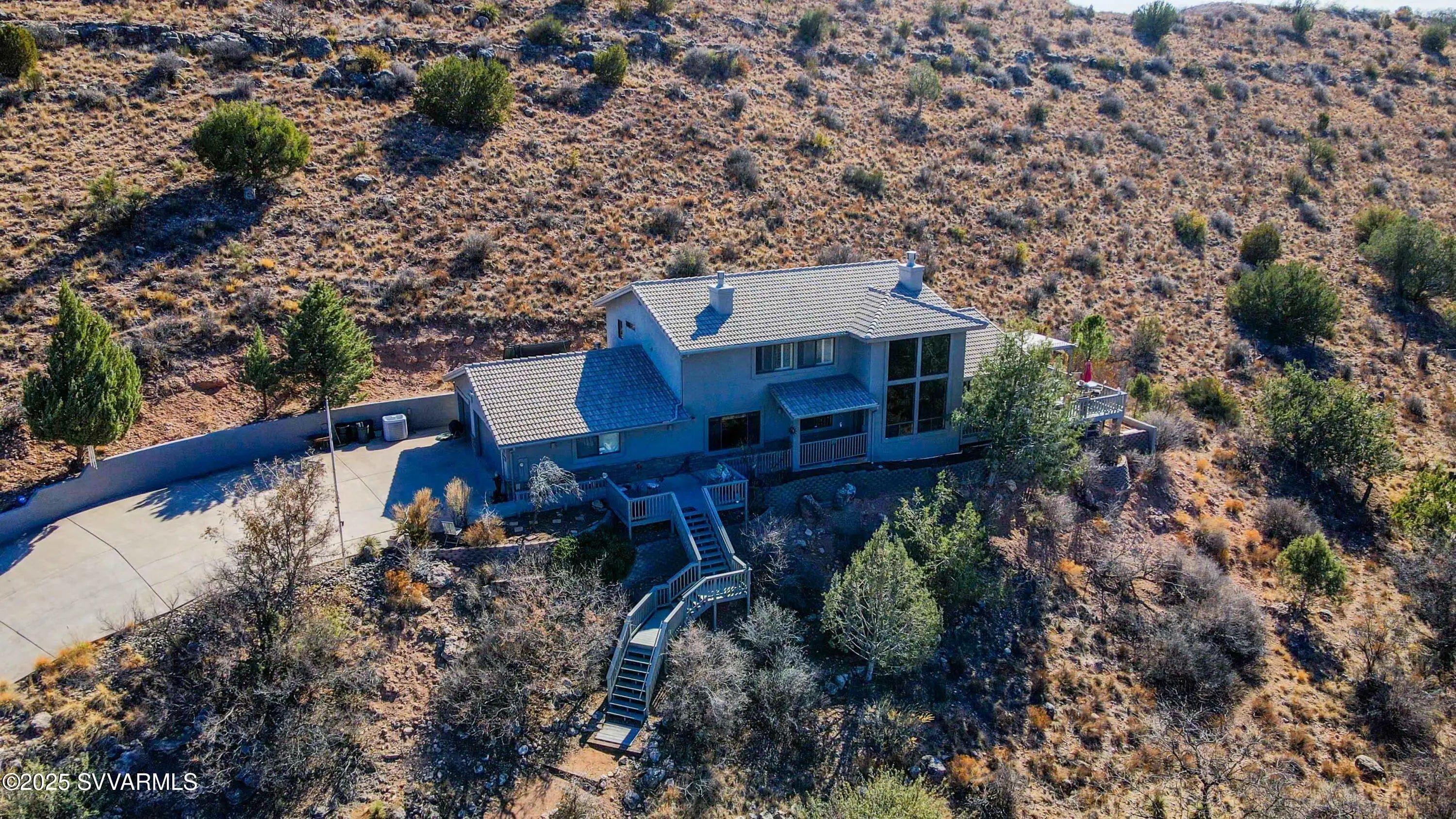 Perched high on a hillside with panoramic views to Sedona; this home has been well cared for & has only had 2 owners. Enjoy the views of Mingus Mountain, Sedona's famed red rock and the San Francisco Peaks in Flagstaff from the large deck or the living room with it's 16 foot ceilings and incredible rock fireplace. You'll find 2 guest bedrooms on the main floor with the primary bedroom and a loft tucked away on the upper level. There's a charming coffee bar/wine room with built in cabinets and sink in the guest wing; as well as a separate laundry room with utility sink. The primary suite has 2 large closets and a cedar closet, laundry chute, jetted tub and fireplace. If that's not enough, you have 2 full driveways for extra parking, a workshop and half bath in the garage.