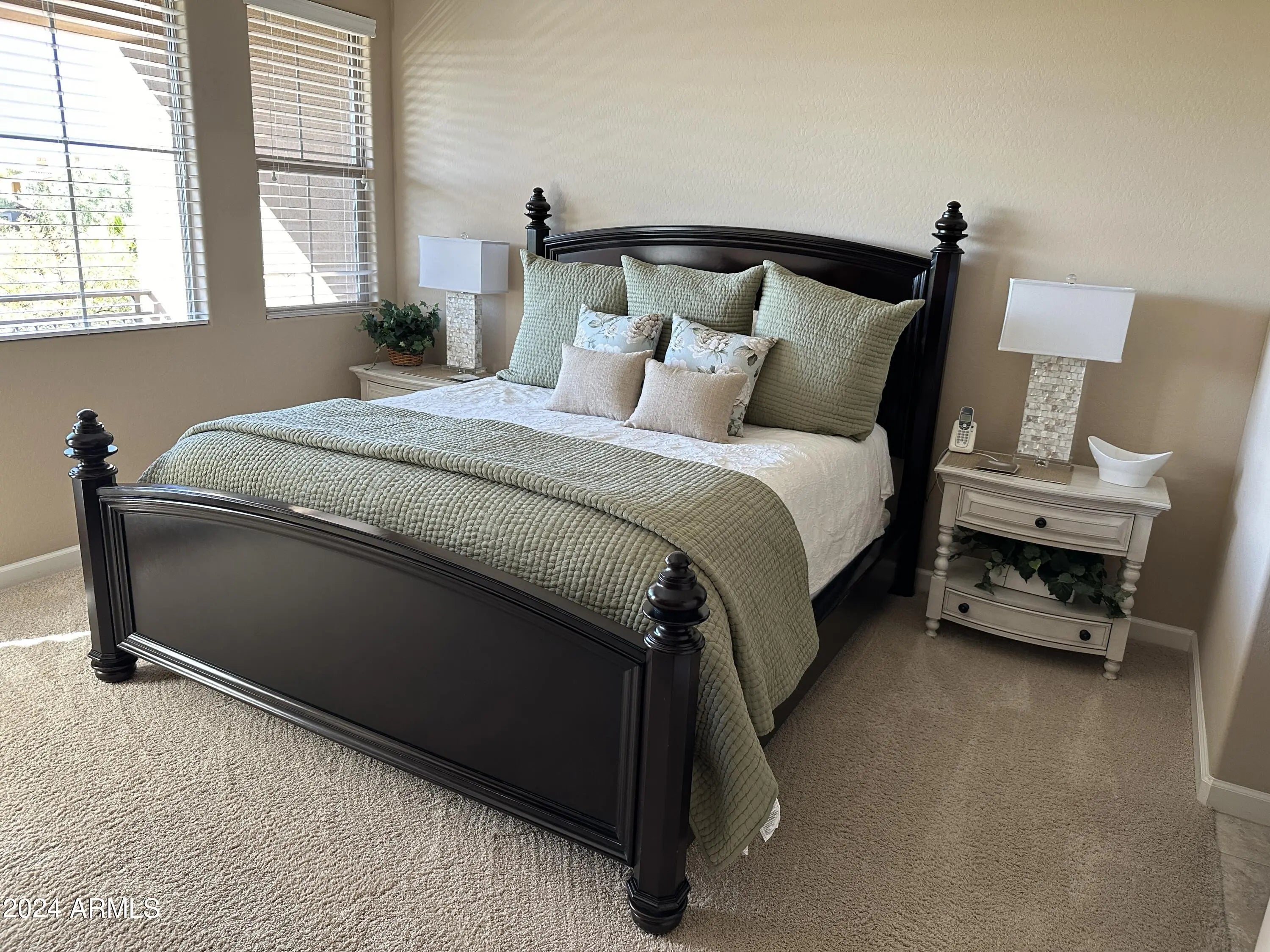 Beautifully furnished 2 bedroom + den, 2.5 bath 2-story townhouse on quiet interior lot with both mountain & NAOS views. First floor has Living Room, kitchen, dining, den, laundry, half bath. Living Room 65'' Sony Smart TV, Blu-ray player, surround sound, Cox highspeed WI-FI, and fireplace. The kitchen has upgraded cabinets, slab granite countertops and SST appliances, fully equipped for gourmet cooking. Den has luxurious daybed w/ trundle & desk for working. Lovely patio for lounging, dining, sunsets. Second floor has Primary, en-suite, and Secondary, en-suite, both with flat screen TVs. Primary bath has dual sinks, deep soaking tub, separate shower, walk-in closet, and balcony for stargazing. New communal outdoor Kitchen/BBQ 30 feet from back patio. Several walking trails in Grayhawk, some with access to and from the front gate. Community Heated pool/spa, gas BBQs and Fitness Center. Walk to Grayhawk Golf Club & DC Ranch Market St.