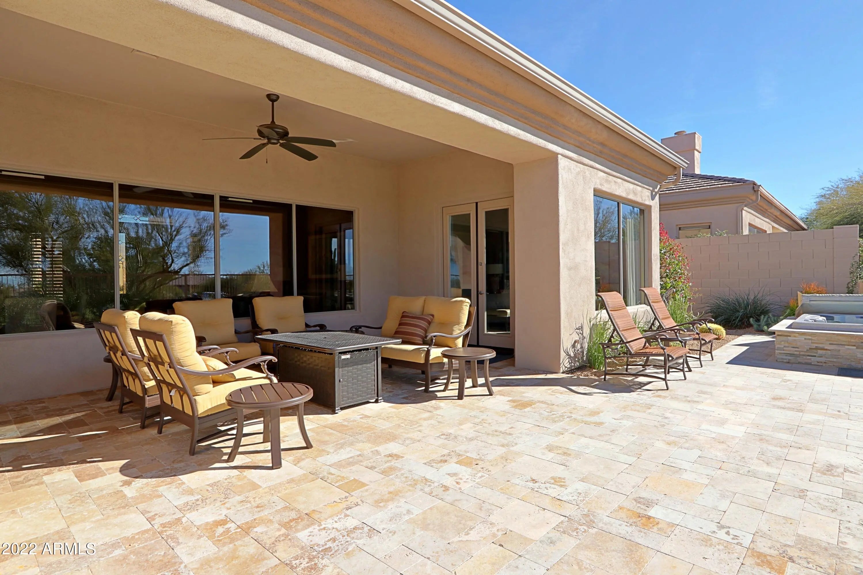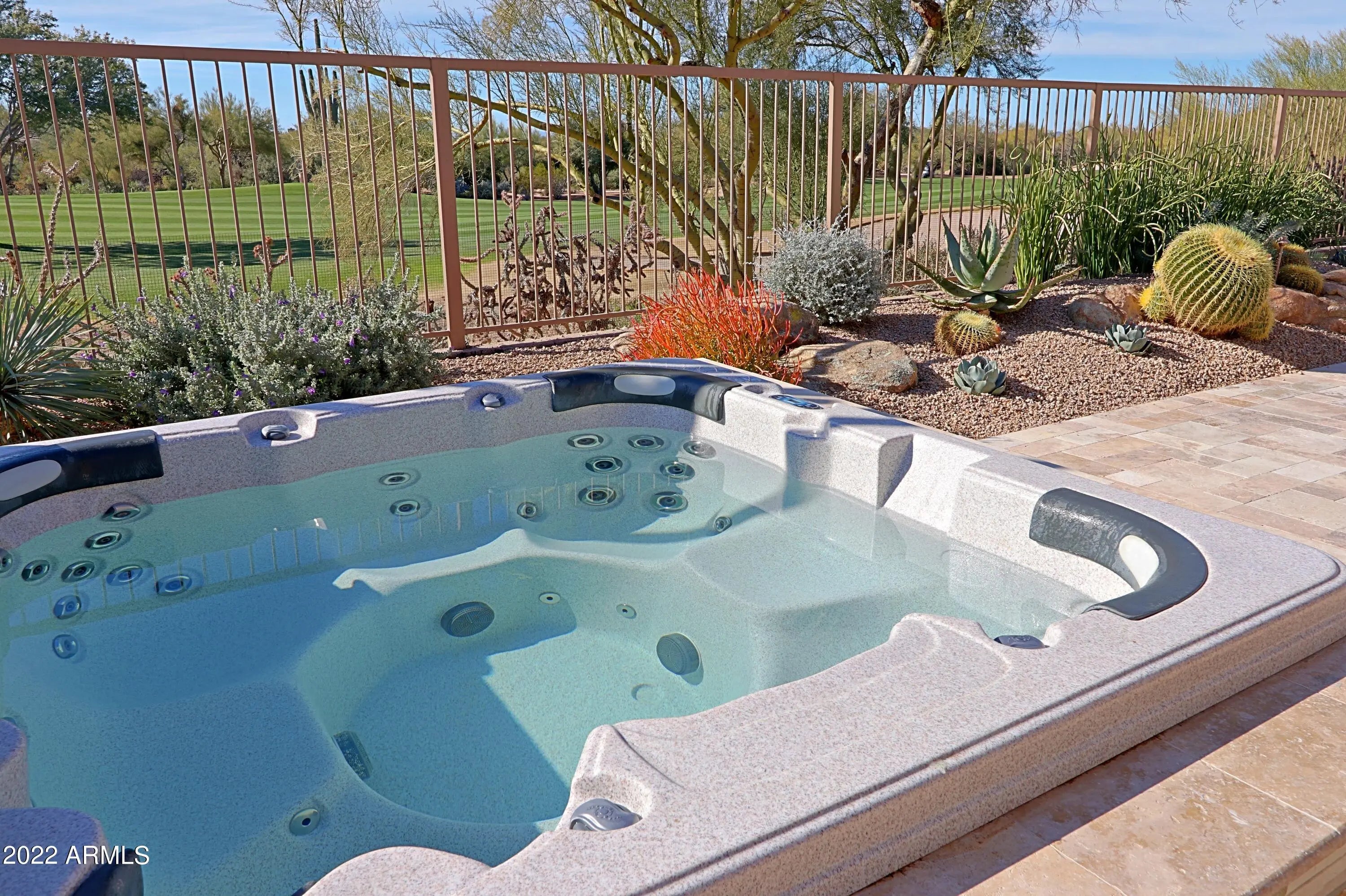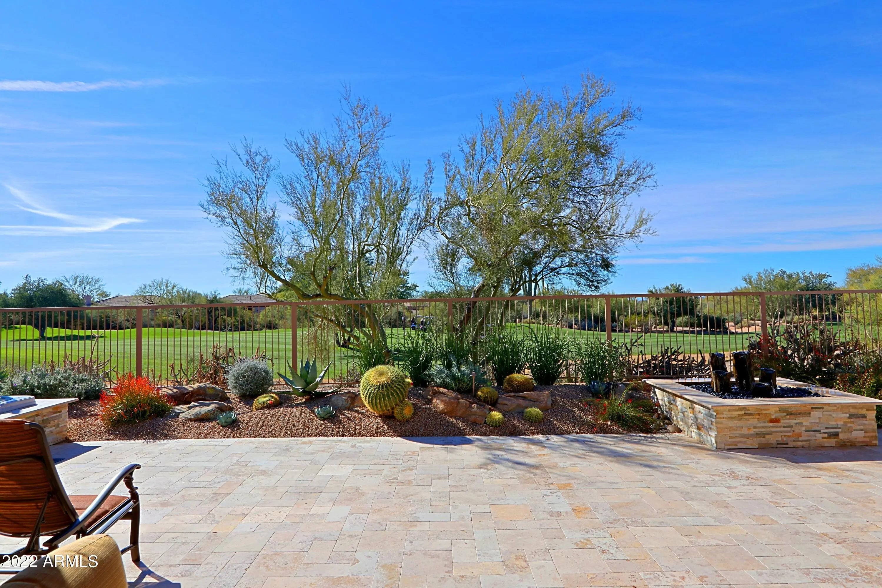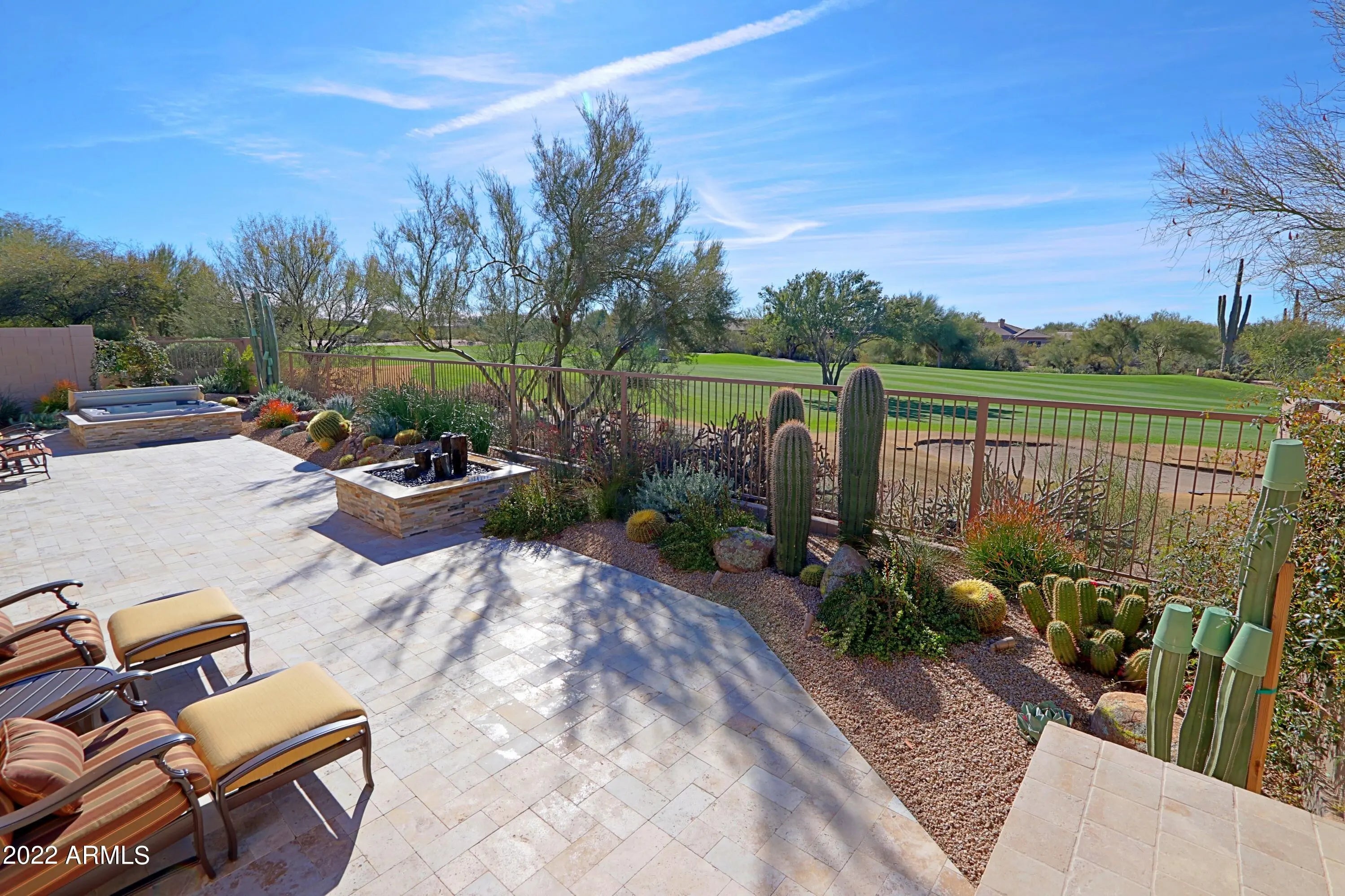 .The North/South exposure of this home, ideally situated midpoint on the 1st fairway, offers unobstructed views & open to natural open space. Enjoy beautiful sunsets framed by Black Mountain & The Boulders, while lounging in the spa, sitting by the fireplace or relaxing on the patio. The remodeled open floor plan is bright & spacious and offers a living room, dining room, family room w/fireplace and kitchen which opens to the breakfast nook. Dual master suites offer spacious bedrooms. A large den/study offers views to the charming front courtyard. Features throughout the home include stone flooring, Plantation shutters, quartz countertops and arched entryways. Minutes from the Terravita clubhouse, this community provides a country club lifestyle in Scottsdale Nort