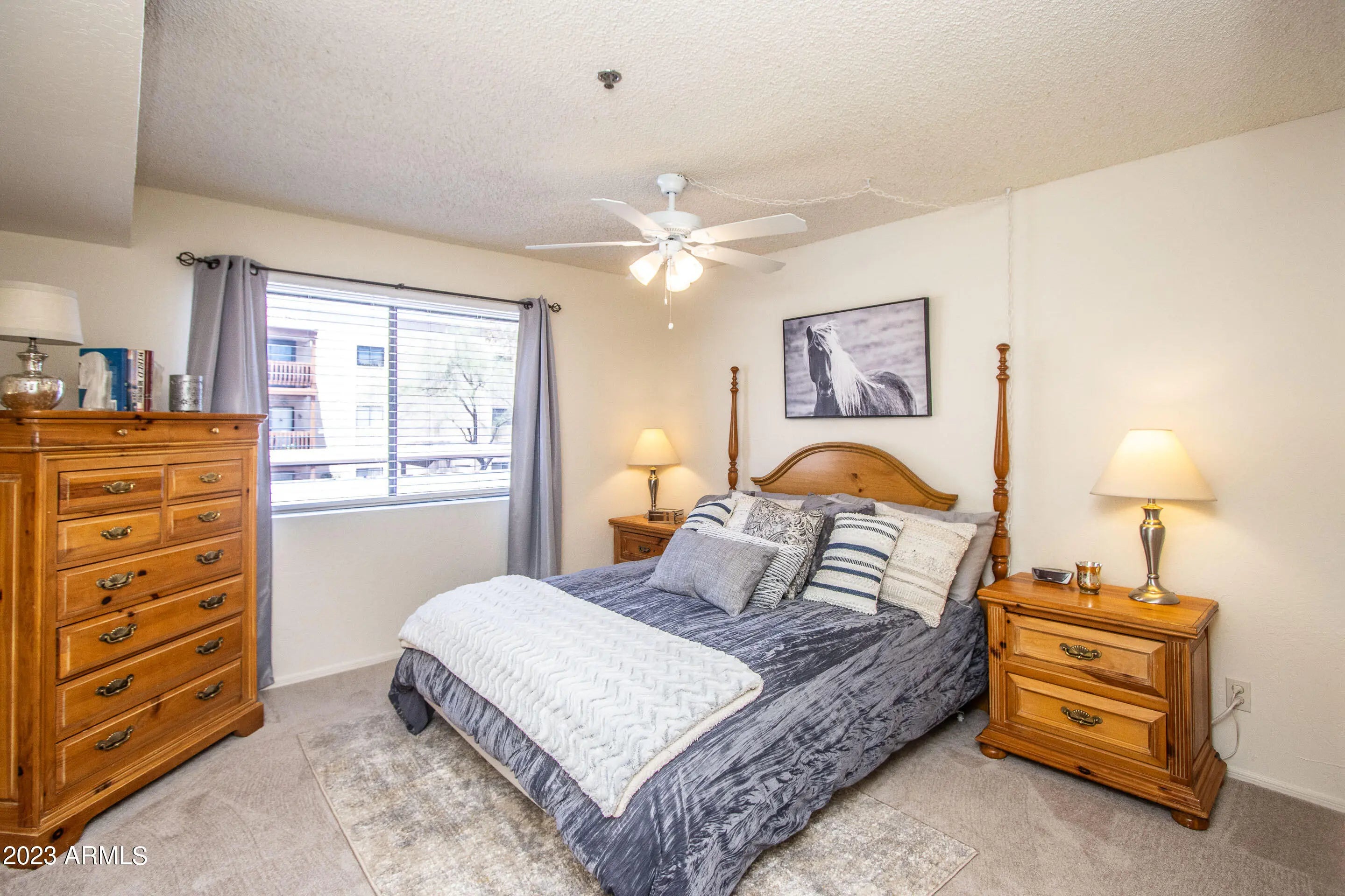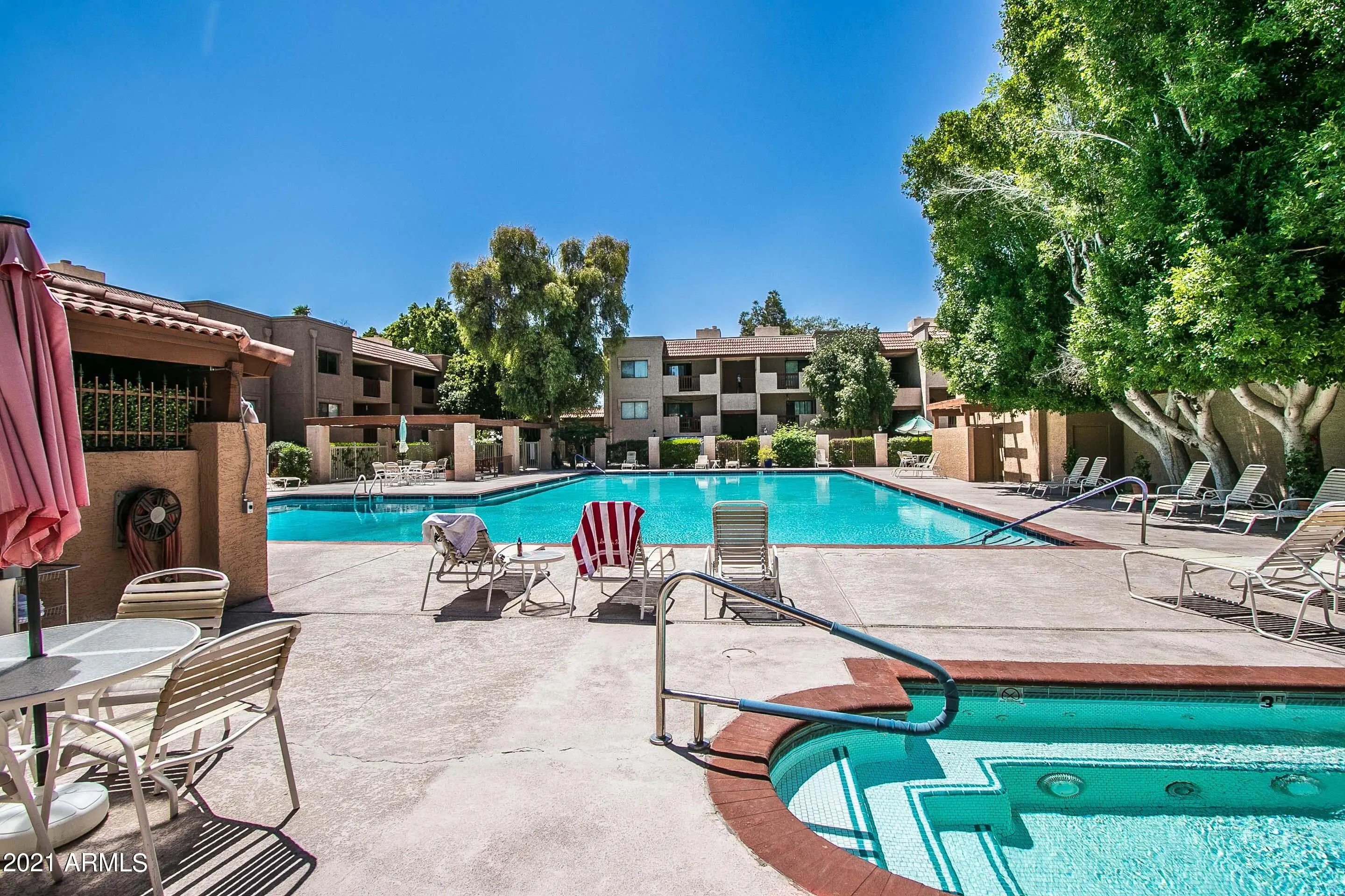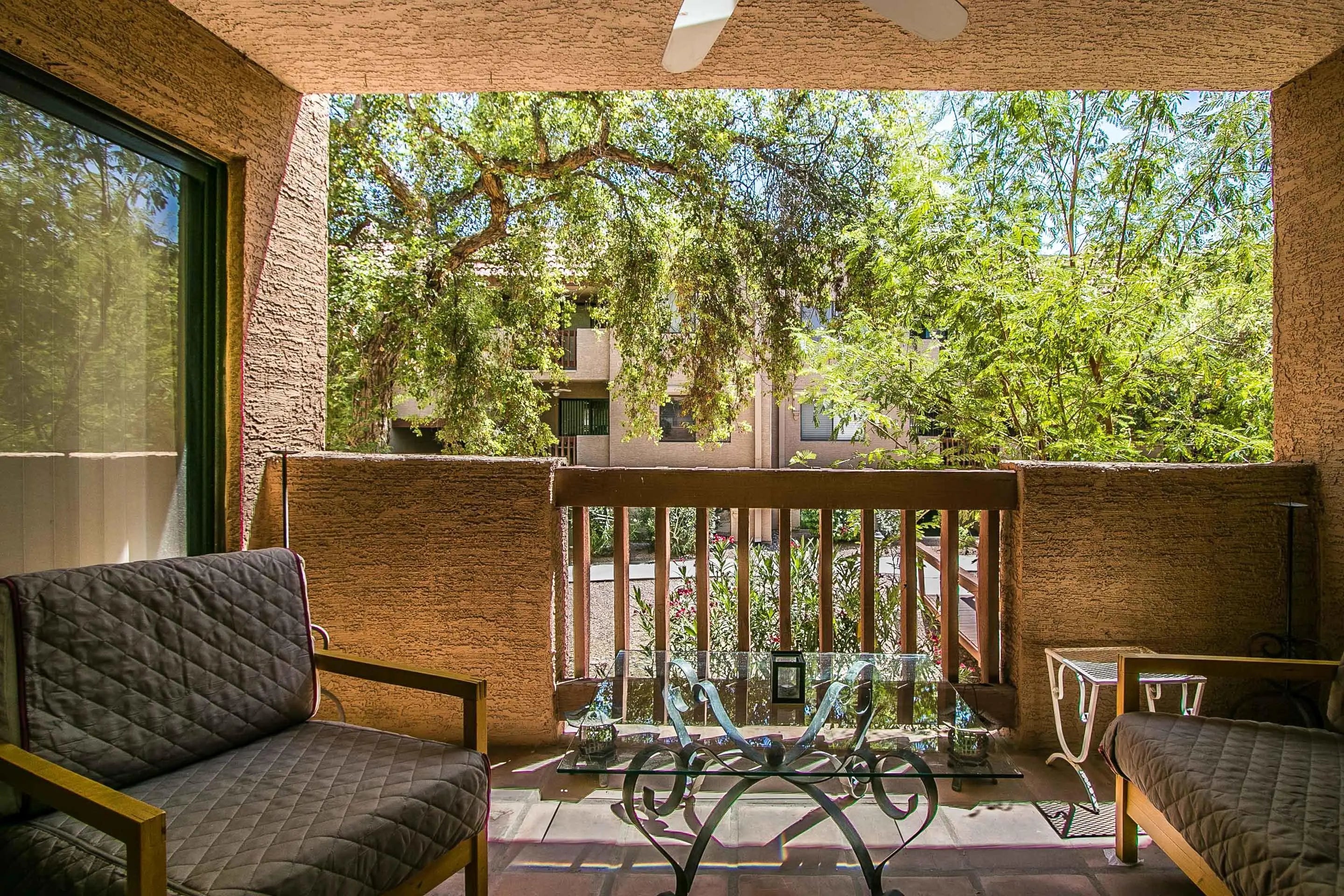 Nicely furnished second level unit has split floor plan, master with walk in closet and exit to balcony. Great room feel, wood burning fireplace for those cold winter nights. Separate storage area with plenty of room. Assigned covered parking. Coveted Old Town Scottsdale location - walking distance to galleries, shopping, restaurants and SF Giants spring training stadium. 15 minutes to airport and just a few from the 101. Gated community offers peaceful grounds with lush trees along the bridged walkways and amenities such as Olympic sized pool, heated pool, tennis & racquetball courts, lockers, BBQs, workout facility.