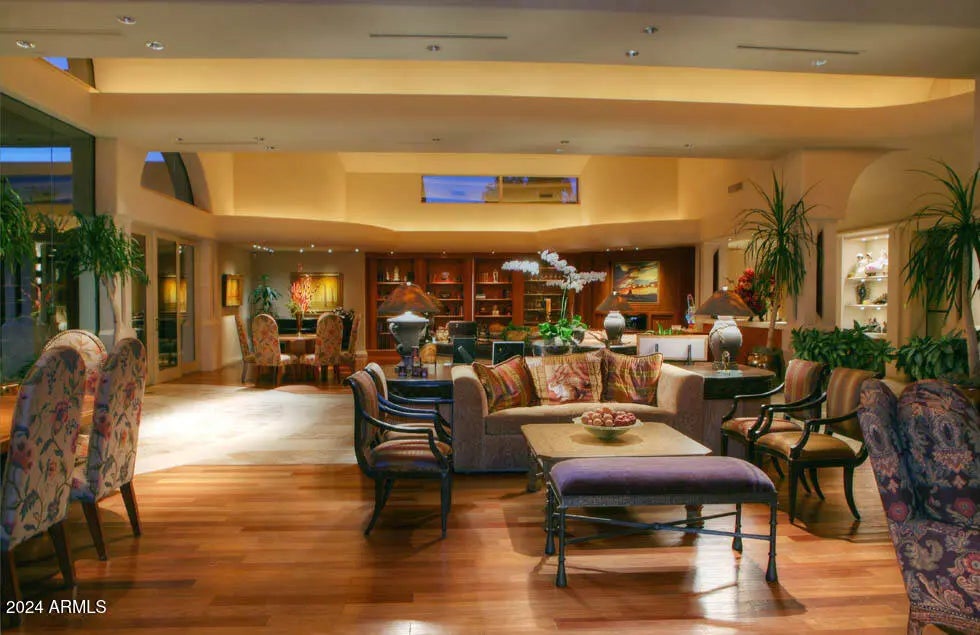 This phenomenal and timeless 1-Owner home was designed by Vernon Swaback, Architect and Apprentice to Frank Lloyd Wright. The resort-like grounds offer 1.668 AC and are located on an Estates Golf Course view lot. A truly majestic residence featuring a 2,100+ SF Great Room with a soaring angular skylight, recessed wet bar, Kitchen created for event catering, custom limestone columns and surfaces, copper details, 2 Powder rooms + hall 1/2 BA, Brazilian hand-scraped cherry floors, exceptional millwork, outstanding Master Suite & Spa room, wonderful study, workout room, TV/game room, all en suites plus a live-in/nanny wing. Meticulously built of steel framing and distinctive copper roofing, as well. Home is 12,503 SF livable and Guest house 863 SF. Priced at $493.79 PSF to allow for updating.
