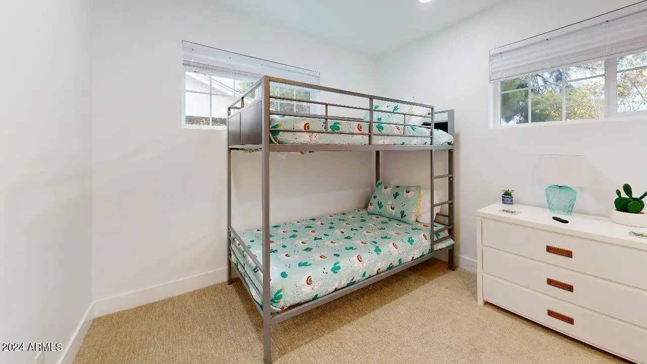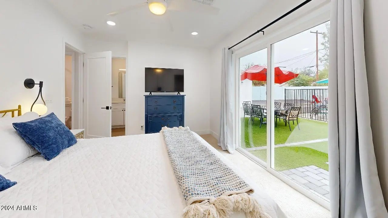 Located minutes from Arcadia, this remodeled 4-bedroom, 3-bathroom home boasts a 700 sq ft addition. The added wing features a primary bedroom with a walkout patio, an en-suite with double vanities, a spacious closet, and a walk-in shower. The open-concept living space includes a double waterfall quartz kitchen island, two-toned custom cabinets, vaulted ceilings, LG stainless steel appliances, and recessed lighting throughout. The split floor plan offers two primary bedrooms, each with sliding door access to the backyard and their own full bathrooms. Ready for immediate occupancy and conveniently located near dining, nightlife, Camelback Mountain, and Papago Park. Experience modern luxury and proximity to key amenities.