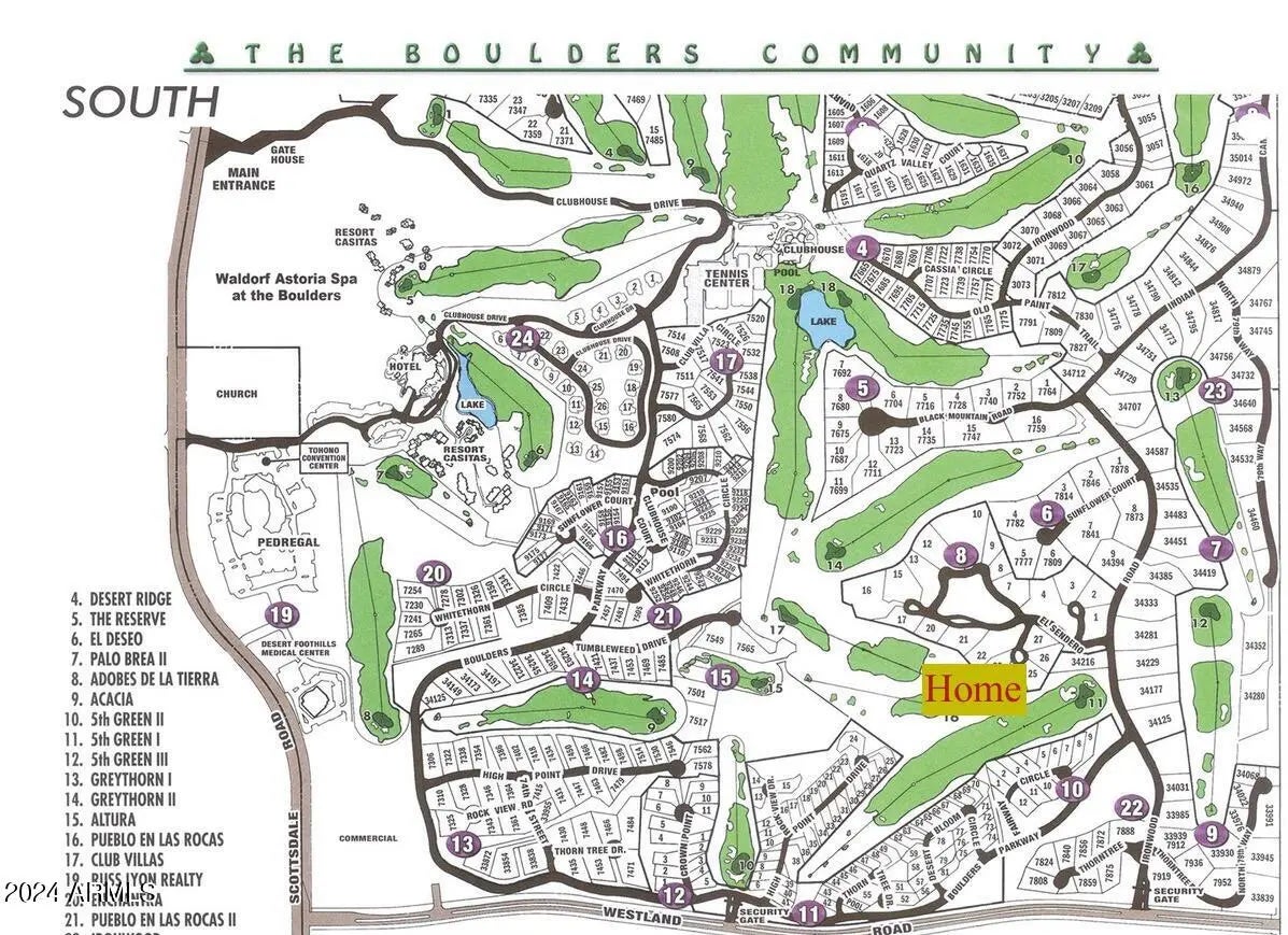 All new, high end furnishings package completed in 2024. Located on the 11th fairway of the Boulders North course. Amazing golf course and mountain views from the resort style backyard. Relax on the covered patio featuring outdoor gas fireplace, heated pool with water fountain feature. Additional pool features include a baja shelf with in pool seating and drink table (see photo) Single level home with 3 master suites, that all have attached bathrooms. Large open great room w/gas fireplace, down sectional with additional seating. Large, chefs kitchen, w/gas range, 2 sinks and breakfast bar. Large master suite w/private patio access, pool view & sitting area. Grand Master bath has walk tiled walk in shower, his/hers sinks, free standing soaking tub & walk- in closet. See ''more'' Separate den with shuffleboard, and lounge seating. Formal, and casual dining areas, and tile throughout. Guests will have access to all amenities of the Boulders resort, including world class spa, pickle ball, tennis, and golf. In addition there are 3 heated pools, casual and fine dining. Golf cart included for use around the neighborhood and resort.