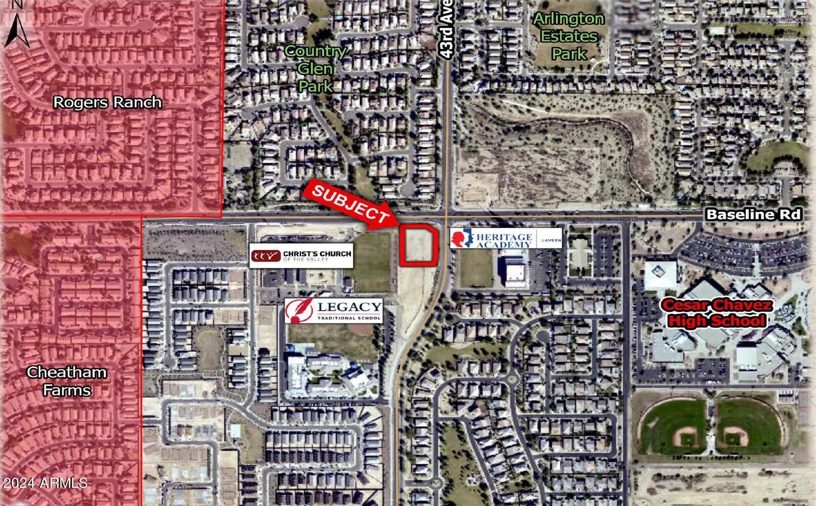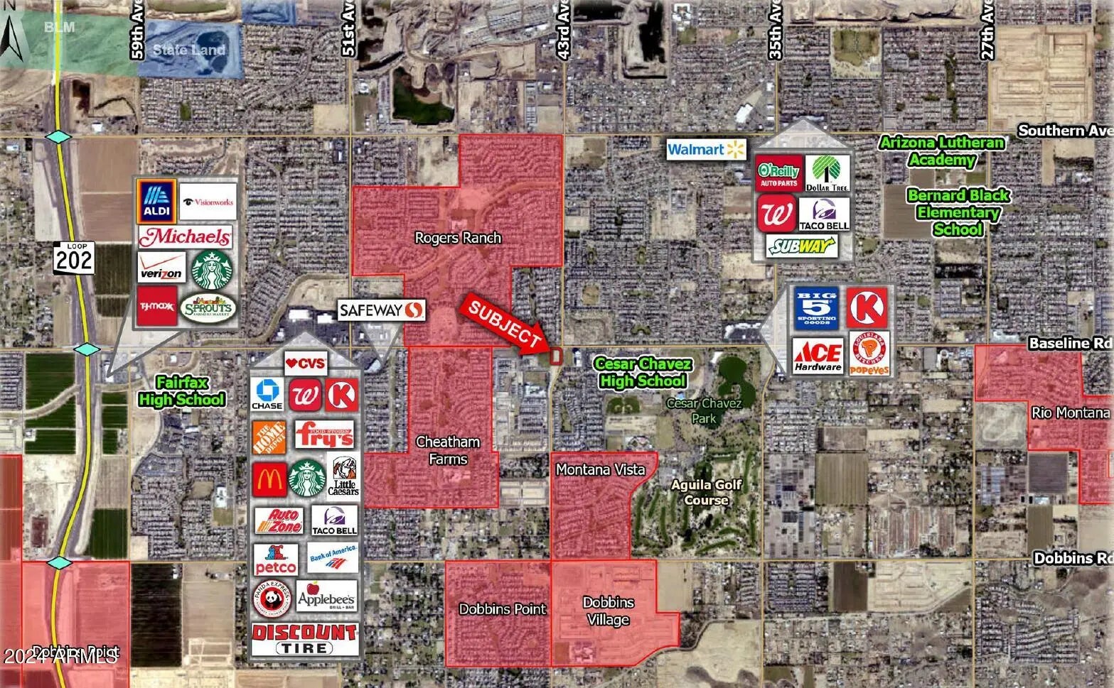 Great opportunity to own one of the last vacant commercial corners along Baseline Road in the fast-growing Laveen area of Phoenix. • Site is located just over two miles from the Loop 202 and Baseline Road interchange, which from a development standpoint is the most desirable interchange on the entire South Mountain Freeway. • Strong demographics in the immediate area, and daily traffic counts at the 43rd Avenue & Baseline Road intersection exceed 53,000 VPD (ESRI)