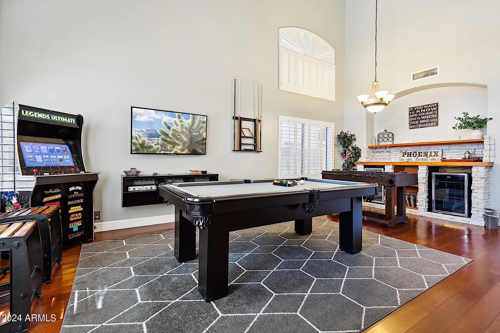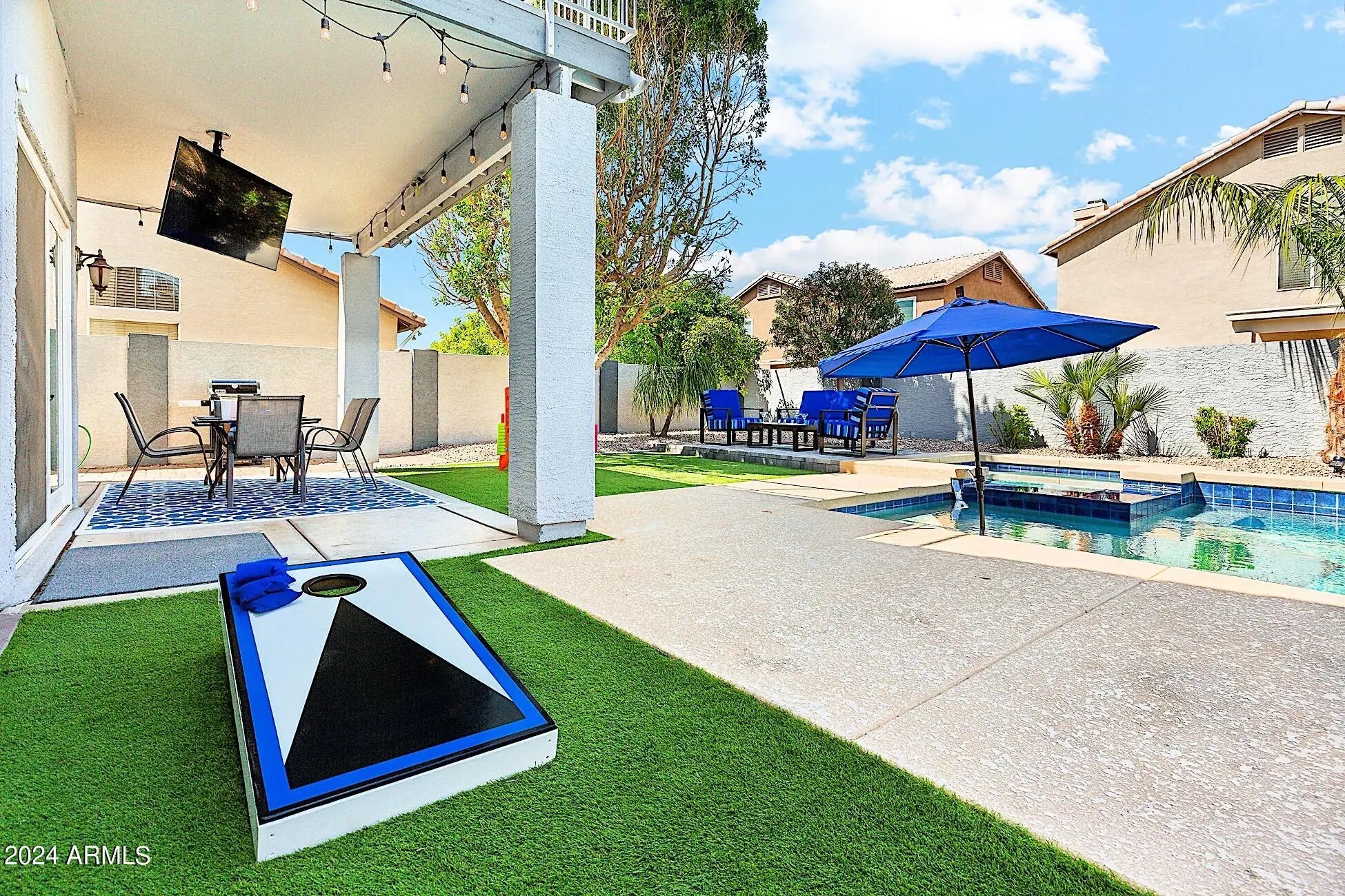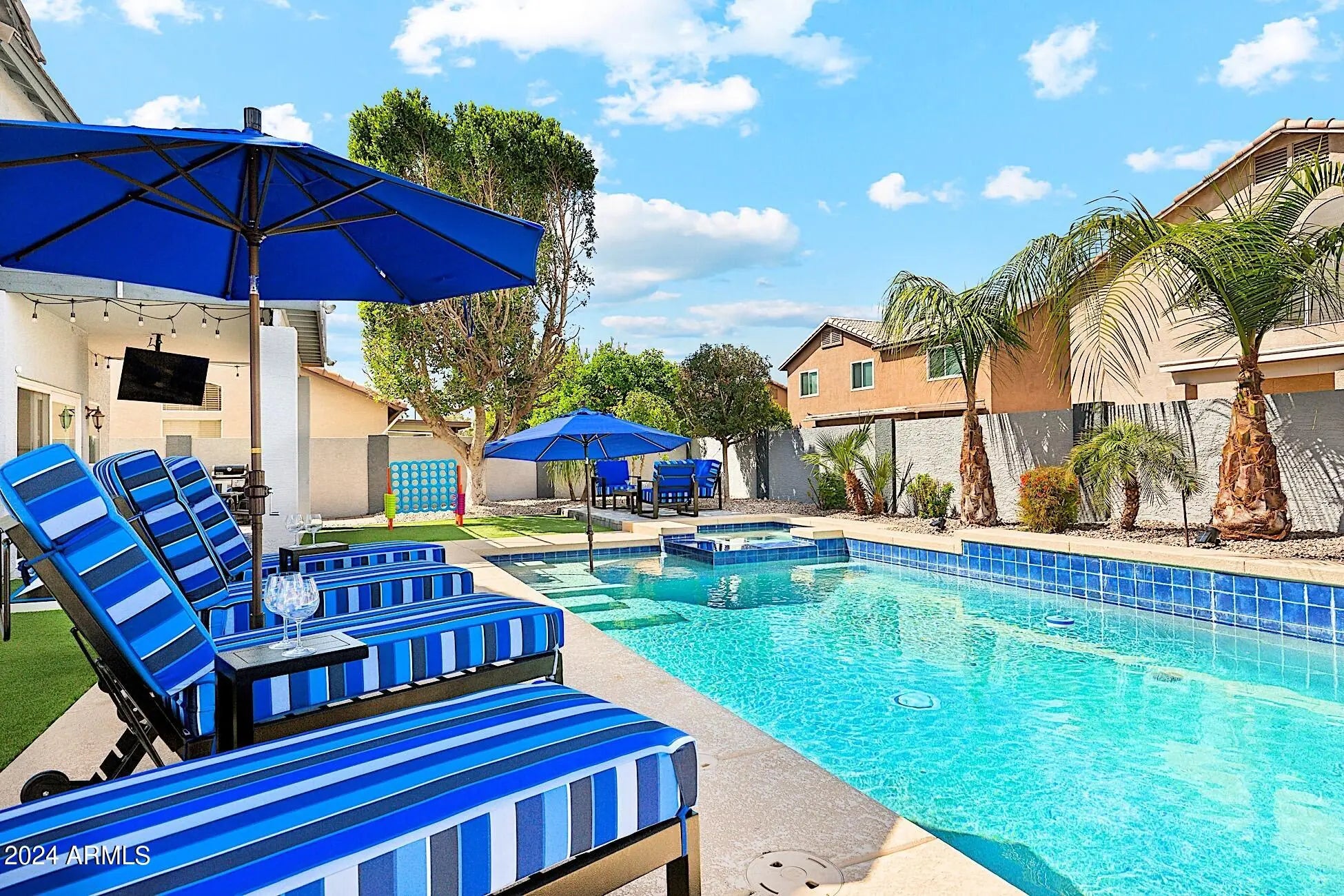 Fully Furnished, Short-Term Rental. Seasonal Rates Apply. Rent Ranges from $5000.00 a month in Summer to $10,000.00 a month in Winter/Spring. Inquire for details and pricing! 5 Bedrooms, 2.5 bathrooms. Private, heated pool and spa. Great entertainer's backyard! Plush sun loungers. A mounted 55'' Smart TV faces the pool so guests can watch a game, a movie or enjoy music videos while taking a dip in the pool or unwinding in the hot tub! Comfy conversation set next to a shaded tree. Giant Connect 4 Game for family fun! Outdoor dining table seats 6 under the covered patio. Propane BBQ grill. Upper terrace w/ sun lounger and bistro set. Game Room inside that includes a billiard table, foosball table and a bar!