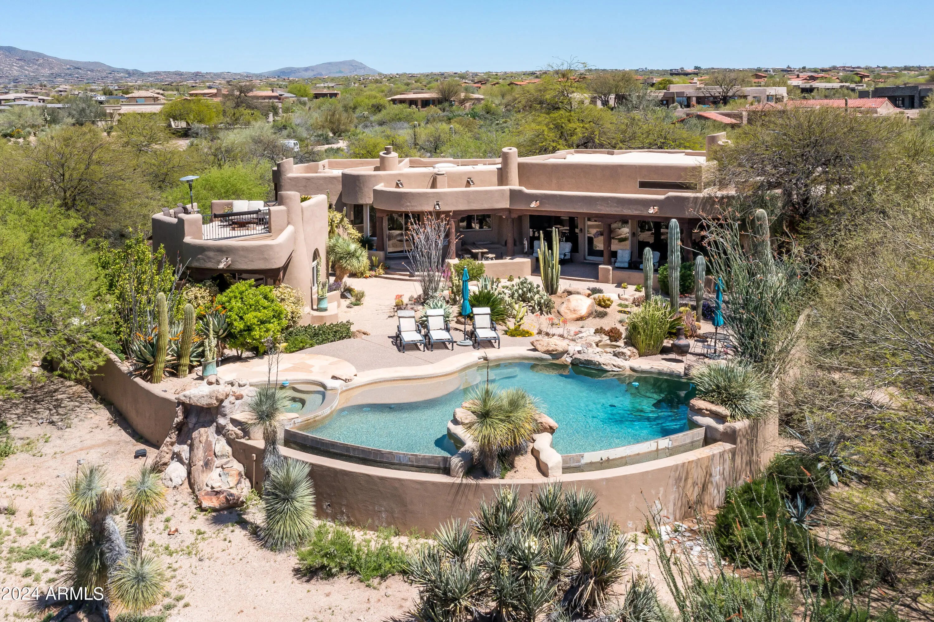 Rustic Southwest style home located behind the 3rd hole of the Renegade Golf course in desert mountain. 4 Beds , 4.5 bath + office. Three beds and office in main house and a separate guest casita with a upper deck to see the the city lights and down valley views. Beds: 2 Kings size beds, 1 queen and 2 twins with a sleeper sofa in the office. Some furniture has been changed out . New photos will be coming soon