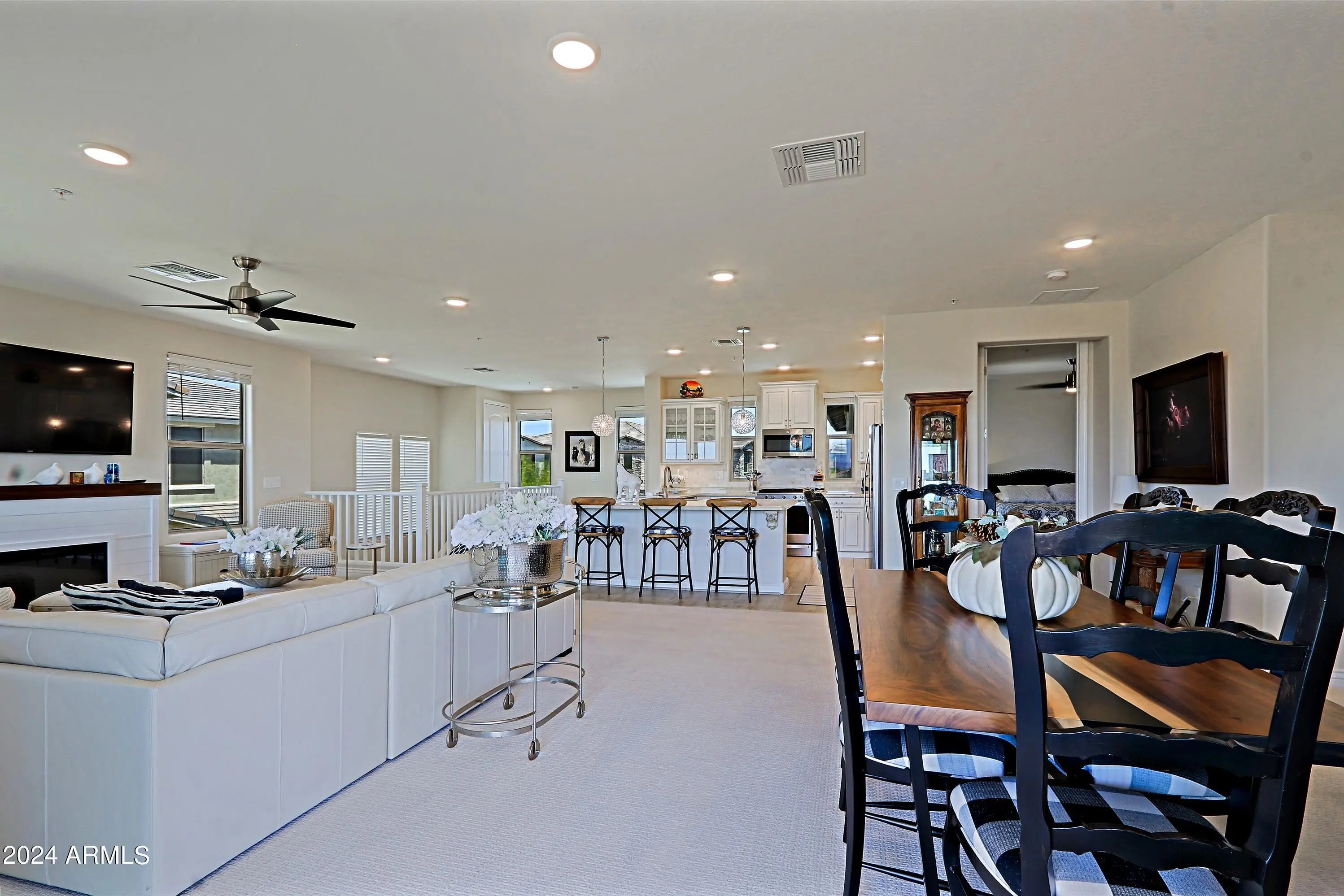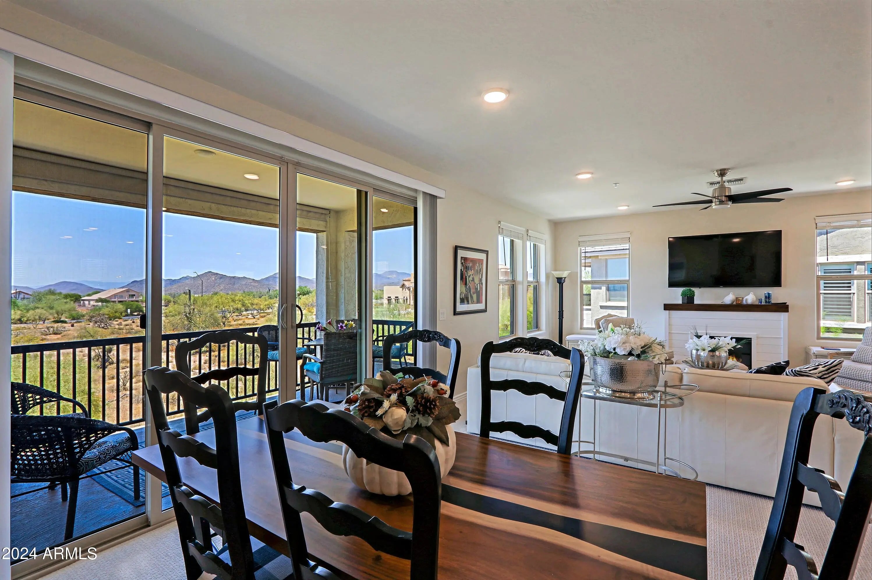 AVAILABLE FOR THE 2025 SEASON. ALLOCATED IN HIGH SONORAN DESERT WITH LUSH DESERT LANDSCAPING AND MOUNTAIN AND DESERT VIEWS. GATED COMMUNITY WITH COMMUNITY NIGHT LIGHTING. TWO BEDROOM/TWO BATH/DEN. LEVEL UPPER UNIT WITH TWO CAR GARAGE. Beautifully appointed home with open areas. Great room with fireplace; sliding doors to lighted patio/balcony. Formal dining room, designer kitchen with granite island and glass upper cabinetry, beverage cooler, gas stove. Primary bedroom spacious with walk-in closet and bathroom has large walk-in shower, dual vanities and large mirror. Second bedroom has bath with single vanity and tub/shower combo. Den with wonderful views. Laundry room with cabinets. Home has Smart Home features and Energy saving features. Amentites include barbecues, fire pit and fitness center. Perfect unit for enjoying Arizona at its best! Community Amenities: Pool: Enjoy the community pool, perfect for a refreshing dip. Workout Facility: Stay active with the on-site fitness center. Proximity to Nature: Take advantage of nearby hiking trails for outdoor adventures. Bright and Quiet: The unit is filled with natural light.