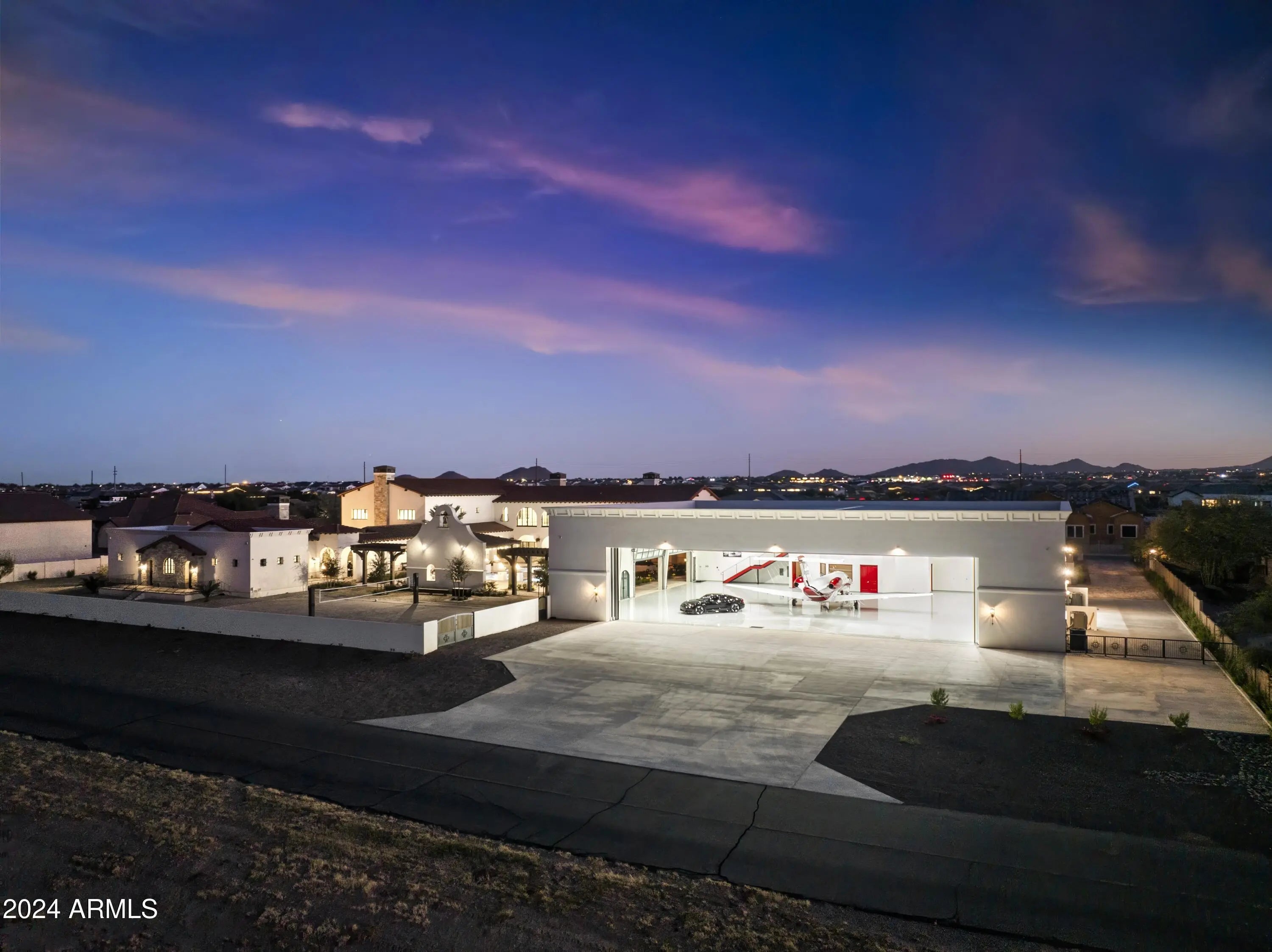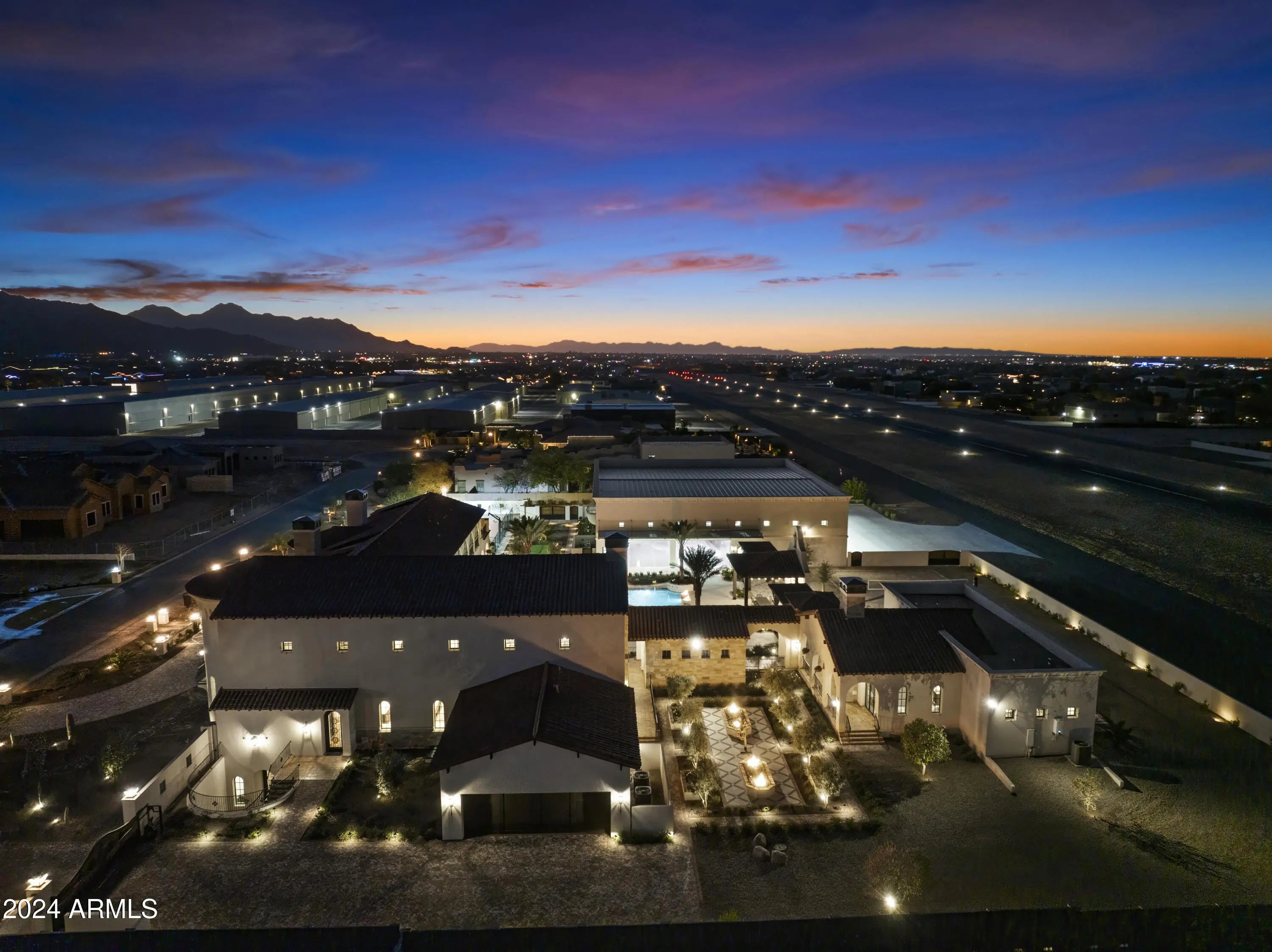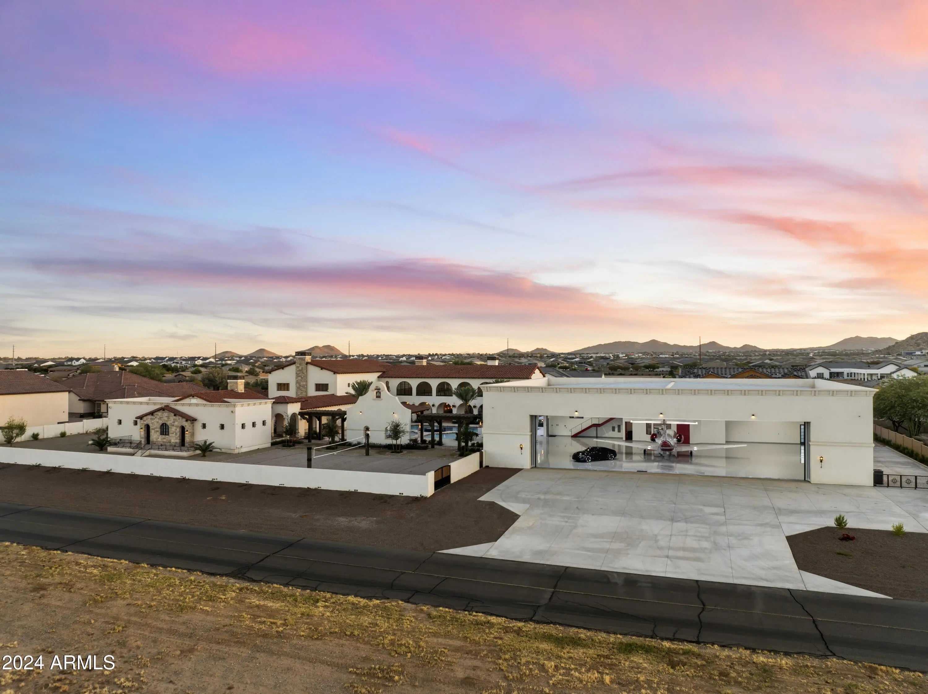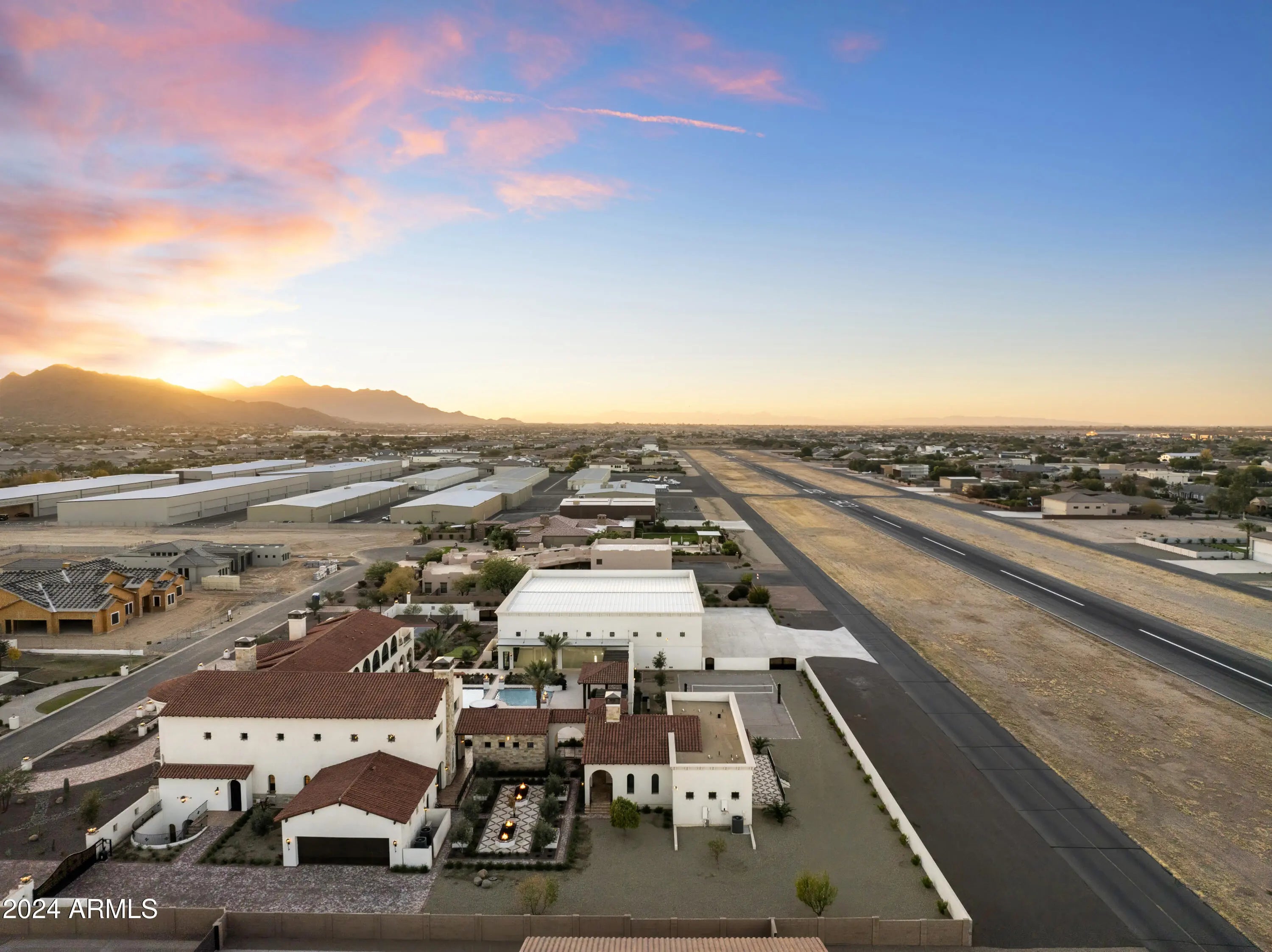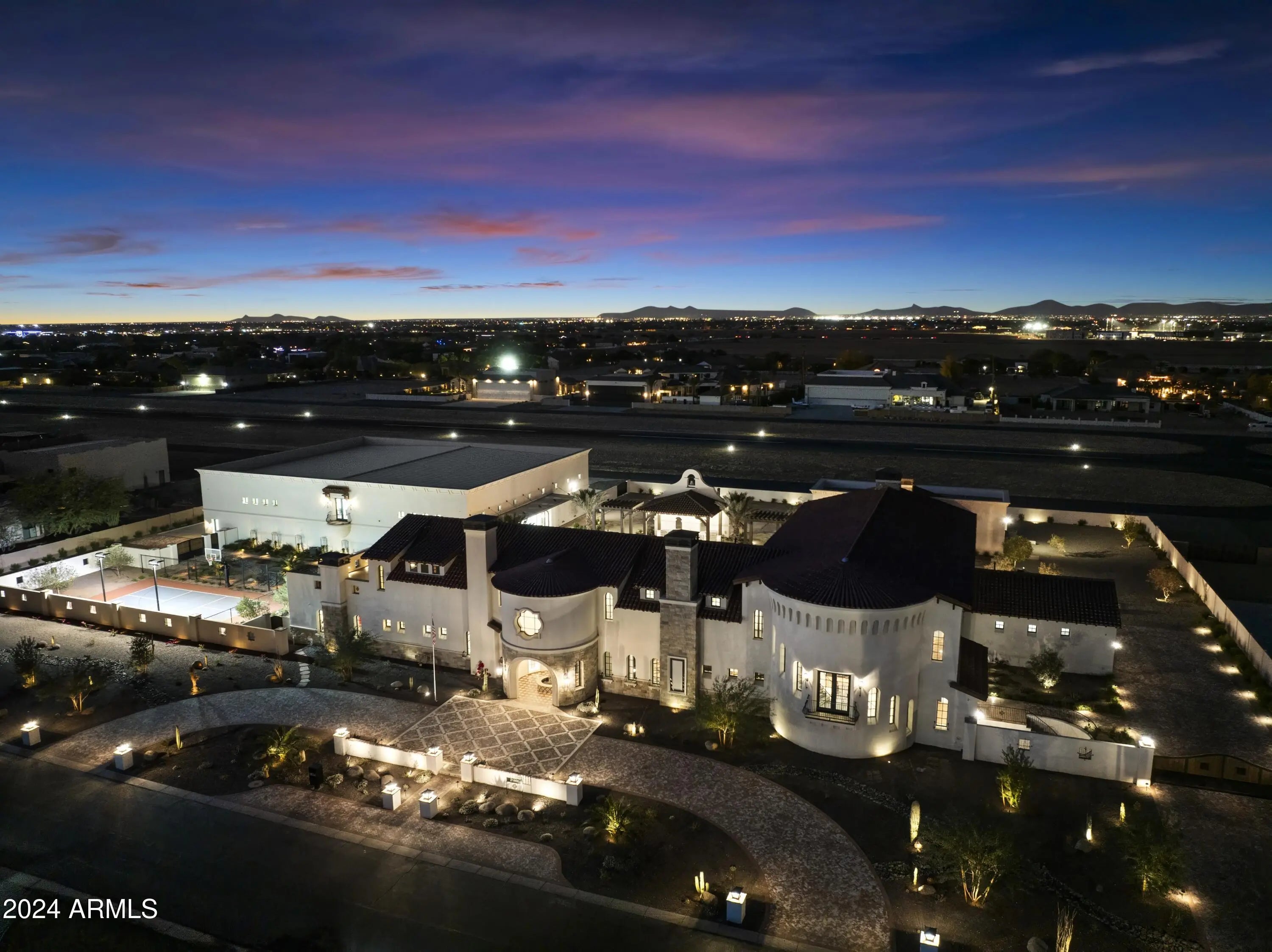 Introducing Misión Veintidós (Mission Twenty-two). This amazing Pegasus Airpark (5AZ3), Queen Creek, AZ home was inspired by classic Spanish style mission architecture. The unique mission style entrance to the home is through a breezeway gate which leads you to a stunning courtyard view of the estate. This estate of 32,000 sq ft of luxury living, with an incredible 26,000+ sq ft of conditioned space has 16'' thick walls for style and maximum efficiency. Perfectly situated on North South double lot, taking a massive 350' of taxiway, sits the main residence on three levels and includes all these features: A 10,000 sq ft steel construction Hangar with Full HVAC, Epoxy coated floor, ''Big Ass'' Fan, Pocket style main hangar doors with an 78'x17' clear opening. Flight office, Storage room, Downstairs bathroom, Interior stairs to mezzanine with bar, Upstairs bathroom, Balcony, Two motorized vertical opening 20 ft glass garage style doors facing the courtyard. " A massive courtyard featuring: 2,000 feet of covered breezeways, Multiple swimming pools with fountains and firepots, Covered outdoor full kitchen under a mission style bell tower, Lit Pickle ball/basketball sports court & Putting green, Sand Volleyball court. "The main house has a 5,000 sq ft Basement: bowling alley, 75 ft shooting range, Tiger Woods' (Full Swing Pro 2.0) Golf Simulator, Wine Cellar, Walk-in vault, Storage room, Bathroom, Interior and exterior stairs. " Next is a 2000+ sq ft detached Master Bedroom: Custom his and her walk-in closets, Separate bathrooms and linens, Large walk-in shower & separate tub, Incredible ceiling details with accent lighting, Multiple balconies, Bar, Fireplace, sliding doors. " Master Spanish Garden: with water and fire features. " General Design considerations: 16" double insulated walls which are quieter, more energy efficient and style correct as seen in the deep-set windows and doors, The extensive iron work is amazing, Custom railing with HH monogram, windows with iron details. " Don't miss these details: clear view elevator from basement to second story sized for wheelchair access. " Wired Cameras access from internet. " Automated lighting. " Security System " Hidden AV closet " Luxury full-service guest suites with spa like bathrooms, suites include laundry and bar in each " 2834 sq ft 2nd Story with Gym, spa and sauna, gym bathrooms & laundry. " Large outdoor balcony, firepit, incredible views of the Superstition and San Tan mountains " Balcony sliding windows overlooking the courtyard. " Firepole slide down from gym to first floor hidden door " Formal living room " 30' sliding glass doors with view of hangar " 28' ceiling with massive beams " Oversize castle style fireplace " Gourmet kitchen with Baking center " Sub Zero Wolf appliances, Easy access from vehicle to kitchen, Fully equipped Butler's Pantry. Dark and smokey (informal sitting room) " Floor level gas fireplace " Full bar " Bathroom " Large sliding window overlooking courtyard pool. Too many features to list.