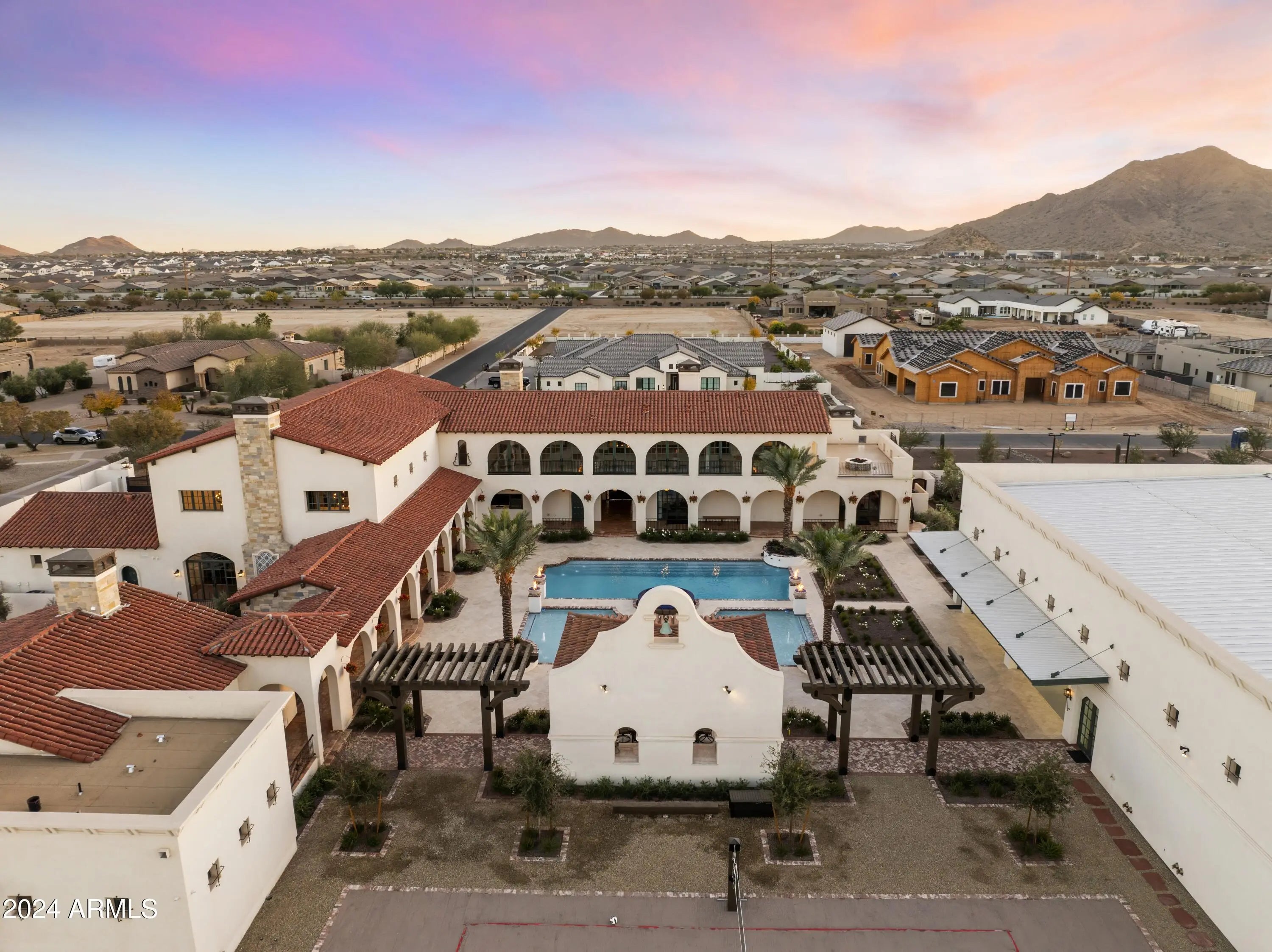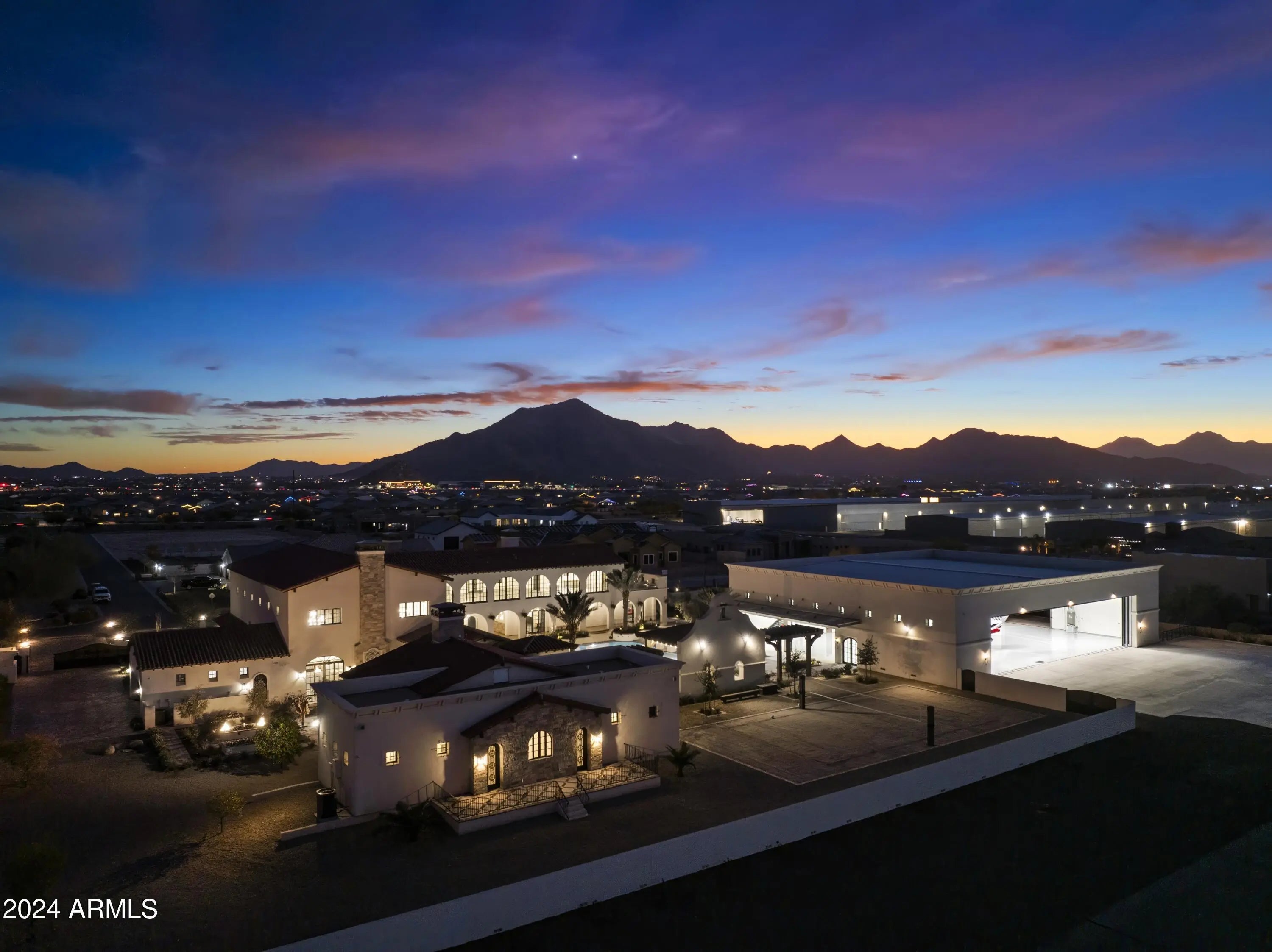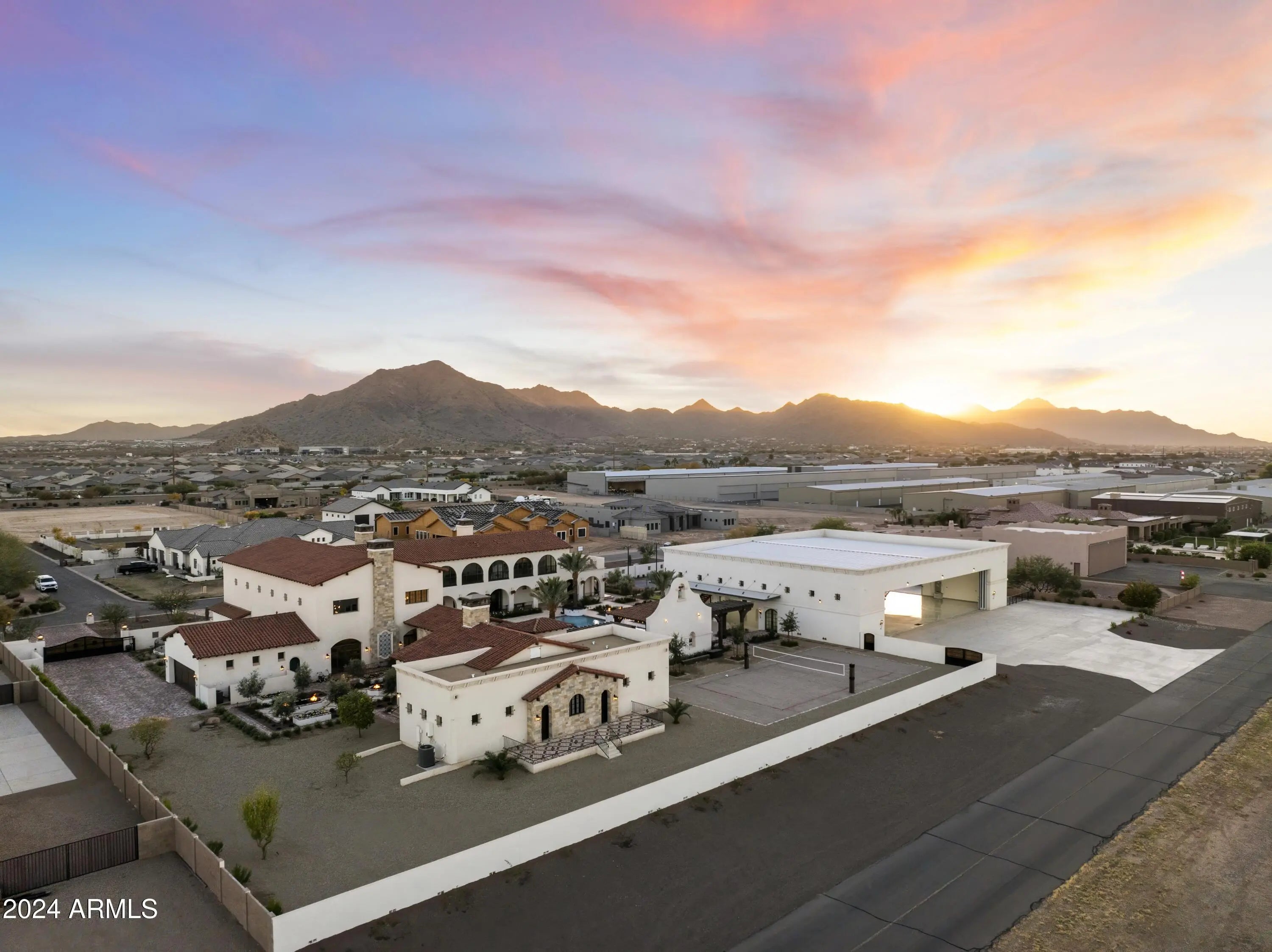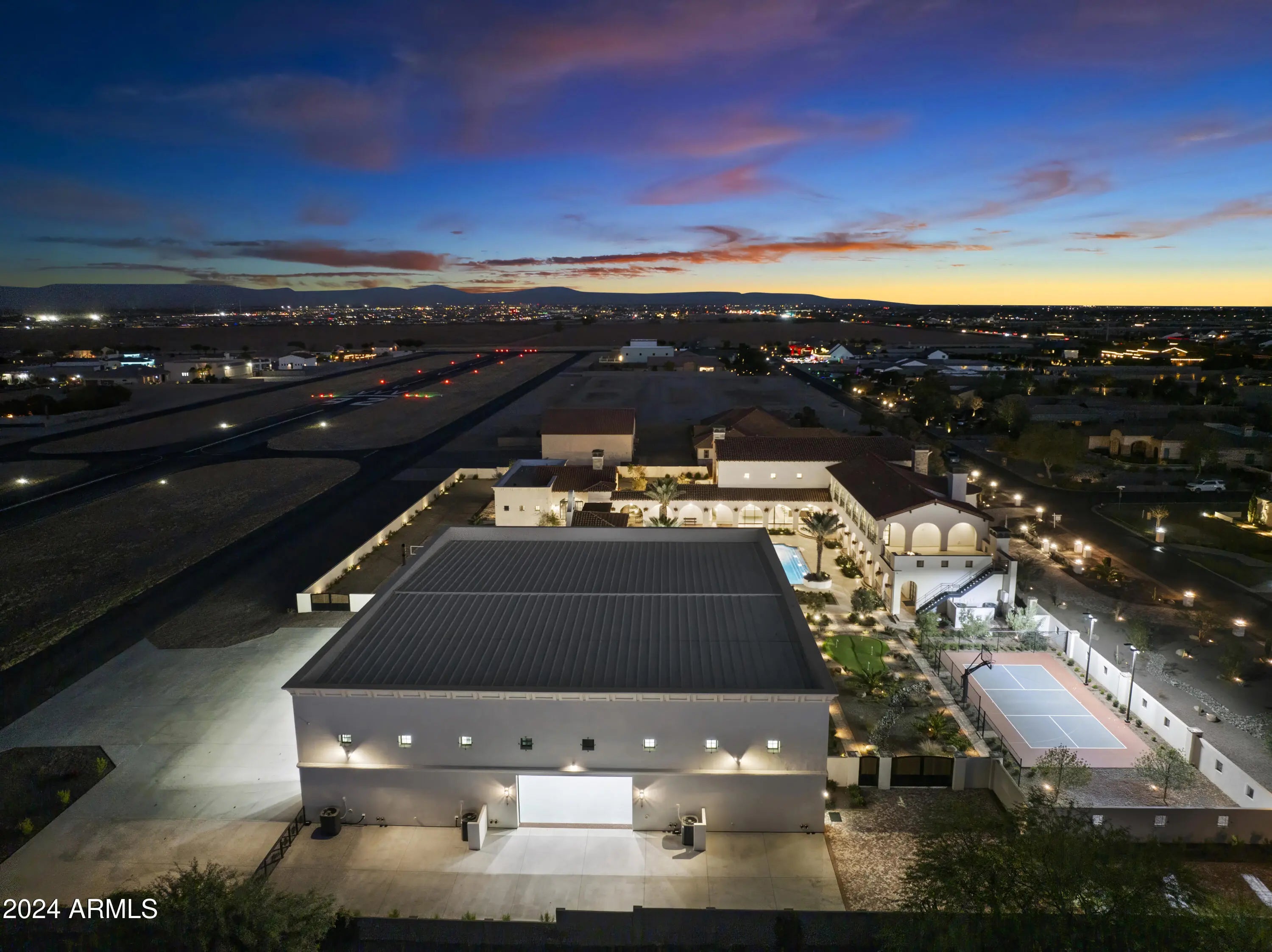 Introducing Misión Veintidós (Mission Twenty-two). This amazing Pegasus Airpark (5AZ3), Queen Creek, AZ home was inspired by classic Spanish style mission architecture. The unique mission style entrance to the home is through a breezeway gate which leads you to a stunning courtyard view of the estate. This estate of 32,000 sq ft of luxury living, with an incredible 26,000+ sq ft of conditioned space has 16'' thick walls for style and maximum efficiency. Perfectly situated on North South double lot, taking a massive 350' of taxiway, sits the main residence on three levels and includes all these features: A 10,000 sq ft steel construction Hangar with Full HVAC, Epoxy coated floor, ''Big Ass'' Fan, Pocket style main hangar doors with an 78'x17' clear opening. Flight office, Storage room, Downstairs bathroom, Interior stairs to mezzanine with bar, Upstairs bathroom, Balcony, Two motorized vertical opening 20 ft glass garage style doors facing the courtyard. " A massive courtyard featuring: 2,000 feet of covered breezeways, Multiple swimming pools with fountains and firepots, Covered outdoor full kitchen under a mission style bell tower, Lit Pickle ball/basketball sports court & Putting green, Sand Volleyball court. "The main house has a 5,000 sq ft Basement: bowling alley, 75 ft shooting range, Tiger Woods' (Full Swing Pro 2.0) Golf Simulator, Wine Cellar, Walk-in vault, Storage room, Bathroom, Interior and exterior stairs. " Next is a 2000+ sq ft detached Master Bedroom: Custom his and her walk-in closets, Separate bathrooms and linens, Large walk-in shower & separate tub, Incredible ceiling details with accent lighting, Multiple balconies, Bar, Fireplace, sliding doors. " Master Spanish Garden: with water and fire features. " General Design considerations: 16" double insulated walls which are quieter, more energy efficient and style correct as seen in the deep-set windows and doors, The extensive iron work is amazing, Custom railing with HH monogram, windows with iron details. " Don't miss these details: clear view elevator from basement to second story sized for wheelchair access. " Wired Cameras access from internet. " Automated lighting. " Security System " Hidden AV closet " Luxury full-service guest suites with spa like bathrooms, suites include laundry and bar in each " 2834 sq ft 2nd Story with Gym, spa and sauna, gym bathrooms & laundry. " Large outdoor balcony, firepit, incredible views of the Superstition and San Tan mountains " Balcony sliding windows overlooking the courtyard. " Firepole slide down from gym to first floor hidden door " Formal living room " 30' sliding glass doors with view of hangar " 28' ceiling with massive beams " Oversize castle style fireplace " Gourmet kitchen with Baking center " Sub Zero Wolf appliances, Easy access from vehicle to kitchen, Fully equipped Butler's Pantry. Dark and smokey (informal sitting room) " Floor level gas fireplace " Full bar " Bathroom " Large sliding window overlooking courtyard pool. Too many features to list.