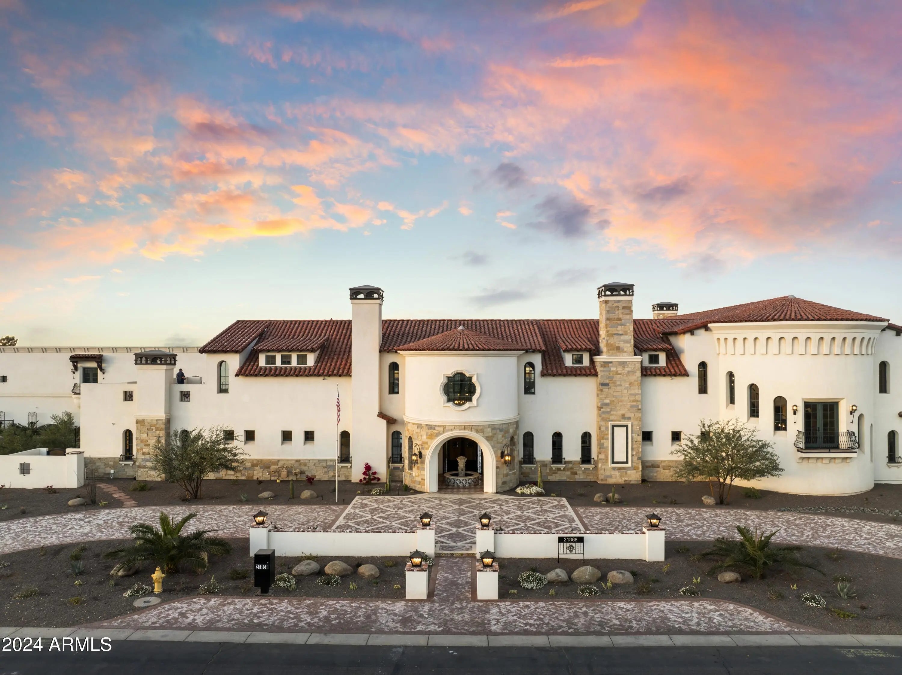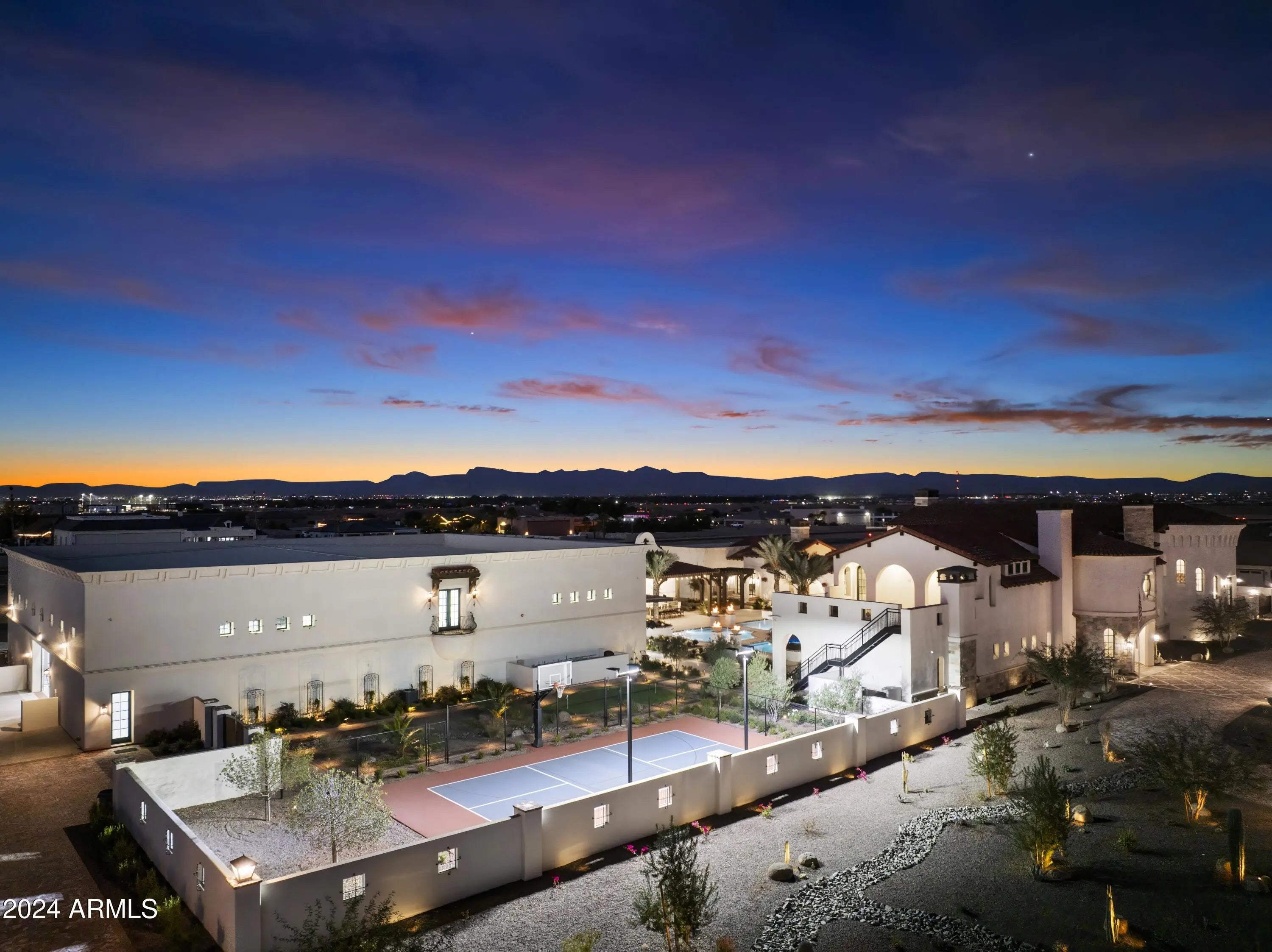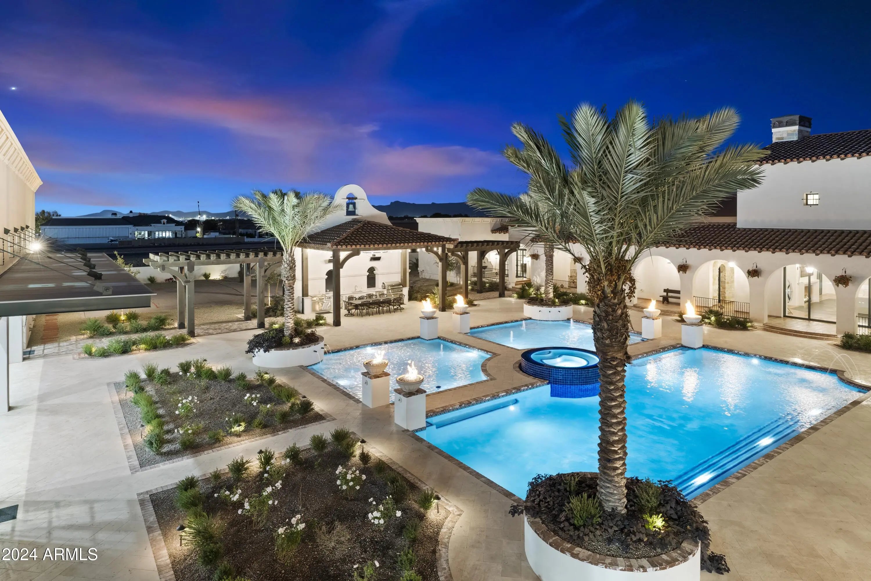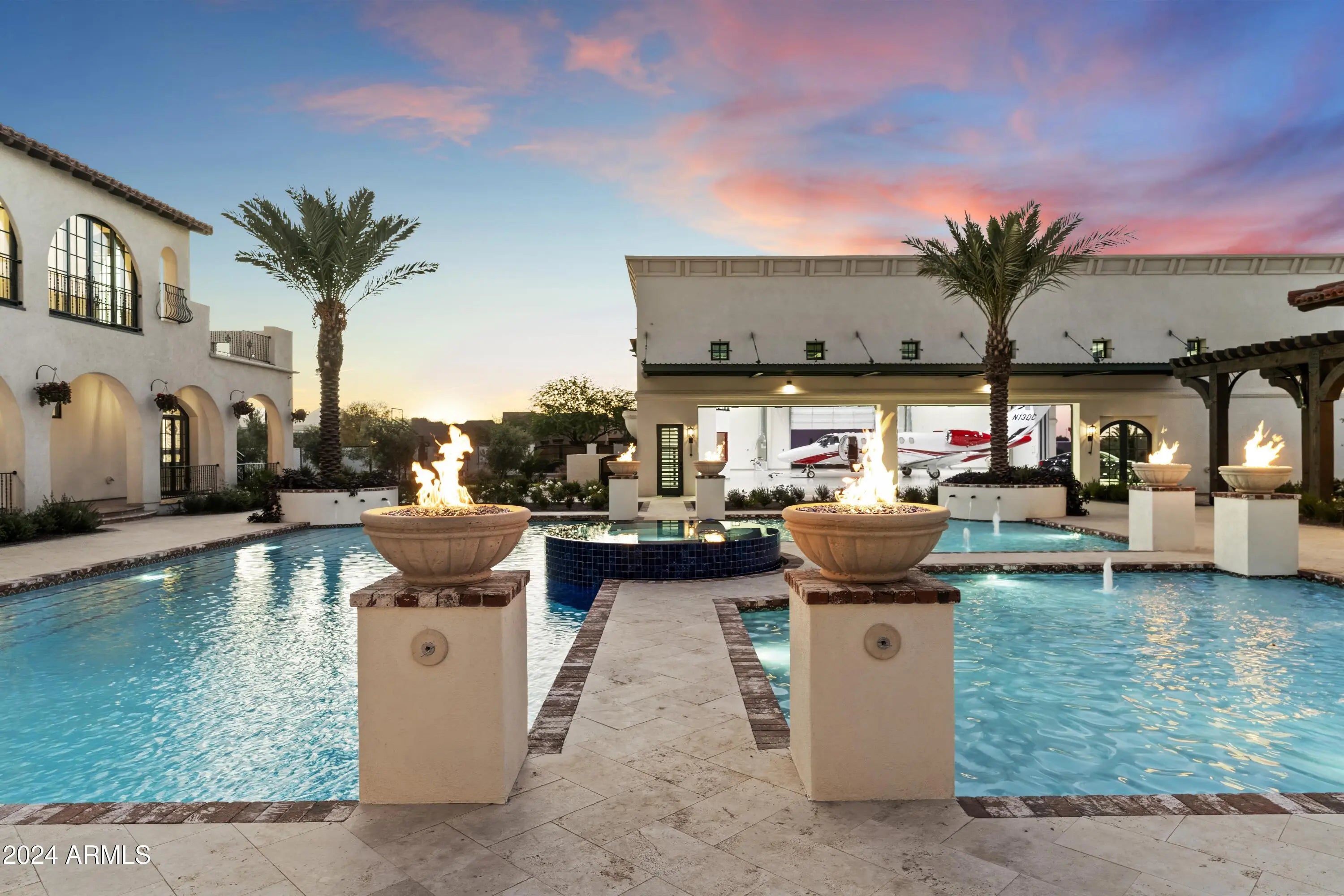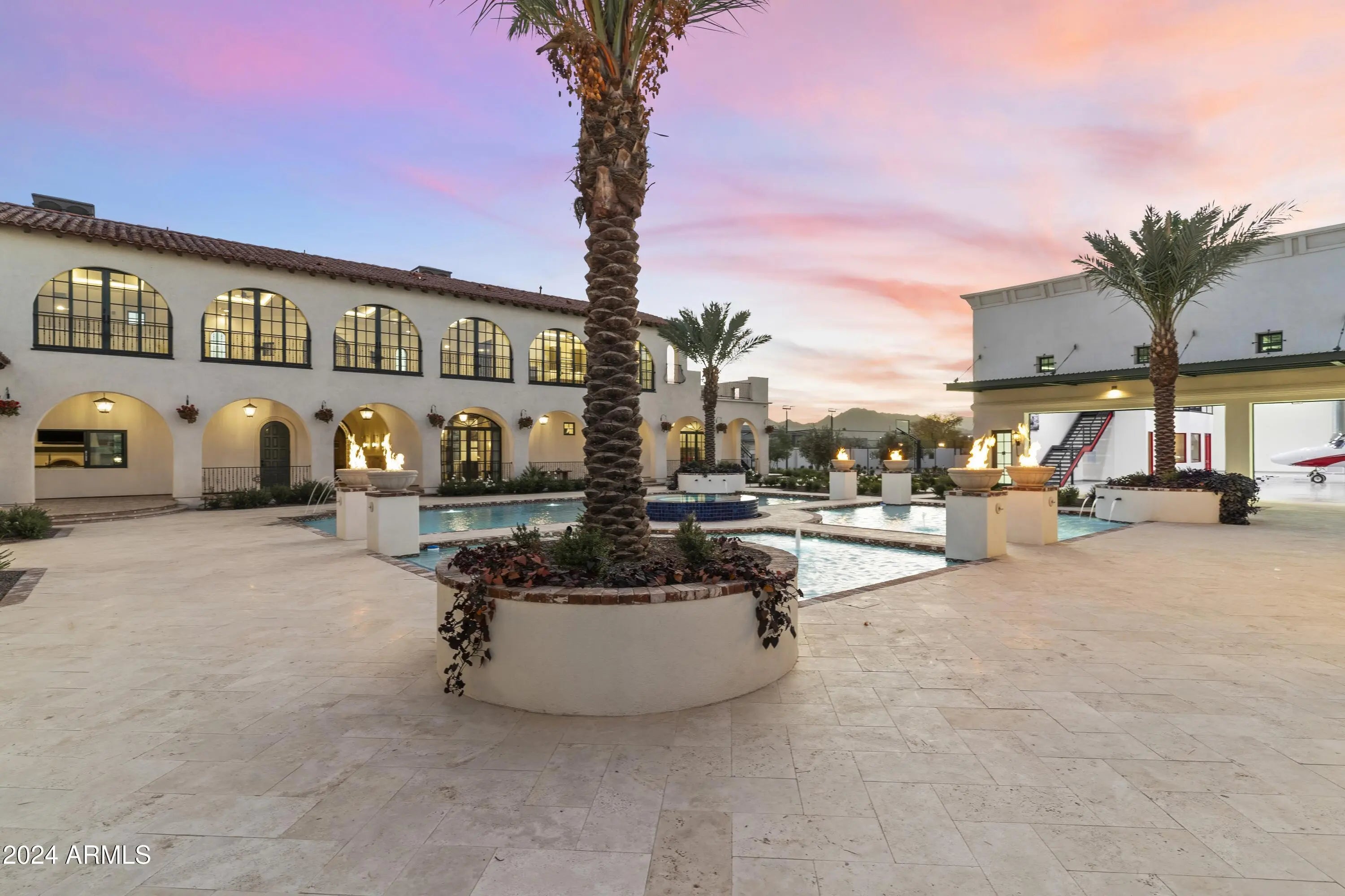 Introducing Misión Veintidós (Mission Twenty-two). This amazing Pegasus Airpark (5AZ3), Queen Creek, AZ home was inspired by classic Spanish style mission architecture. The unique mission style entrance to the home is through a breezeway gate which leads you to a stunning courtyard view of the estate. This estate of 32,000 sq ft of luxury living, with an incredible 26,000+ sq ft of conditioned space has 16'' thick walls for style and maximum efficiency. Perfectly situated on North South double lot, taking a massive 350' of taxiway, sits the main residence on three levels and includes all these features: A 10,000 sq ft steel construction Hangar with Full HVAC, Epoxy coated floor, ''Big Ass'' Fan, Pocket style main hangar doors with an 78'x17' clear opening. Flight office, Storage room, Downstairs bathroom, Interior stairs to mezzanine with bar, Upstairs bathroom, Balcony, Two motorized vertical opening 20 ft glass garage style doors facing the courtyard. " A massive courtyard featuring: 2,000 feet of covered breezeways, Multiple swimming pools with fountains and firepots, Covered outdoor full kitchen under a mission style bell tower, Lit Pickle ball/basketball sports court & Putting green, Sand Volleyball court. "The main house has a 5,000 sq ft Basement: bowling alley, 75 ft shooting range, Tiger Woods' (Full Swing Pro 2.0) Golf Simulator, Wine Cellar, Walk-in vault, Storage room, Bathroom, Interior and exterior stairs. " Next is a 2000+ sq ft detached Master Bedroom: Custom his and her walk-in closets, Separate bathrooms and linens, Large walk-in shower & separate tub, Incredible ceiling details with accent lighting, Multiple balconies, Bar, Fireplace, sliding doors. " Master Spanish Garden: with water and fire features. " General Design considerations: 16" double insulated walls which are quieter, more energy efficient and style correct as seen in the deep-set windows and doors, The extensive iron work is amazing, Custom railing with HH monogram, windows with iron details. " Don't miss these details: clear view elevator from basement to second story sized for wheelchair access. " Wired Cameras access from internet. " Automated lighting. " Security System " Hidden AV closet " Luxury full-service guest suites with spa like bathrooms, suites include laundry and bar in each " 2834 sq ft 2nd Story with Gym, spa and sauna, gym bathrooms & laundry. " Large outdoor balcony, firepit, incredible views of the Superstition and San Tan mountains " Balcony sliding windows overlooking the courtyard. " Firepole slide down from gym to first floor hidden door " Formal living room " 30' sliding glass doors with view of hangar " 28' ceiling with massive beams " Oversize castle style fireplace " Gourmet kitchen with Baking center " Sub Zero Wolf appliances, Easy access from vehicle to kitchen, Fully equipped Butler's Pantry. Dark and smokey (informal sitting room) " Floor level gas fireplace " Full bar " Bathroom " Large sliding window overlooking courtyard pool. Too many features to list.