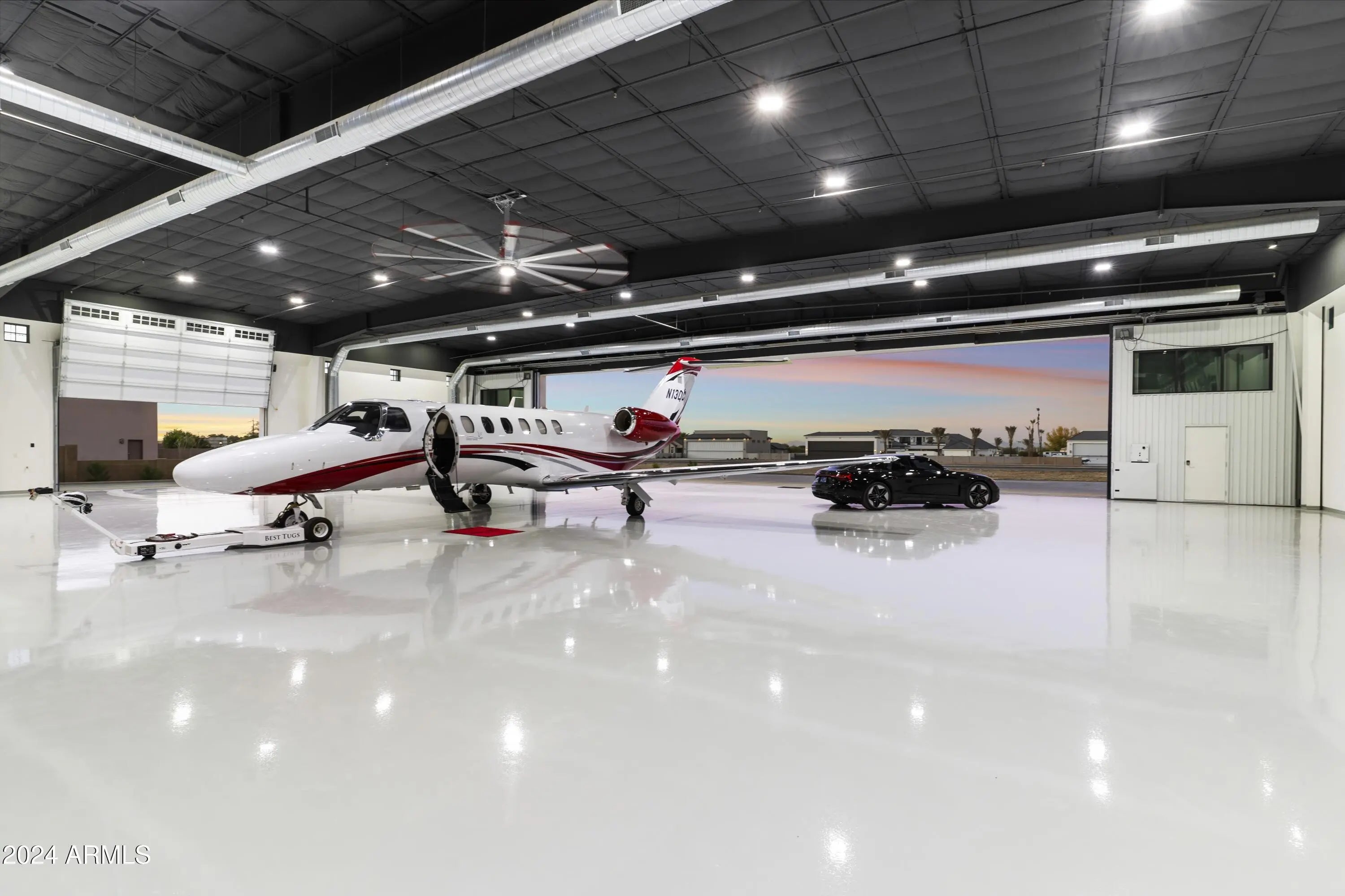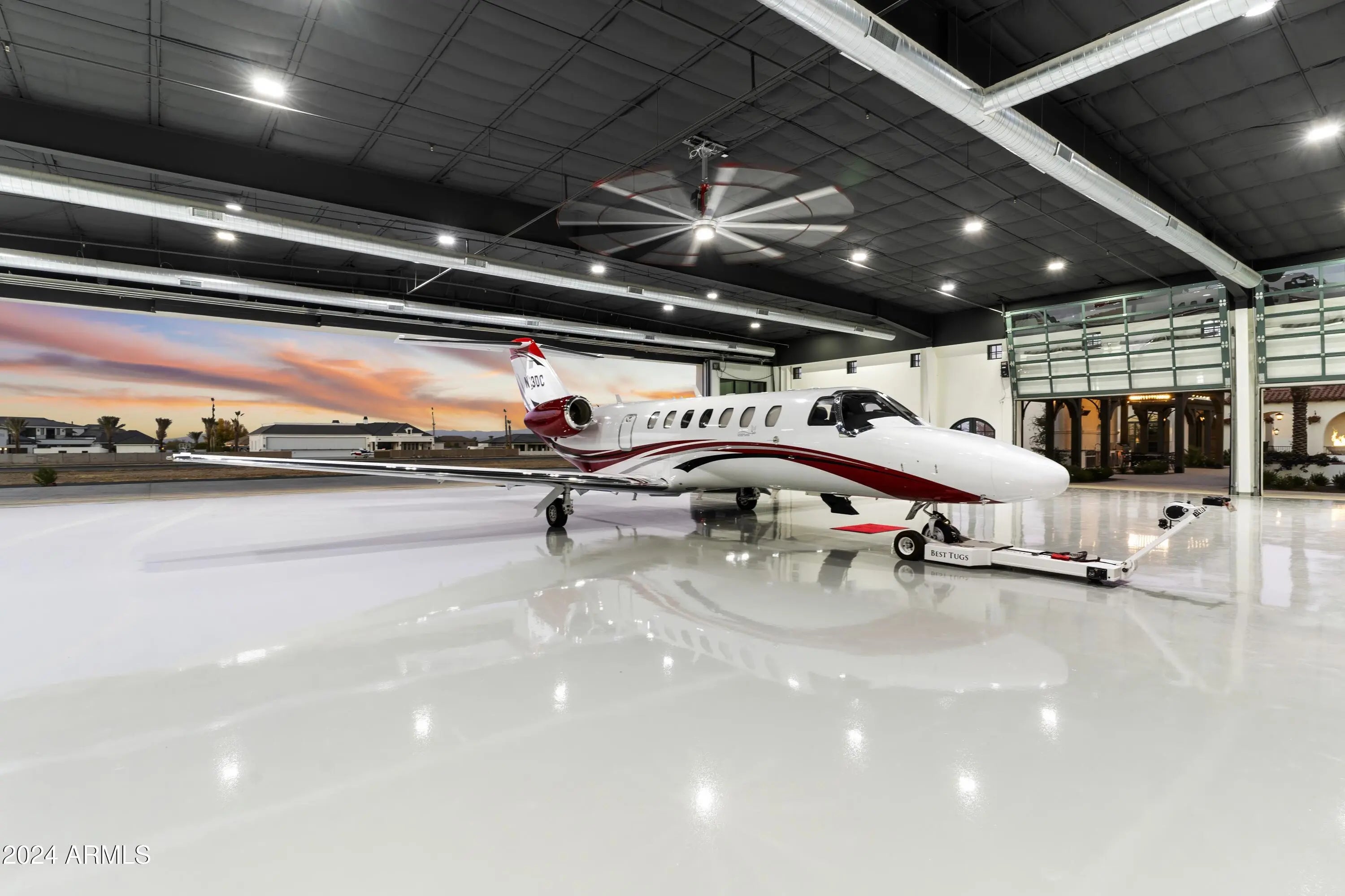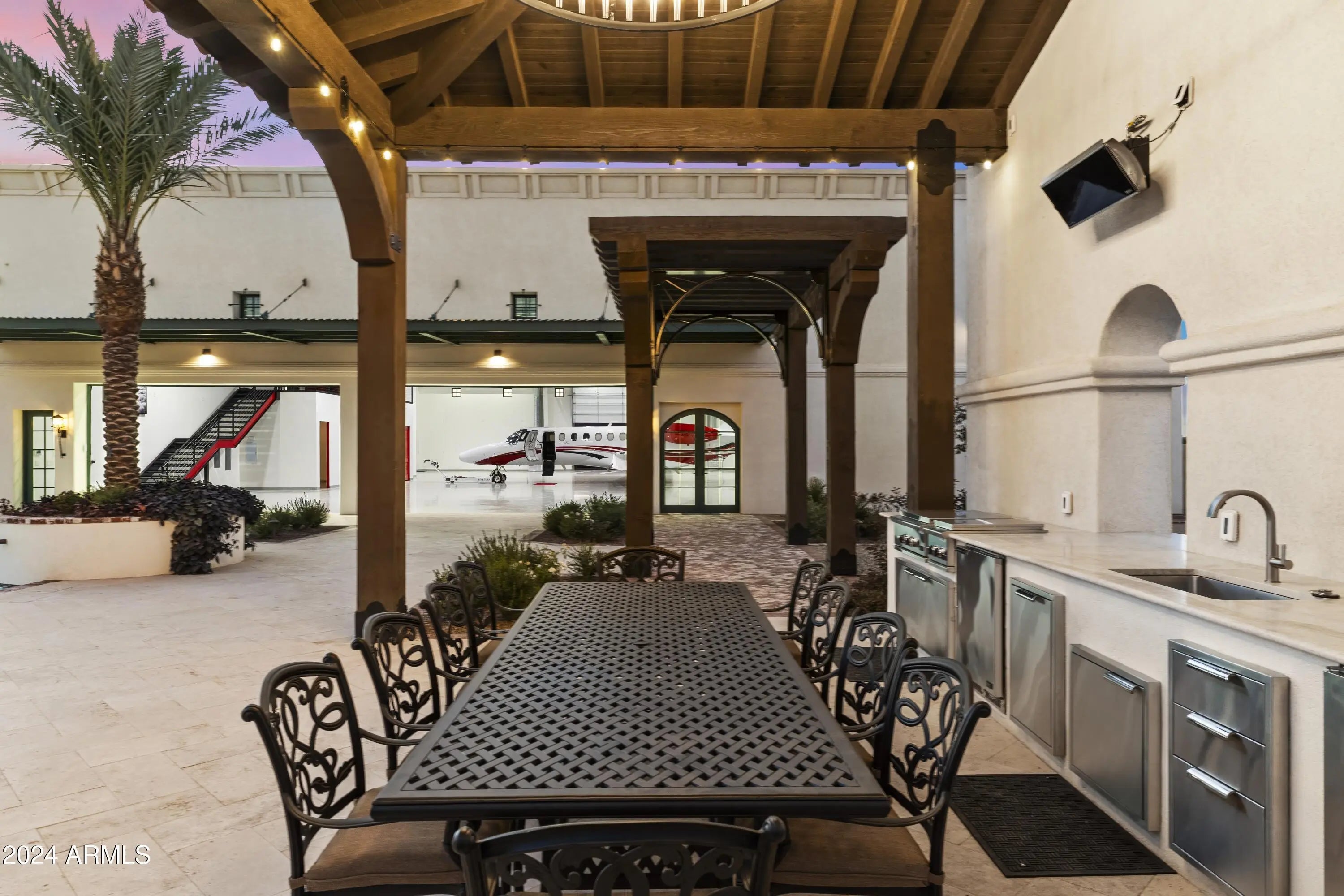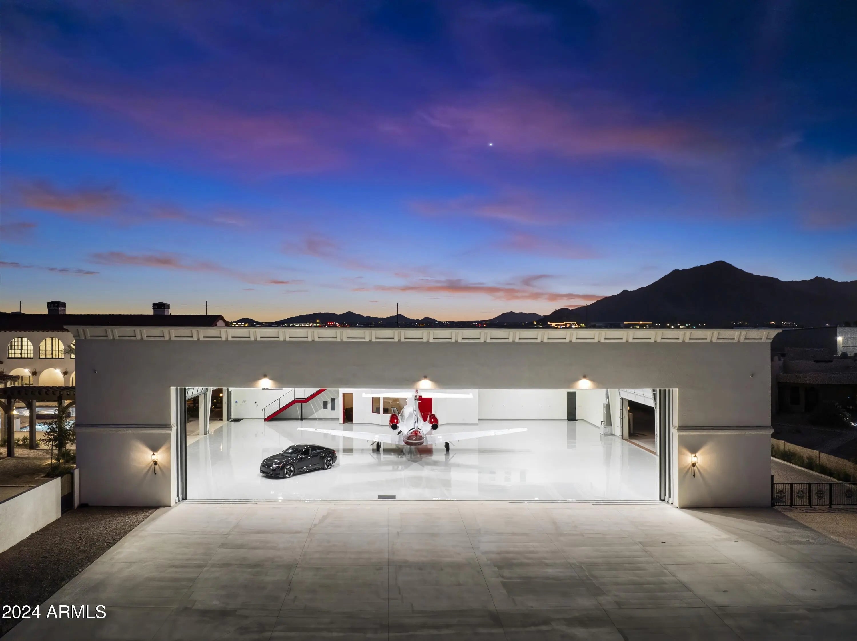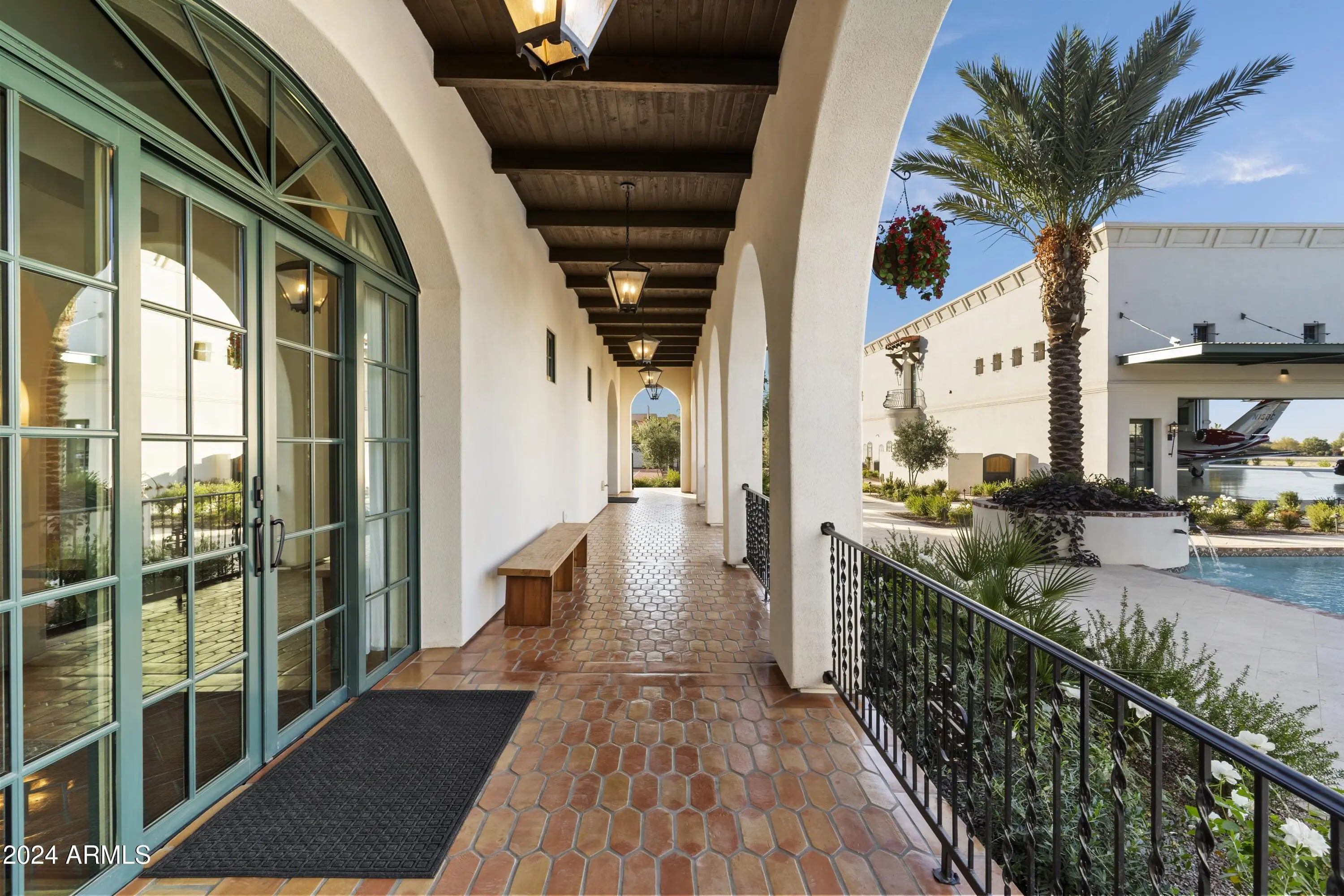 Introducing Misión Veintidós (Mission Twenty-two). This amazing Pegasus Airpark (5AZ3), Queen Creek, AZ home was inspired by classic Spanish style mission architecture. The unique mission style entrance to the home is through a breezeway gate which leads you to a stunning courtyard view of the estate. This estate of 32,000 sq ft of luxury living, with an incredible 26,000+ sq ft of conditioned space has 16'' thick walls for style and maximum efficiency. Perfectly situated on North South double lot, taking a massive 350' of taxiway, sits the main residence on three levels and includes all these features: A 10,000 sq ft steel construction Hangar with Full HVAC, Epoxy coated floor, ''Big Ass'' Fan, Pocket style main hangar doors with an 78'x17' clear opening. Flight office, Storage room, Downstairs bathroom, Interior stairs to mezzanine with bar, Upstairs bathroom, Balcony, Two motorized vertical opening 20 ft glass garage style doors facing the courtyard. " A massive courtyard featuring: 2,000 feet of covered breezeways, Multiple swimming pools with fountains and firepots, Covered outdoor full kitchen under a mission style bell tower, Lit Pickle ball/basketball sports court & Putting green, Sand Volleyball court. "The main house has a 5,000 sq ft Basement: bowling alley, 75 ft shooting range, Tiger Woods' (Full Swing Pro 2.0) Golf Simulator, Wine Cellar, Walk-in vault, Storage room, Bathroom, Interior and exterior stairs. " Next is a 2000+ sq ft detached Master Bedroom: Custom his and her walk-in closets, Separate bathrooms and linens, Large walk-in shower & separate tub, Incredible ceiling details with accent lighting, Multiple balconies, Bar, Fireplace, sliding doors. " Master Spanish Garden: with water and fire features. " General Design considerations: 16" double insulated walls which are quieter, more energy efficient and style correct as seen in the deep-set windows and doors, The extensive iron work is amazing, Custom railing with HH monogram, windows with iron details. " Don't miss these details: clear view elevator from basement to second story sized for wheelchair access. " Wired Cameras access from internet. " Automated lighting. " Security System " Hidden AV closet " Luxury full-service guest suites with spa like bathrooms, suites include laundry and bar in each " 2834 sq ft 2nd Story with Gym, spa and sauna, gym bathrooms & laundry. " Large outdoor balcony, firepit, incredible views of the Superstition and San Tan mountains " Balcony sliding windows overlooking the courtyard. " Firepole slide down from gym to first floor hidden door " Formal living room " 30' sliding glass doors with view of hangar " 28' ceiling with massive beams " Oversize castle style fireplace " Gourmet kitchen with Baking center " Sub Zero Wolf appliances, Easy access from vehicle to kitchen, Fully equipped Butler's Pantry. Dark and smokey (informal sitting room) " Floor level gas fireplace " Full bar " Bathroom " Large sliding window overlooking courtyard pool. Too many features to list.