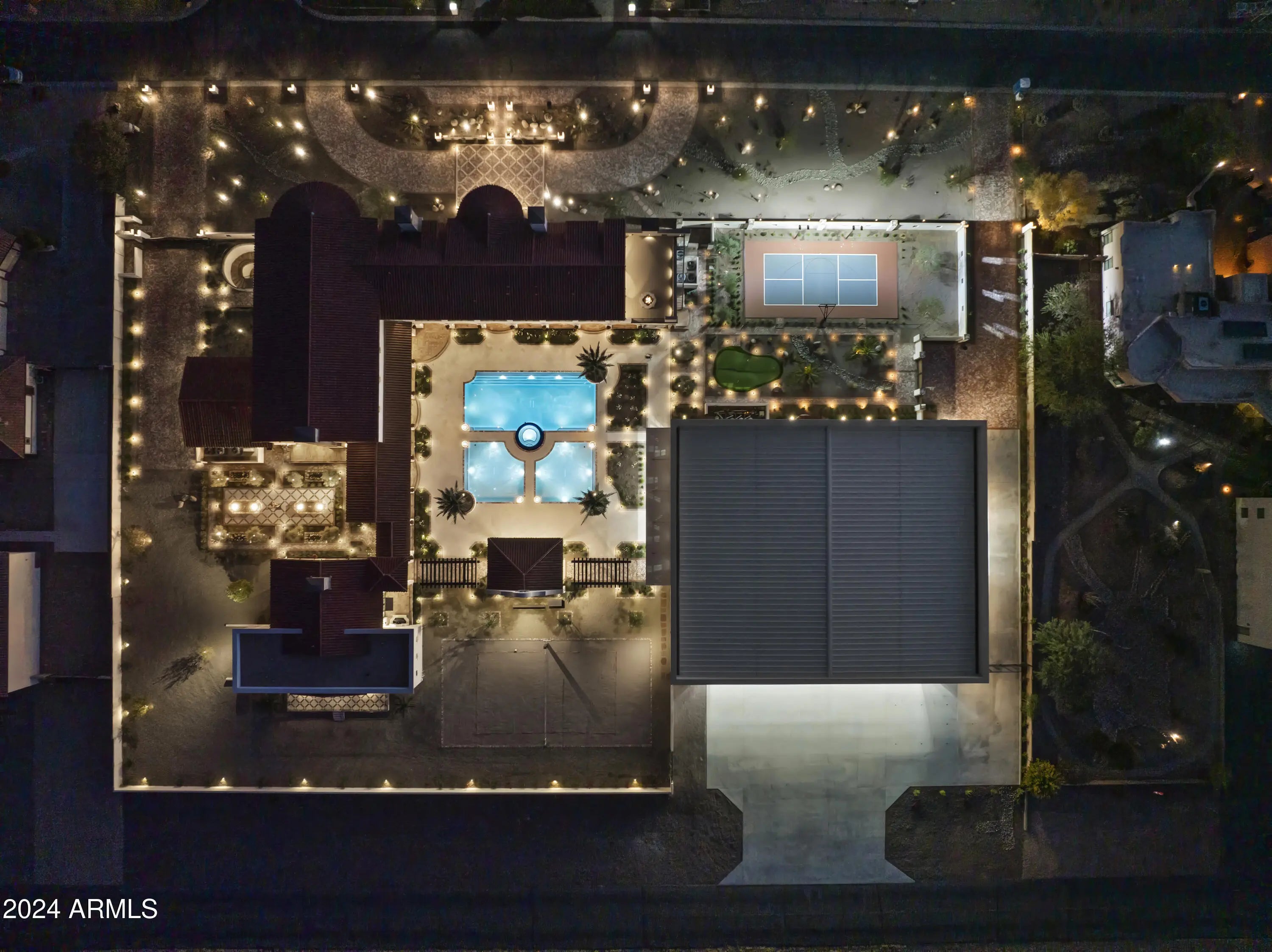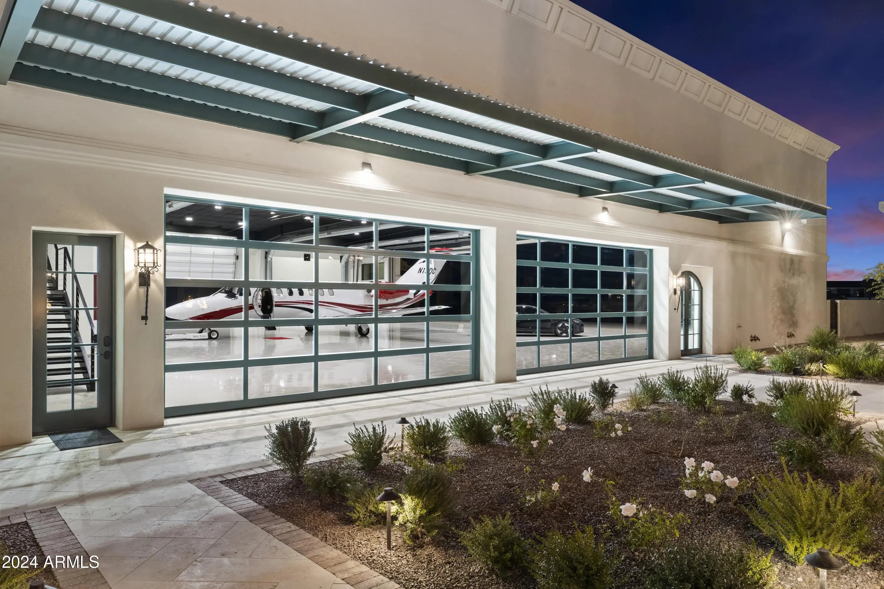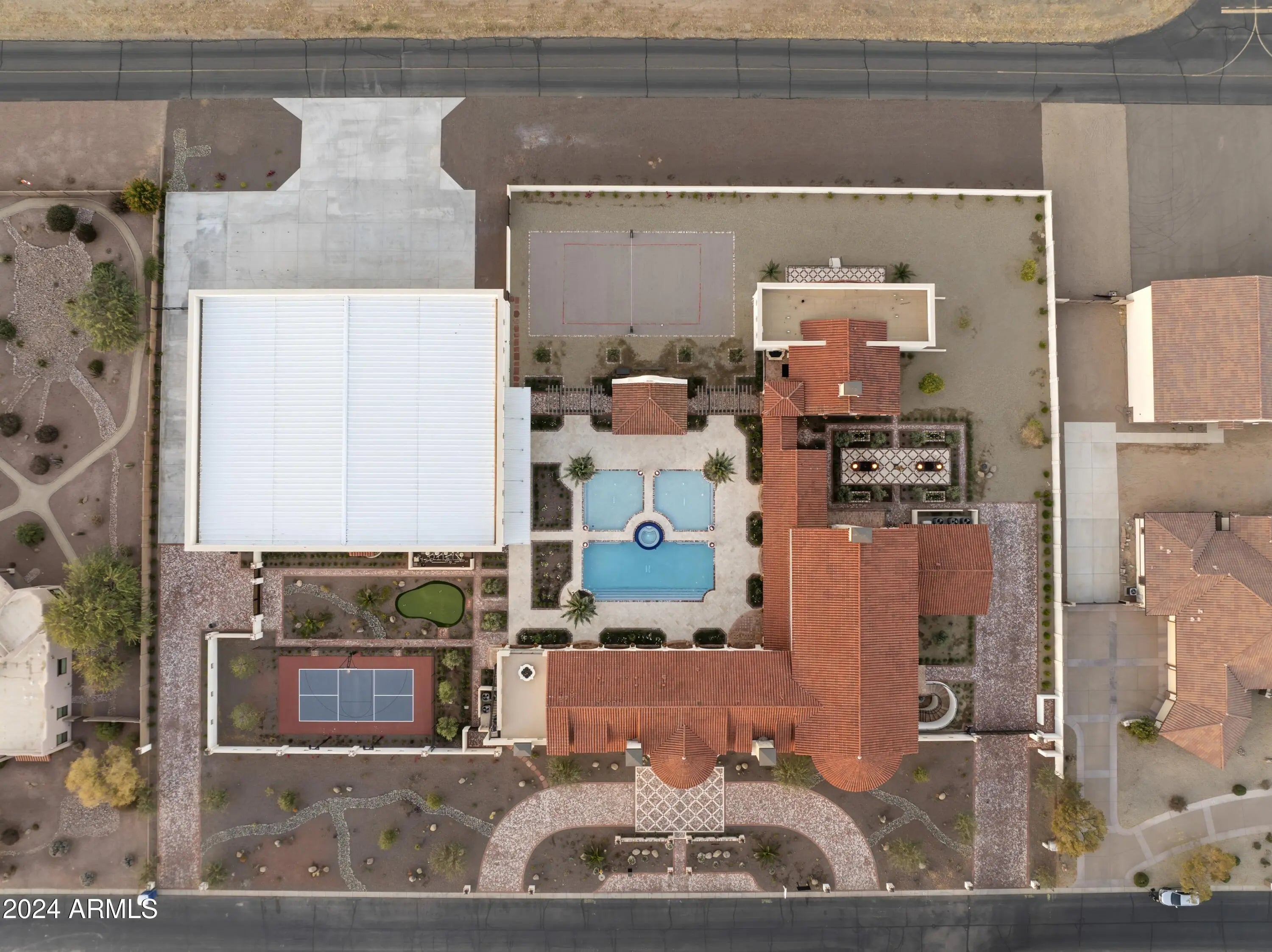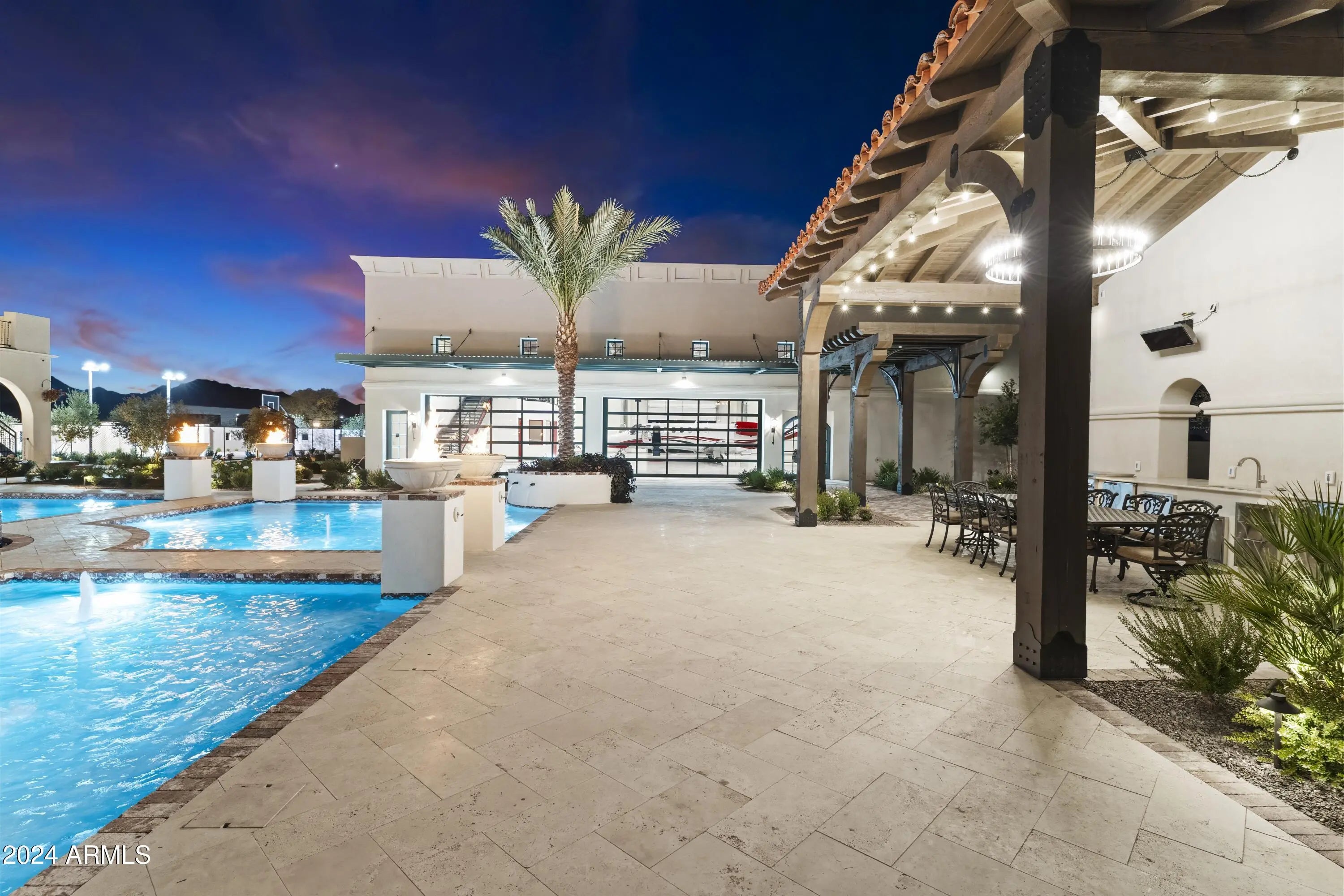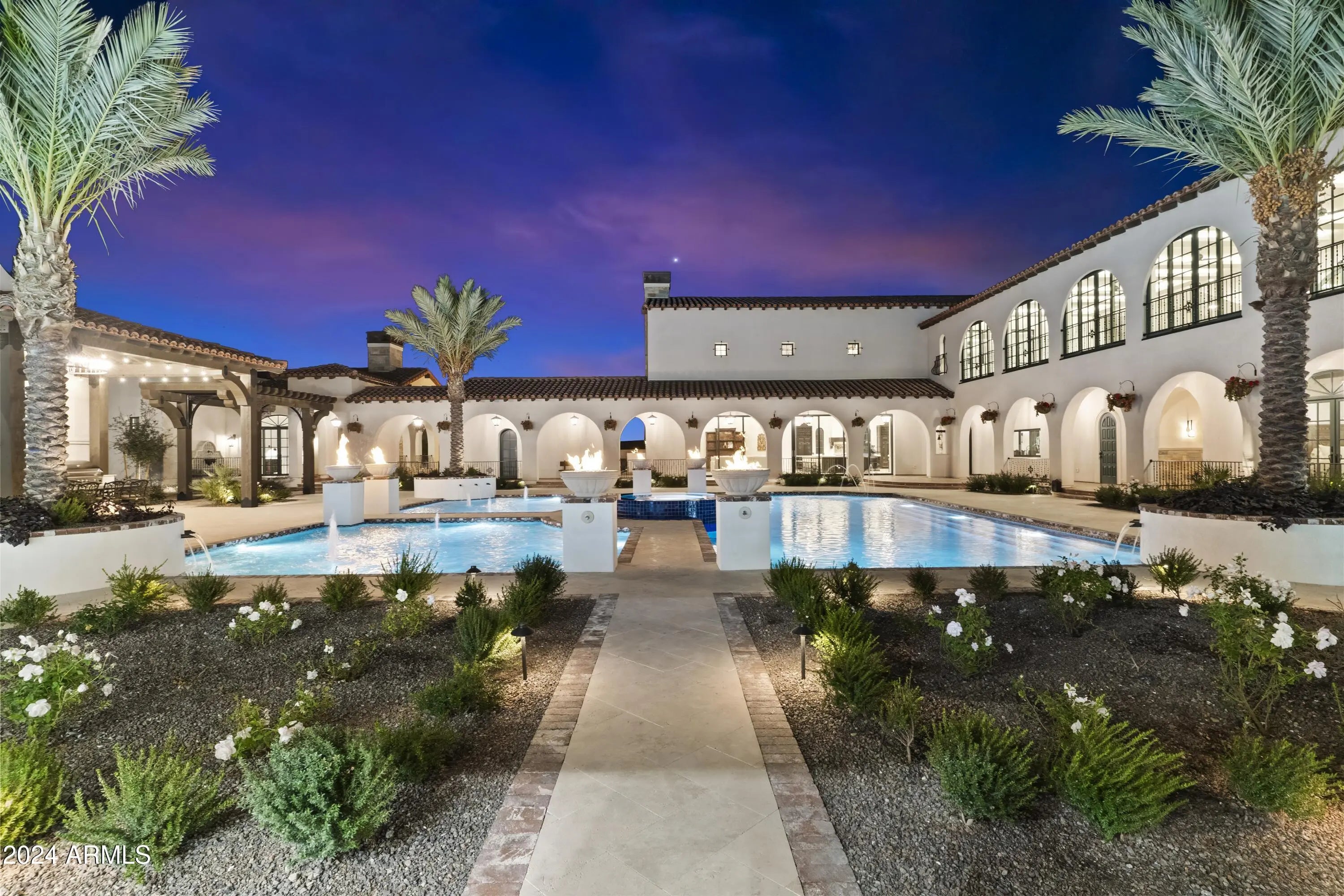 Introducing Misión Veintidós (Mission Twenty-two). This amazing Pegasus Airpark (5AZ3), Queen Creek, AZ home was inspired by classic Spanish style mission architecture. The unique mission style entrance to the home is through a breezeway gate which leads you to a stunning courtyard view of the estate. This estate of 32,000 sq ft of luxury living, with an incredible 26,000+ sq ft of conditioned space has 16'' thick walls for style and maximum efficiency. Perfectly situated on North South double lot, taking a massive 350' of taxiway, sits the main residence on three levels and includes all these features: A 10,000 sq ft steel construction Hangar with Full HVAC, Epoxy coated floor, ''Big Ass'' Fan, Pocket style main hangar doors with an 78'x17' clear opening. Flight office, Storage room, Downstairs bathroom, Interior stairs to mezzanine with bar, Upstairs bathroom, Balcony, Two motorized vertical opening 20 ft glass garage style doors facing the courtyard. " A massive courtyard featuring: 2,000 feet of covered breezeways, Multiple swimming pools with fountains and firepots, Covered outdoor full kitchen under a mission style bell tower, Lit Pickle ball/basketball sports court & Putting green, Sand Volleyball court. "The main house has a 5,000 sq ft Basement: bowling alley, 75 ft shooting range, Tiger Woods' (Full Swing Pro 2.0) Golf Simulator, Wine Cellar, Walk-in vault, Storage room, Bathroom, Interior and exterior stairs. " Next is a 2000+ sq ft detached Master Bedroom: Custom his and her walk-in closets, Separate bathrooms and linens, Large walk-in shower & separate tub, Incredible ceiling details with accent lighting, Multiple balconies, Bar, Fireplace, sliding doors. " Master Spanish Garden: with water and fire features. " General Design considerations: 16" double insulated walls which are quieter, more energy efficient and style correct as seen in the deep-set windows and doors, The extensive iron work is amazing, Custom railing with HH monogram, windows with iron details. " Don't miss these details: clear view elevator from basement to second story sized for wheelchair access. " Wired Cameras access from internet. " Automated lighting. " Security System " Hidden AV closet " Luxury full-service guest suites with spa like bathrooms, suites include laundry and bar in each " 2834 sq ft 2nd Story with Gym, spa and sauna, gym bathrooms & laundry. " Large outdoor balcony, firepit, incredible views of the Superstition and San Tan mountains " Balcony sliding windows overlooking the courtyard. " Firepole slide down from gym to first floor hidden door " Formal living room " 30' sliding glass doors with view of hangar " 28' ceiling with massive beams " Oversize castle style fireplace " Gourmet kitchen with Baking center " Sub Zero Wolf appliances, Easy access from vehicle to kitchen, Fully equipped Butler's Pantry. Dark and smokey (informal sitting room) " Floor level gas fireplace " Full bar " Bathroom " Large sliding window overlooking courtyard pool. Too many features to list.