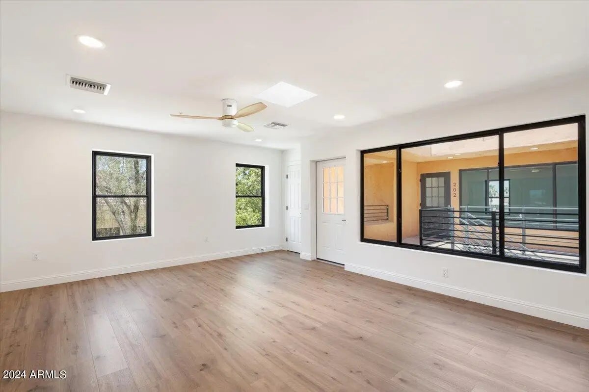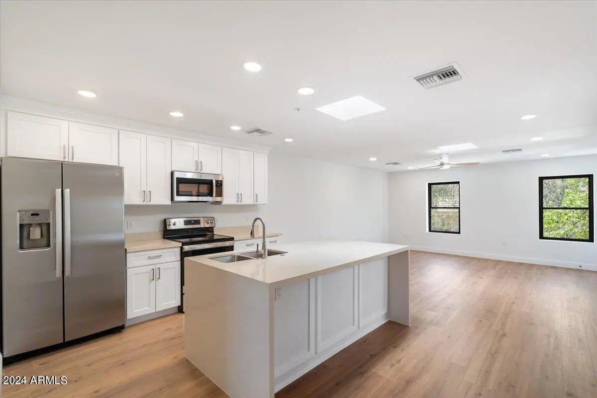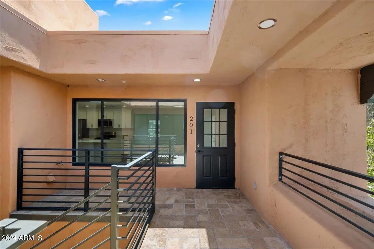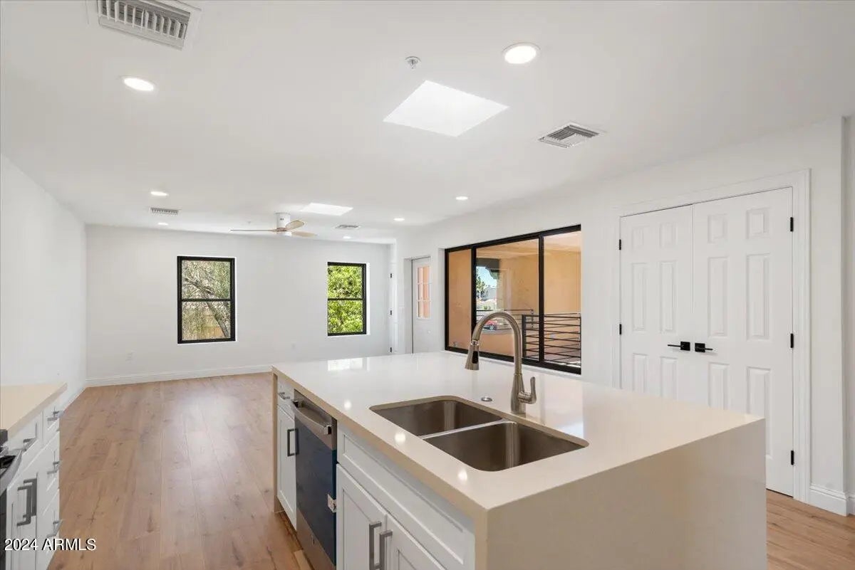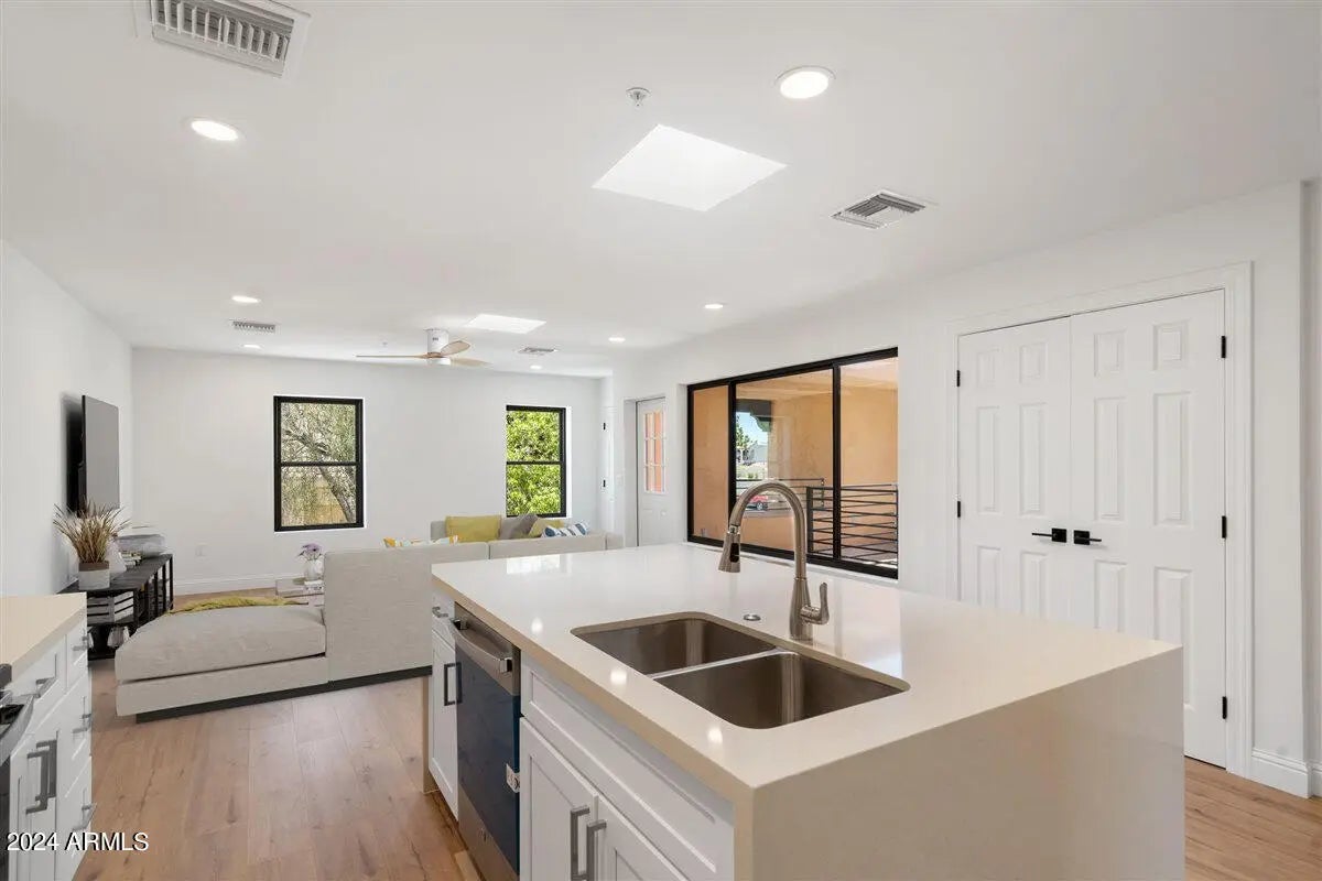 Welcome to the Villas on The Avenue, the first residential offering for purchase in the heart of Fountain Hills. This small enclave features completely brand new units within walking distance to the shopping, restaurants, the world famous Fountain, farmers markets, and all of the events and fairs that Fountain Hills is known for. Upon arrival, pass through the tranquil courtyard that provides additional natural lighting to all units. Once inside, instantly notice a well thought out open concept floor-plan with modern designer finishes & appliances. The kitchen is a true delight with plenty of brand new cabinetry, stainless steel appliances, and waterfall granite island with breakfast bar. Both bedrooms and bathrooms provide ample space, trendy ceiling fans, glass showers, & chic fixtures.