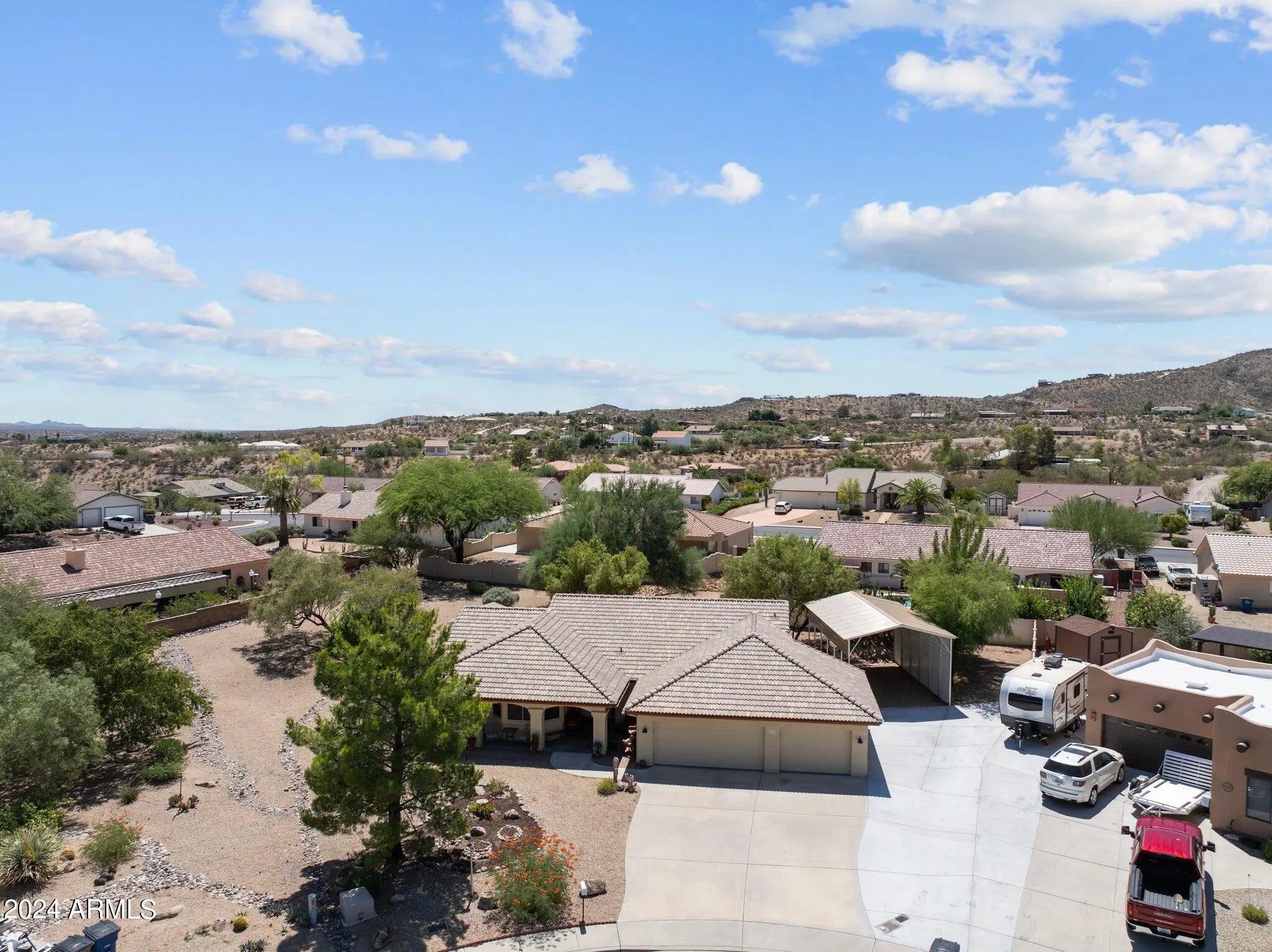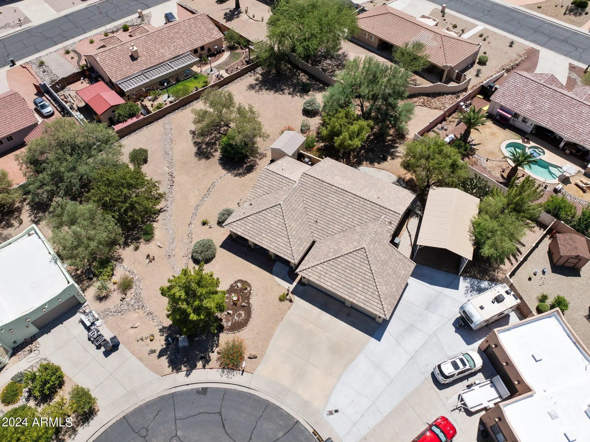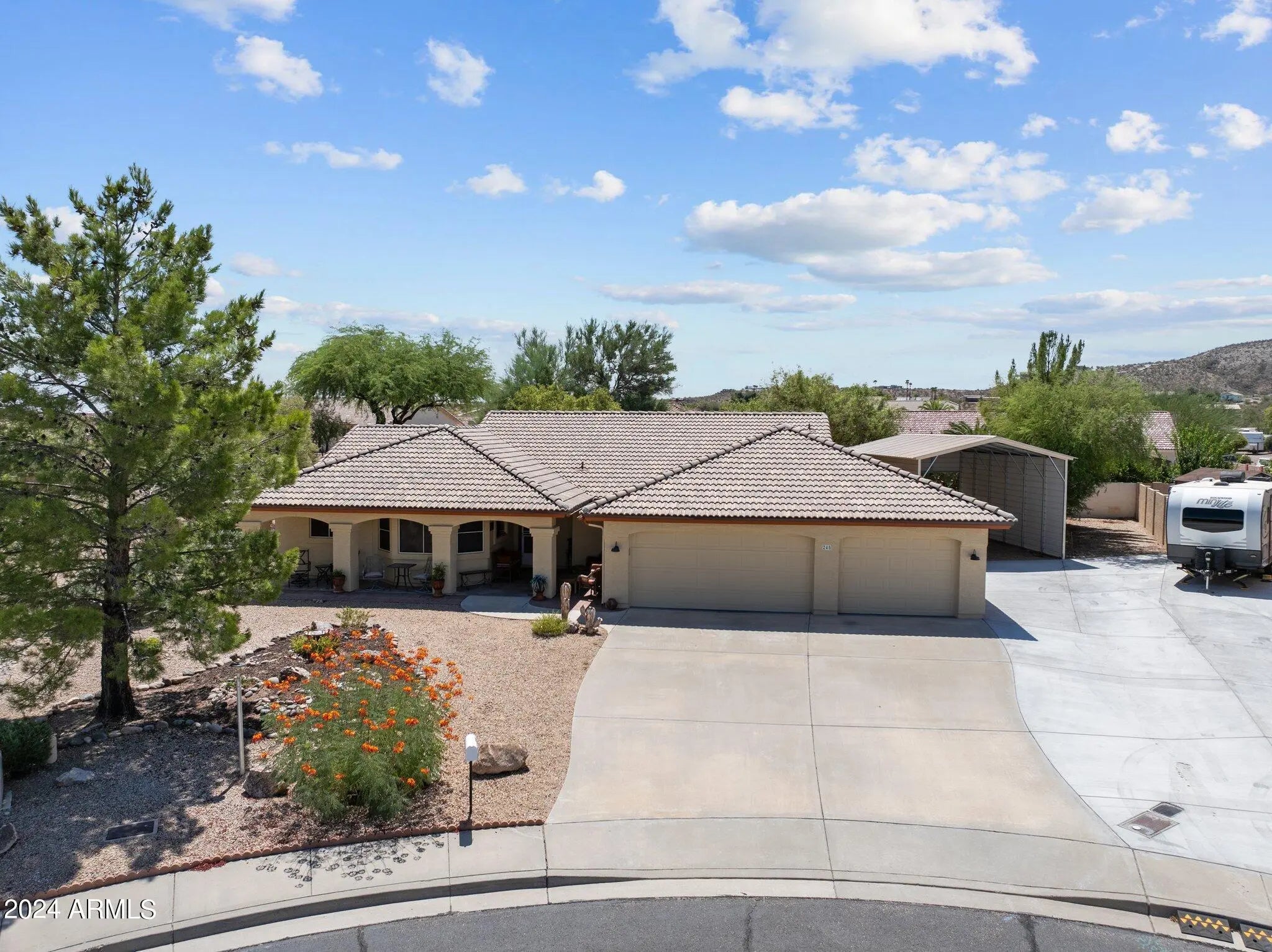 Nestled in a tranquil cul-de-sac within a sought-after neighborhood, this meticulously maintained 3-bedroom, 2-bath home offers a harmonious blend of comfort and style. With a thoughtfully designed split floor plan, you'll appreciate the privacy of the master suite, featuring a luxurious bathroom with a separate tub and shower. The property sits on nearly half an acre, adorned with mature landscaping that enhances the home's picturesque curb appeal. Enjoy the expansive outdoor space, perfect for gardening, play, or simply unwinding in your private retreat. A standout feature of this residence is the enclosed Arizona Room, providing an additional 390 square feet of versatile living space that is seperatley cooled/heated—ideal for a sunlit office, playroom, or cozy lounge. Kitchen and dining area were just painted and new appliances installed! There is a 3-car garage for your vehicles and storage needs. Home also offers a 18x30 foot covered RV parking space and a 10x14 Tuff shed. Homeowner just had the roof underlament replaced and that material has a 50 year warranty. This warranty is transferable to the new owners. Sellers also added a new driveway that gives easy access to the RV Carport. Leaf filters were recently added to the gutters on the back of the home. There are several other upgrades and updates on the home. Please see the update list in the documents tab for that information.