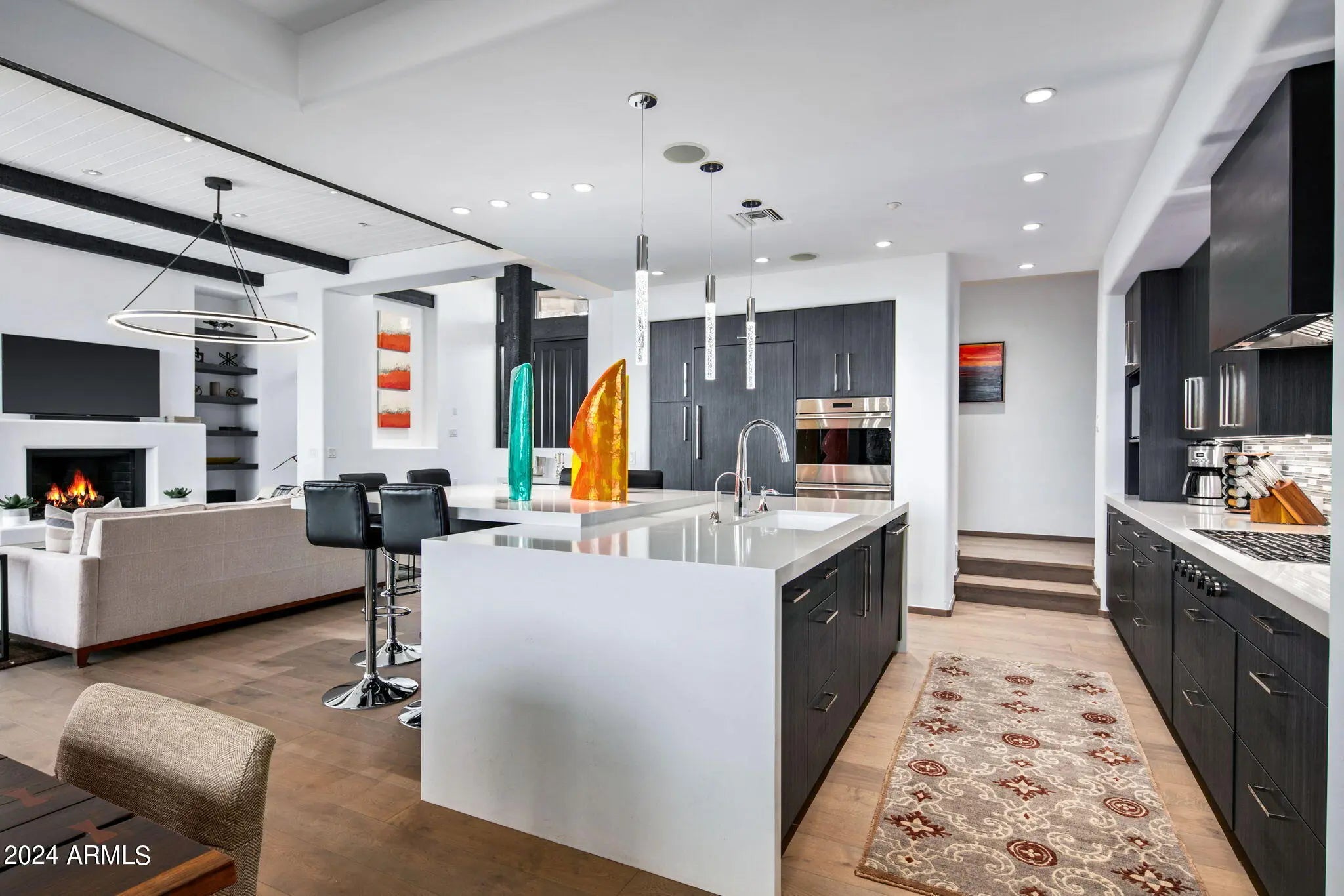Completely remodeled stand-alone home, situated on a corner lot with stunning mountain views and picturesque sunrises and sunsets. This home offers the luxury of a Five-Star resort, featuring beautiful wood floors throughout, sleek modern cabinetry in the kitchen and bar area (with a wine fridge), quartzite waterfall countertops, and an elegant backsplash. The primary bathroom is designed for a spa-like experience, with a freestanding tub and newly installed windows. The inviting patio, complete with a pebble tech spa and gas barbecue, provides the perfect space to unwind after a busy day. The home also includes a two-car garage with epoxy flooring and new patio railings. Home is being offered turnkey with gorgeous artwork.