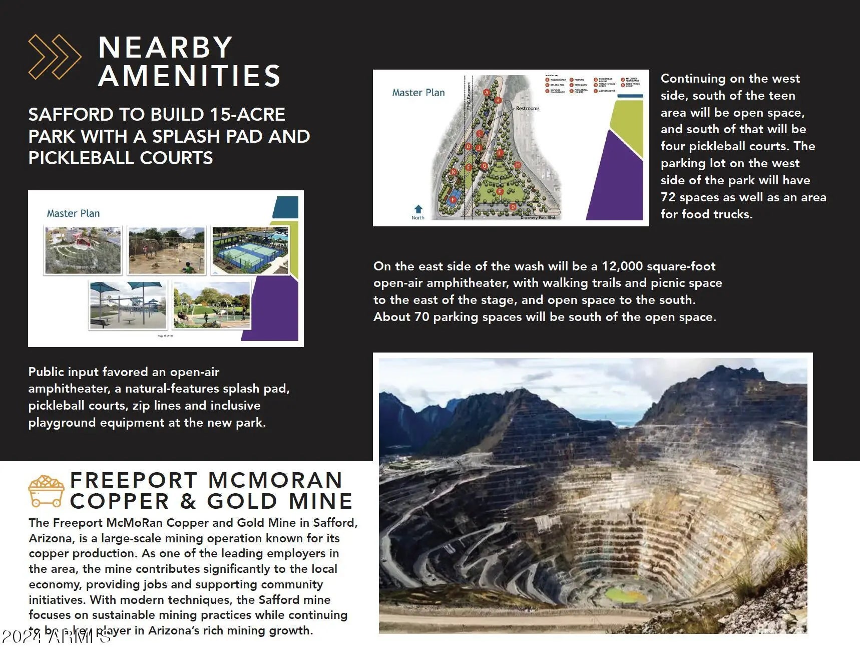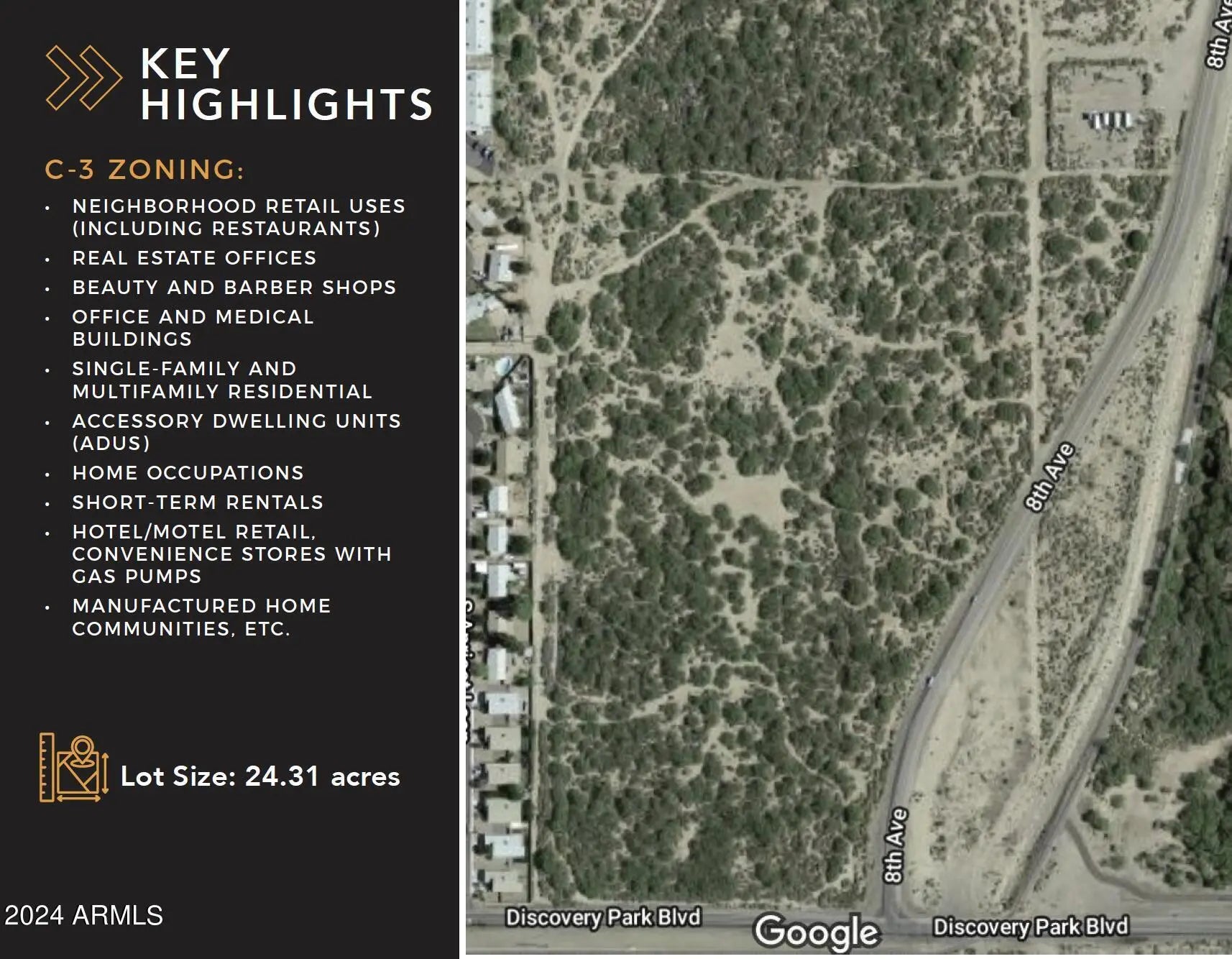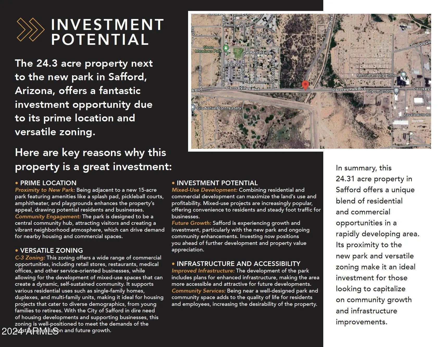 Exceptional Development Opportunity: Prime 24.31 Acres in Safford, AZ! Discover a remarkable investment prospect with this 24.31-acre property, newly rezoned to C-3, situated in the heart of Safford's thriving landscape. Located at the intersection of 8th Ave and Discovery, this prime site is just minutes from Downtown, schools, and directly adjacent to a future 15-acre city park, all while being a short drive from the expanding Freeport Mine. The breathtaking mountain views further enhance the appeal, making this location truly one-of-a-kind. Unlimited Development Potential: The C-3 zoning opens the door to a multitude of possibilities, making this an ideal canvas for visionary investors and developers. Whether your focus is on retail centers, convenience stores, gas stations, restaurants, office buildings, hospitality venues, medical facilities, housing subdivisions or multifamily housing, this property can accommodate the diverse needs of Safford's growing community. Adjacent to a New Community Hub: Enhancing the allure of this property is its proximity to a new 15-acre park being developed by the City of Safford. This state-of-the-art recreational space will include a splash pad, pickleball courts, an amphitheater, and playgrounds, creating a vibrant community hub that draws residents and visitors alike. The park's presence is a significant advantage, promising increased foot traffic and elevating the neighborhood atmosphere. Thriving Local Economy: Safford is experiencing robust growth, driven by the ongoing expansion of the Freeport Mine, which brings new jobs and stimulates economic activity in the area. With an increasing demand for housing and commercial developments, this property stands out as a timely investment opportunity. As the city enhances its infrastructure and embraces community development, this location is primed for substantial growth. Prime Location Near Downtown & Schools Strategically located near Downtown Safford and major educational institutions, this property is ideally positioned to meet the community's diverse needs. Whether you're looking to purchase and develop all or part this property for commercial, residential, or mixed-use projects, this site represents an unparalleled opportunity in a city rich with potential. Don't miss your chance to be part of Safford's exciting future!