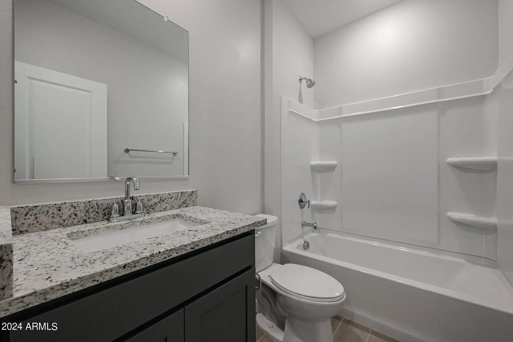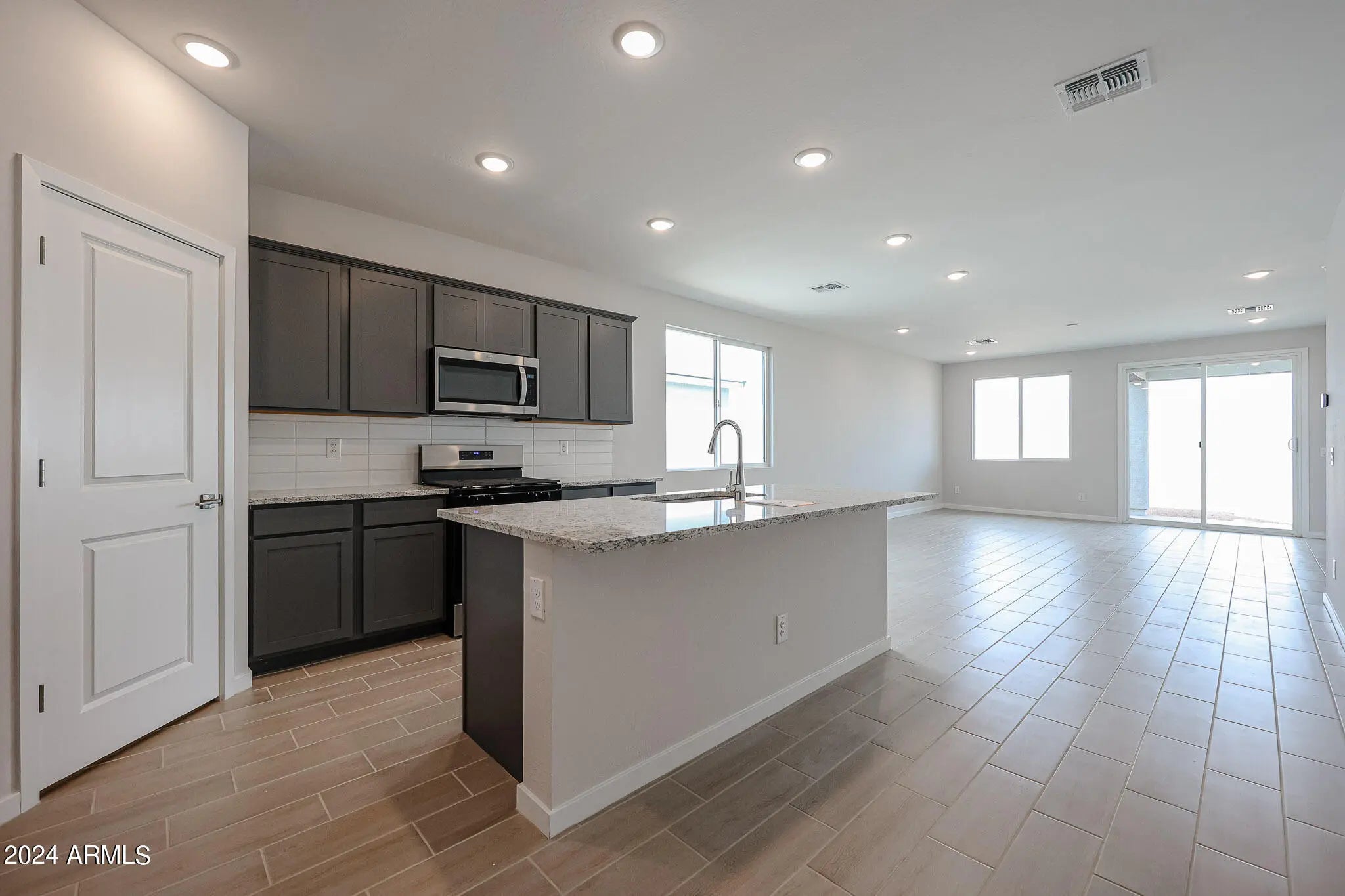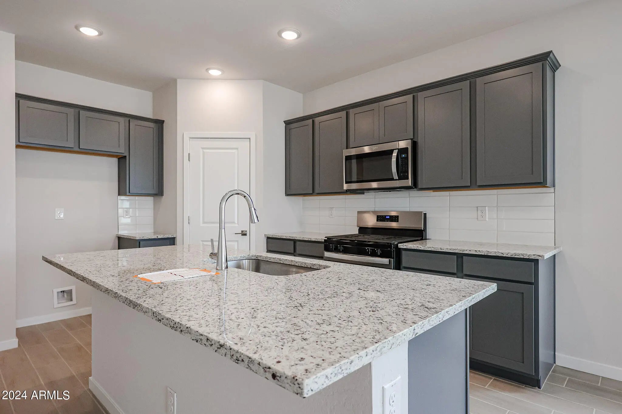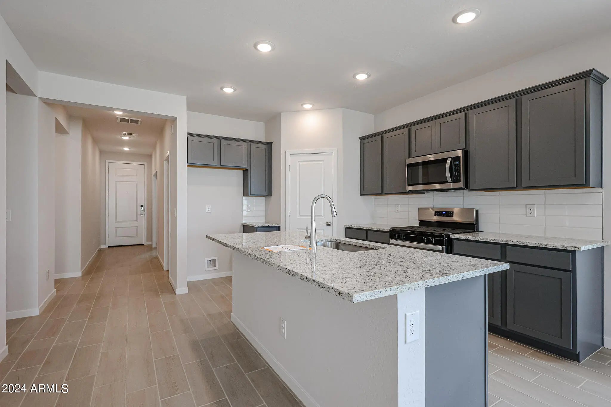 MOVE-IN READY! This charming single story home offers an upgraded, covered porch in the entry. A den/bonus space greets you when you first step into the home, and three bedrooms complete this wonderful Residence 2 new build. Upgraded, darker grey cabinets throughout the home make for a sleek and modern feel, complete with gorgeous granite countertops in the kitchen AND bathrooms! Raised vanities in the bathrooms, kitchen backsplash included as well. UPGRADED wood-look ceramic tile throughout, with carpet in the bedrooms. Large laundry room, a covered patio in the back, and plenty of space in the yard. Smart home technology completes the package. Your chance to live in one of the most sought after locations in Maricopa. LAKE, parks and shopping nearby! Washer, dryer, fridge INCLUDED!