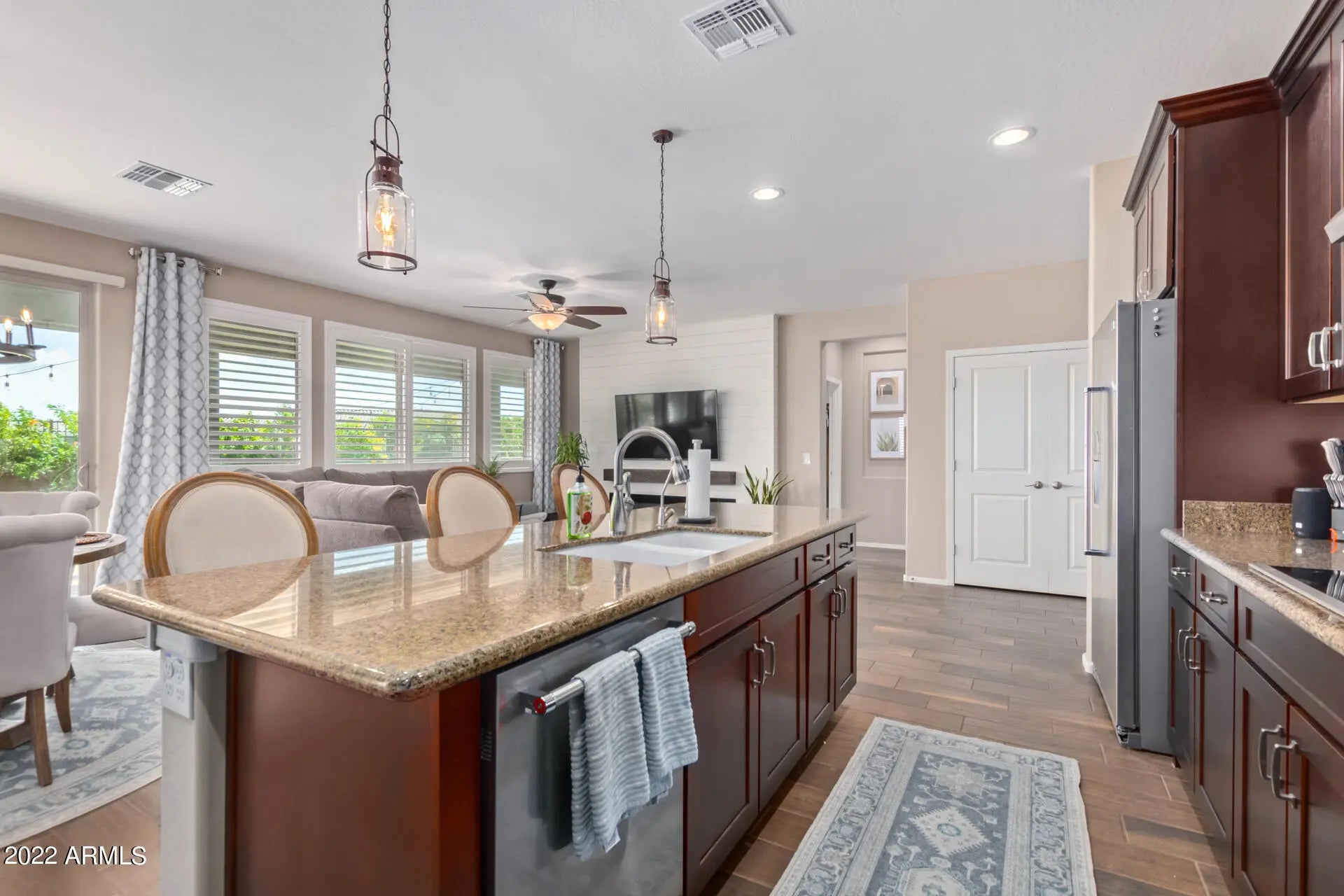 All Inclusive! Come feel at home for an incredible extended stay in this newer CONTEMPORARY FARMHOUSE located in the popular Meridian community in Queen Creek w/resort style amenities. Beautiful, comfortable, 3 BR/2 BA home fully furnished with a King bed, Queen adjustable bed and your choice of a full bed or a desk for an office. Featuring an open split Floor Plan with high ceilings, abundant natural light, chef's kitchen, luxuriously comfortable beds, and exceptional outdoor living space. The casual style is combined with designer finishes like premium wood-look tile flooring throughout, plantation shutters, iron security door, upgraded light fixtures, modern gas fireplace and custom landscape design. The inviting entry opens to the main living area professionally decorated Kitchen has granite countertops w/over sized island/breakfast bar, SS appliances, convection oven, glass cooktop, large pantry and ample cabinets full of dishes, cookware, small appliances, and everything you may need. The main ensuite bedroom is split w/ large walk-in closet, his and hers sinks, a huge glass enclosed shower, private toilet room, and backyard entry. The second and third bedrooms are generous (10x15), with one set up as an office (Or a full size bed is available) and the other has an adjustable Queen bed w/walk-in closet and access to their own bath. Other highlights include reverse osmosis, water softener, inside laundry w/ LG front loader washer & dryer, epoxy garage floor, ceiling fans t/out, and flat screen smart TV's in 2 of the bedrooms and great room. This beautiful home is situated on a premium lot, fully fenced and backing to a common area, private with many mature plants, pavers, and premium artificial turf. Also has special lighting, comfortable outdoor furnishings, a propane gas grill, and a small dog run w/doggie door. ALL Utilities and Amenities are Included! Meridian is a recently completed community with a prime location in the heart of of Queen Creek. It is perfect with tree-lined streets, pedestrian-friendly sidewalks, walking, biking, and equestrian trails, and a variety of resort-style amenities including a 5000 sq ft community pool, a splash pad with water features, several parks with playgrounds, basketball courts, green belts, community gardens, and an outdoor movie ramada. Close to highly rated public schools, shopping, and dining. Olive Mill 1.5 miles, New Frontier Family Water Park 2.7 miles, Queen Creek Marketplace 4 miles, Mansel Carter Oasis Park 6 miles, Legacy Sports Complex 7 miles, Mesa Gateway Airport 7 miles, and SR24/San Tan Freeway 7 miles Do not miss this gorgeous All-Inclusive home for lease!