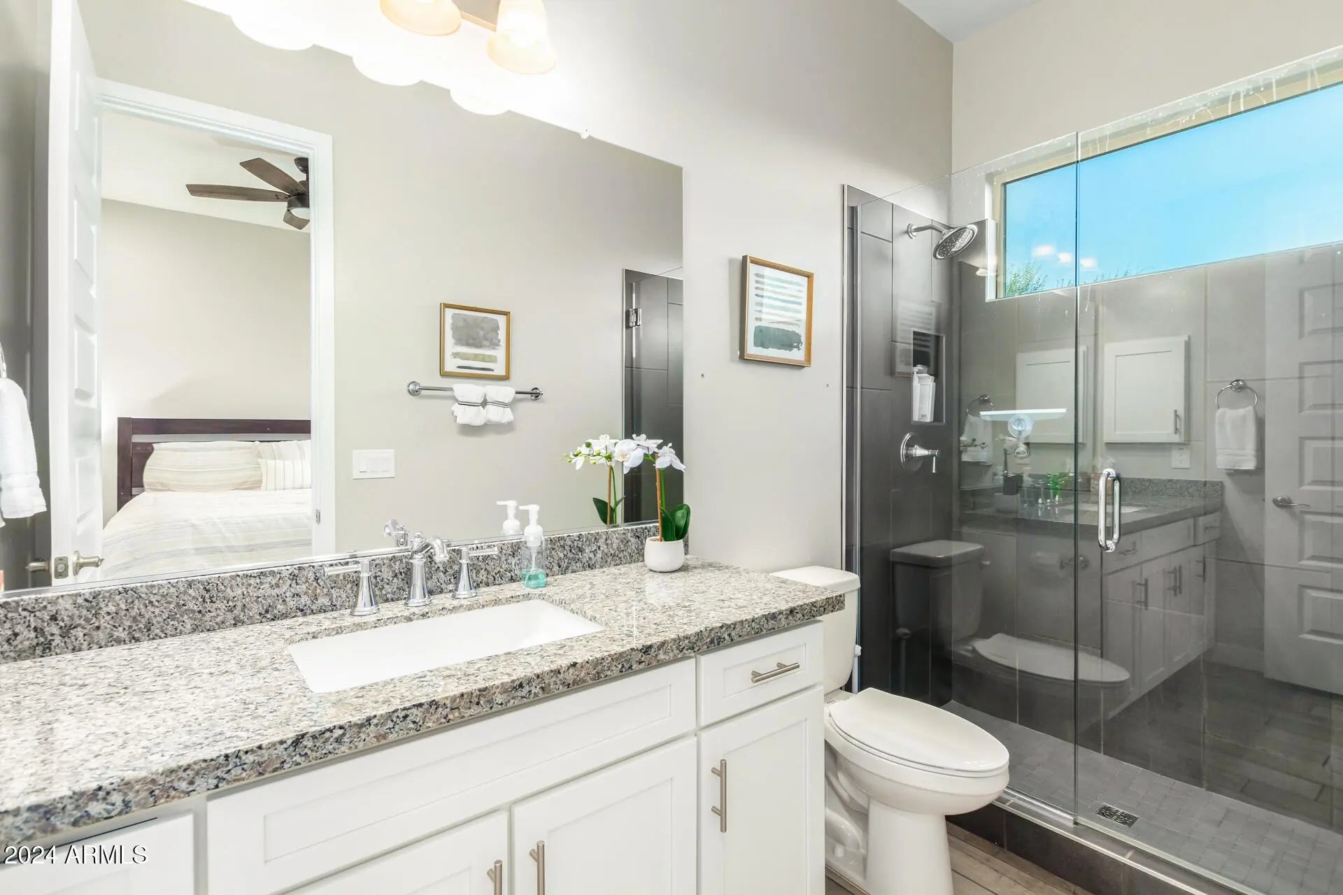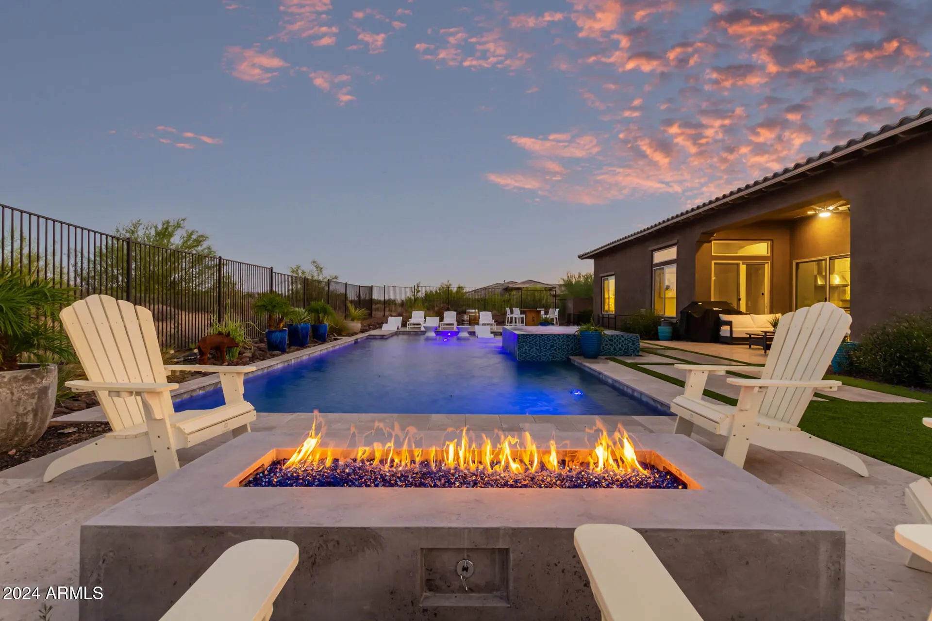 Experience this stunning home, designed with elegance & functionality in mind. Boasting 4 spacious bedrooms, each with walk-in closets & en-suite baths, this home is crafted for comfort & privacy. The owner's suite offers convenience with both his and hers closets. The expansive living area, with soaring 12-foot ceilings, creates a light-filled, open atmosphere. The home also includes a detached casita, along with a 5-car garage and an RV gate with a large side yard for added storage or recreation. Situated on a quiet cul-de-sac lot, this home offers a high level of privacy. Step outside to the resort-like backyard, complete with a pool, negative edge spa, fire pit, & desert landscaping that frames breathtaking mountain views. Located just minutes from the shops and dining.