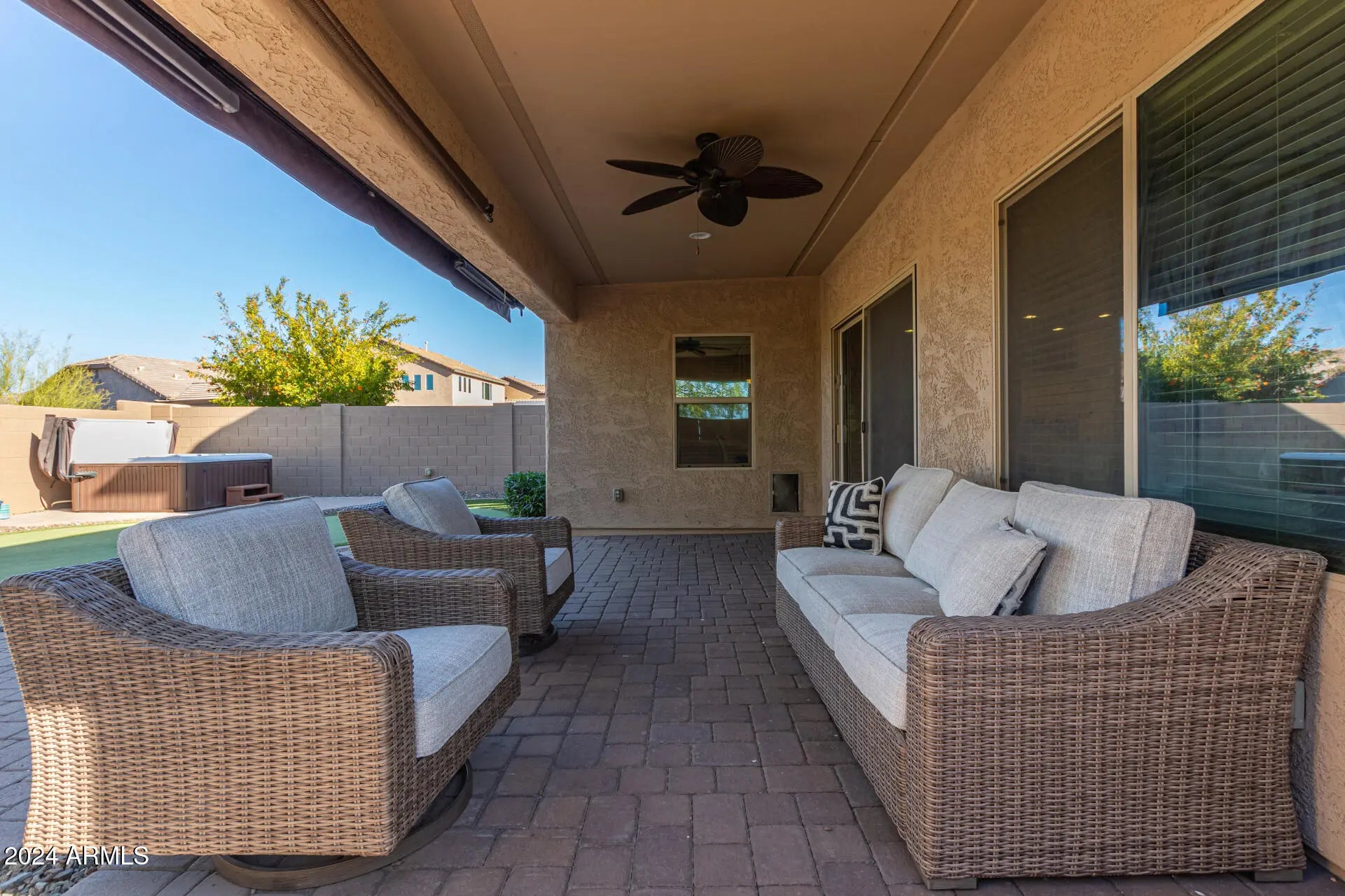 What a RARE find! This beautiful two-story home offers 3 beds, 2.5 baths, & a 2-car garage. Great curb appeal with stone accent details & a well-manicured desert landscape. The home exudes elegance with abundant natural light, tall ceilings, a warm neutral palette, and tile & soft carpet t/out. You'll LOVE the inviting living room paired with a media niche, surround sound, & sliding doors to the back! The gourmet eat-in kitchen boasts high-end SS appliances w/cooktop gas, granite counters, recessed & pendant lighting, mosaic tile backsplash, staggered cabinetry, a walk-in pantry, and a huge island w/breakfast bar. For added functionality, you have a versatile den downstairs & a cozy loft upstairs. The large main bedroom has an ensuite with two vanities, a tiled shower, & a walk-in closet. Laundry room with a sink & cabinetry for added convenience. Outdoor living is found here, too! The tranquil backyard offers a paver-covered patio w/retractable awning, additional paver-seating areas, a putting green, a hot tub, & a tree for a refreshing shade. Take advantage of the Community amenities including a clubhouse with pools, spa, & workout facility. Don't miss this unique opportunity!