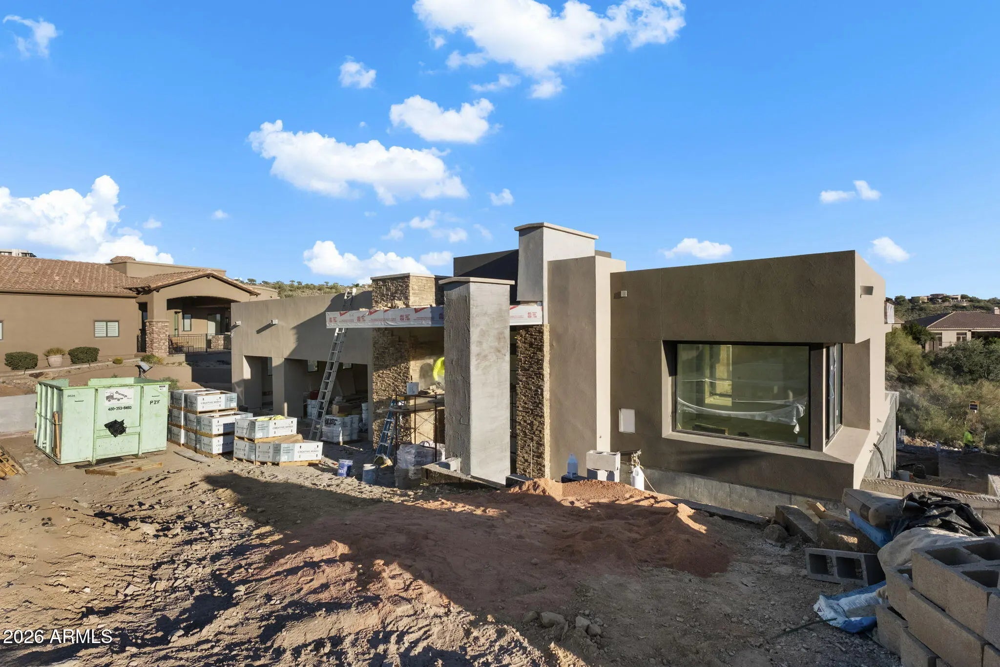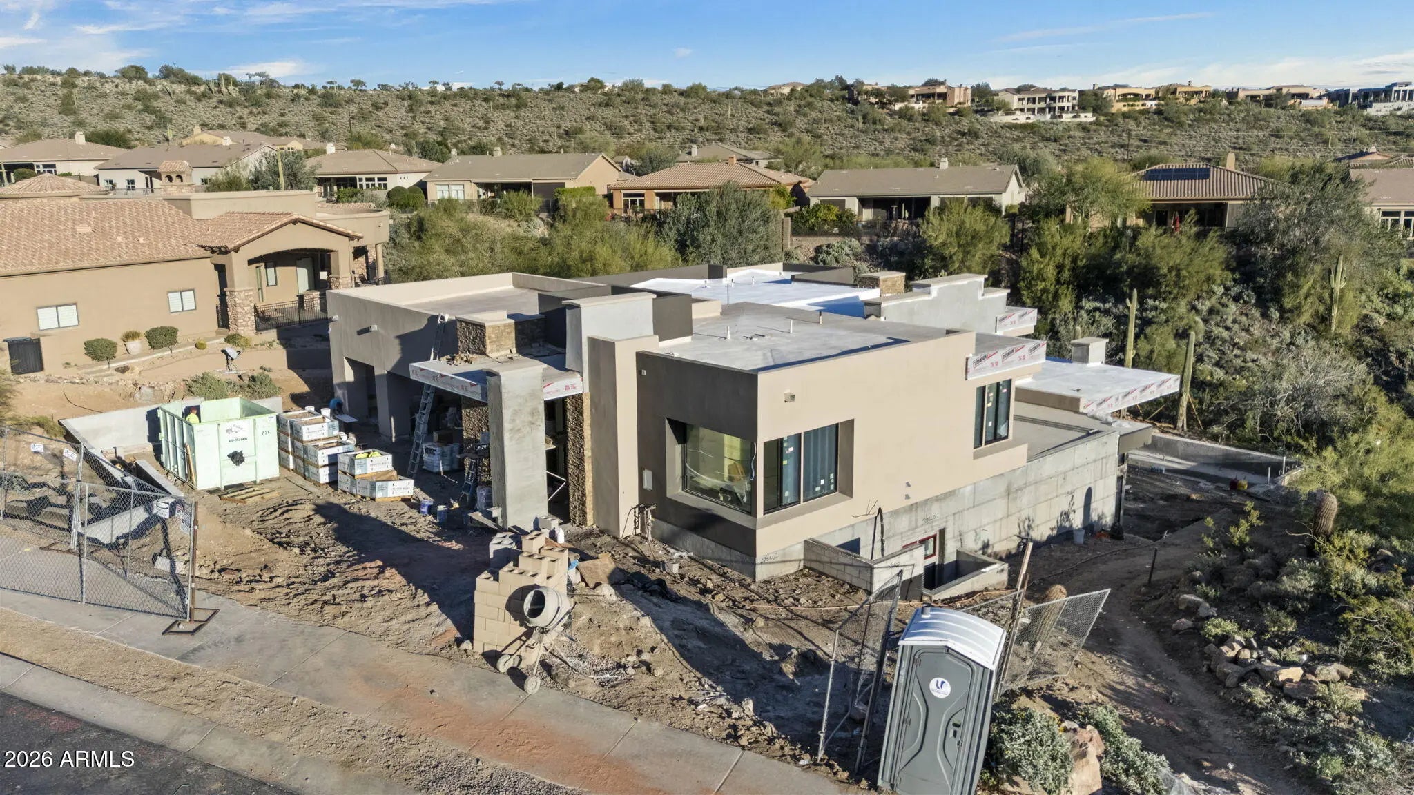 Immerse yourself in the charm of this stunning, newly constructed two-story haven, crafted with precision by MSN Group, set in the lively heart of Hidden Hills with breathtaking views of surrounding mountains. Encompassing 5,866 square feet, this residence is a beautiful fusion of sophistication and practicality, featuring 6 spacious bedrooms, each with a generous walk-in closet, and 6 lavish en-suite bathrooms, along with a convenient powder room and a dedicated office. The gourmet kitchen serves as a chef's paradise, seamlessly connecting to a grand great room, complete with a stone fireplace that exudes warmth and invites gathering and relaxation. An elegant dining area enhances the flow with a built in wine wall cabinet, setting the perfect stage for entertaining. Adding to its convenience, a built-in elevator provides effortless access to both floors. The primary suite offers serene desert views, dual walk-in closets, and a luxurious bathroom with a walk-in shower and jetted tub. Other highlights include designer cabinetry, premium finishes throughout, and an oversized three-car garage. Outdoors, discover a sprawling patio, a fully-equipped outdoor kitchen and entertainment area, and a sparkling pool with cascading waterfalls. Perfectly situated in Scottsdale, this home exemplifies luxurious modern living, offering a lifestyle defined by elegance, comfort, and unparalleled sophistication. Buyers have time to make changes and choose finishes.