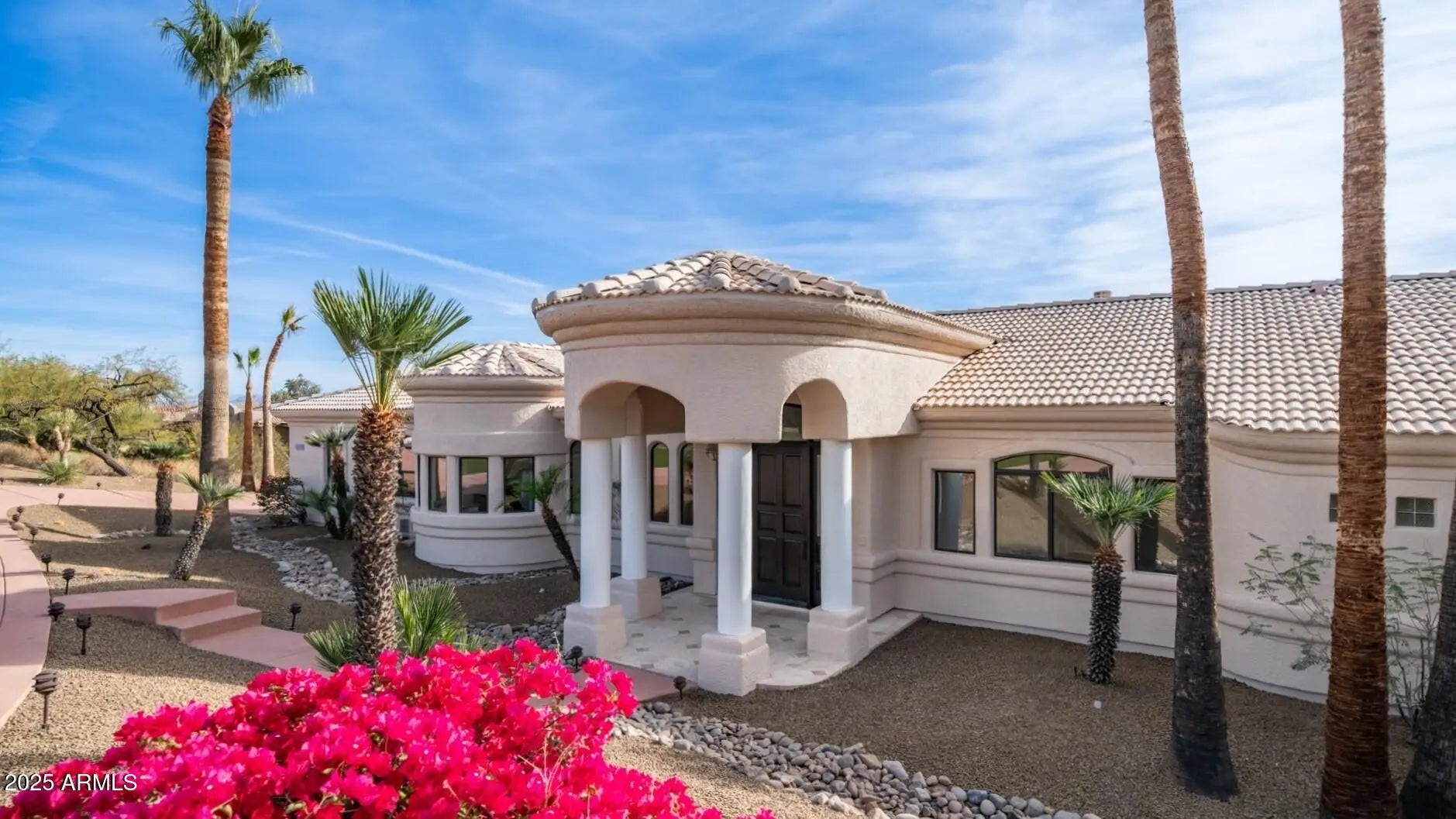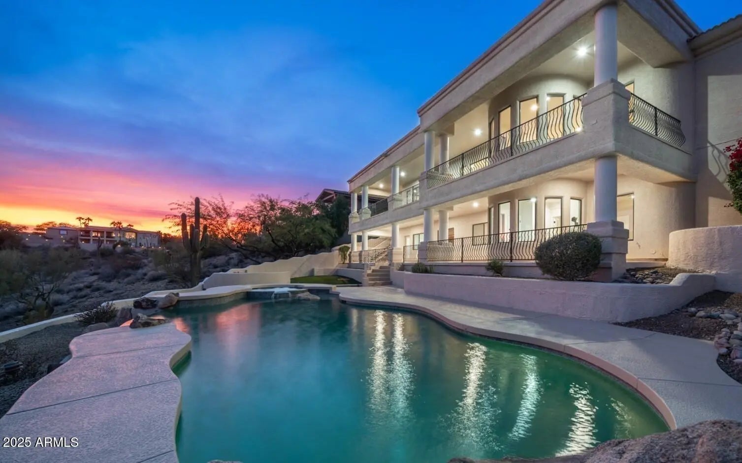 Nestled on an elevated, 1.27 ACRE HOMESITE overlooking the natural beauty of Sonoran Desert terrain, this timeless, architecturally inspiring home was designed to capture BREATHTAKING VIEWS! Spacious estate with approximately 7,000 square feet under roof, offering a flexible floor plan, expansive covered balcony, large covered patio, covered porch, and oversized garage. Luxury and quality throughout, including artistic wood/glass front door, beautiful gourmet kitchen, granite countertops, travertine, marble, warm woods, separate office, separate sitting room/den, guest suite, spectacular main suite, and more ($100,000+ in 2024 renovations). The resort-style rear yard completes this magical setting with an amazing pool, water feature, inviting spa, stunning sunsets, and SCENIC VIEWS!