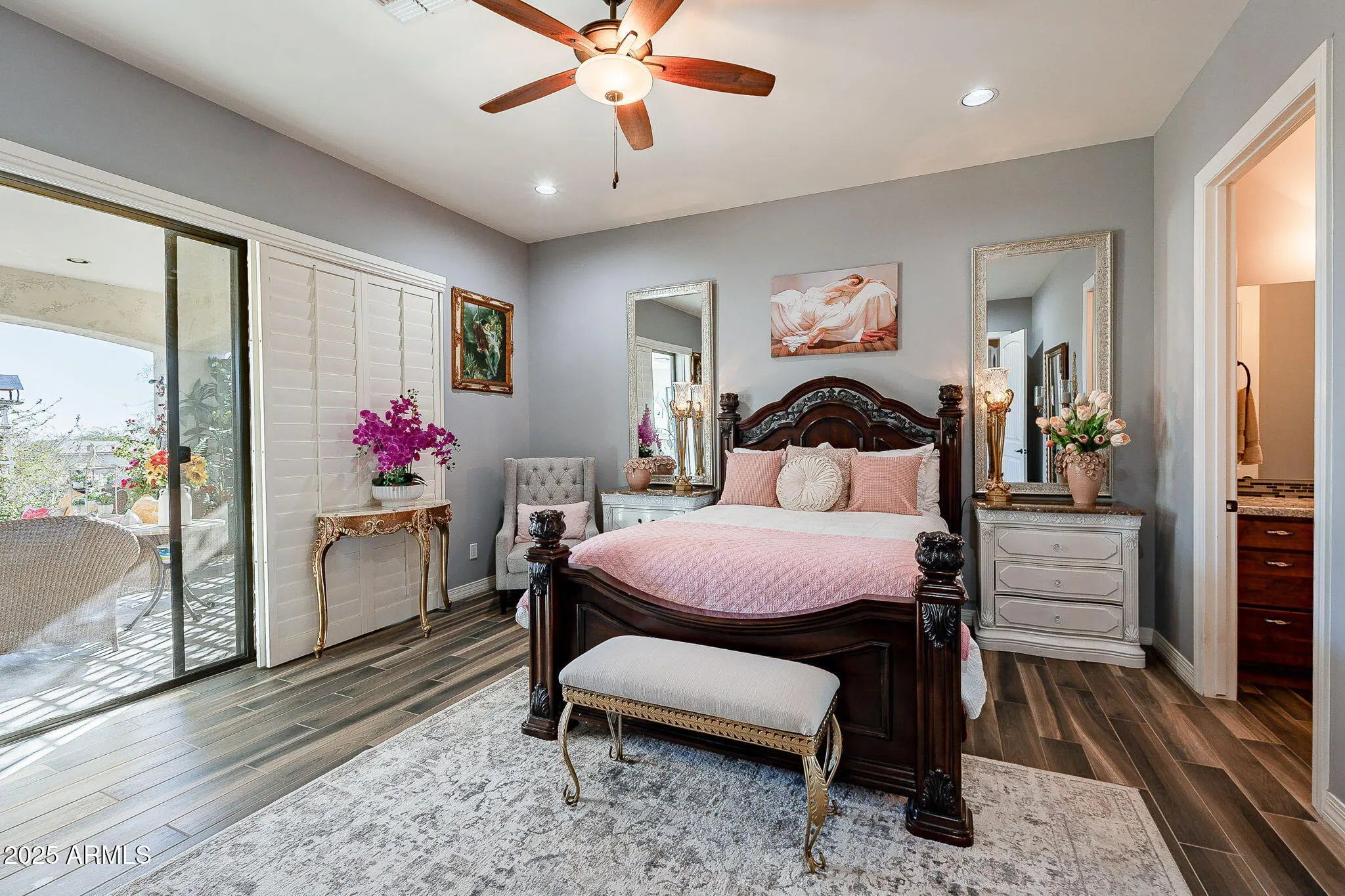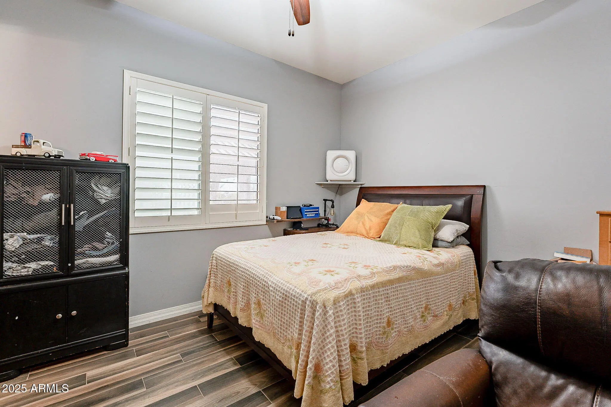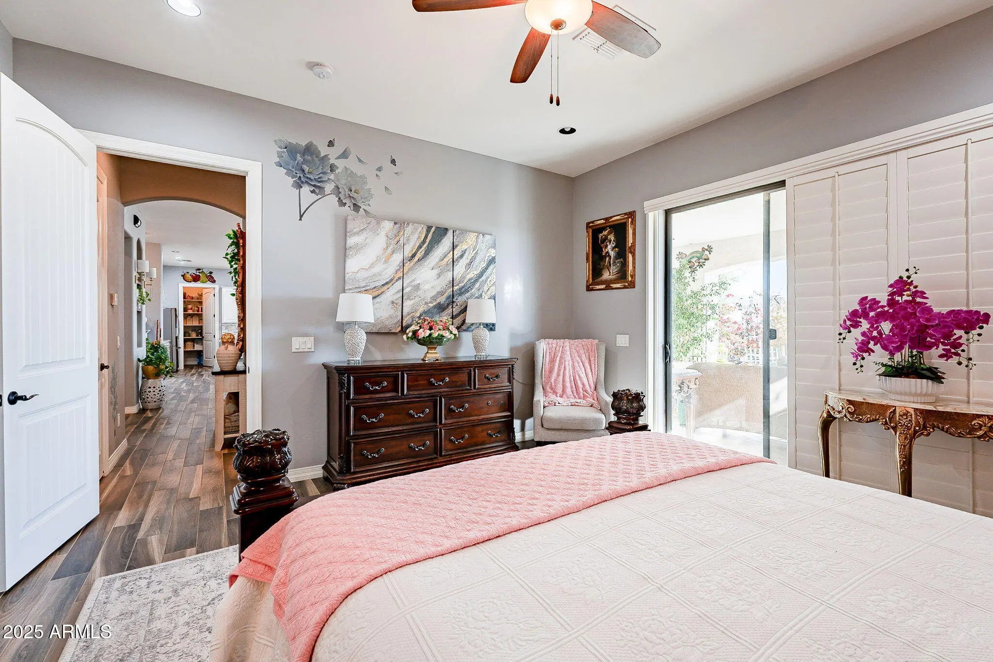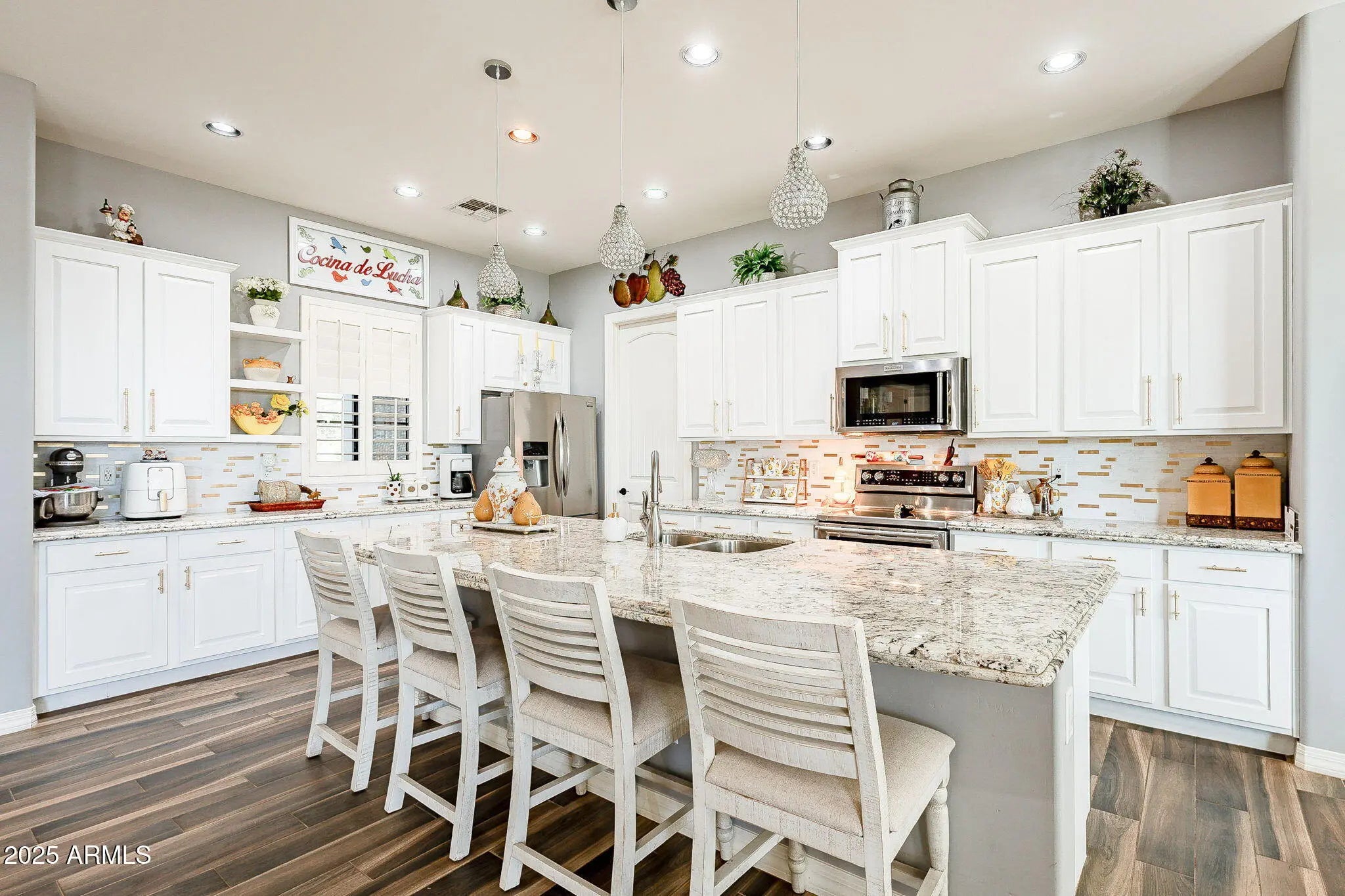 Better Than New! Nestled on a private street on a sprawling 1.25-acre lot, this stunning property offers breathtaking mountain views & is packed with upgrades—all with no HOA! Step inside to discover a thoughtfully designed split great room floor plan featuring wood-look tile flooring throughout, soaring 10-foot ceilings, 4-inch baseboards, accent walls, & surround sound pre-wiring. The gourmet kitchen is a chef's dream, boasting a HUGE island/breakfast bar, granite slab countertops with a custom tile backsplash, elegant 42'' alder cabinets with hardware, a walk-in pantry, & KitchenAid stainless steel appliances, including a smooth-top range & built-in microwave. The master suite is your private retreat with a separate patio exit, granite countertops, raised vanities with double sinks, a walk-in shower, & a spacious walk-in closet. Secondary bedrooms are oversized, with two featuring their own en-suite baths, perfect for guests or family. Step outside to your HUGE landscaped yard, complete with an extended covered patio with pavers, a gazebo, & a Tuff Shed. With plenty of room for a pool & toys, this property also offers RV parking. The garage cabinets provide additional storage, ensuring everything has its place. This home combines luxury, functionality, & spectacular views making it an absolute MUST-SEE!