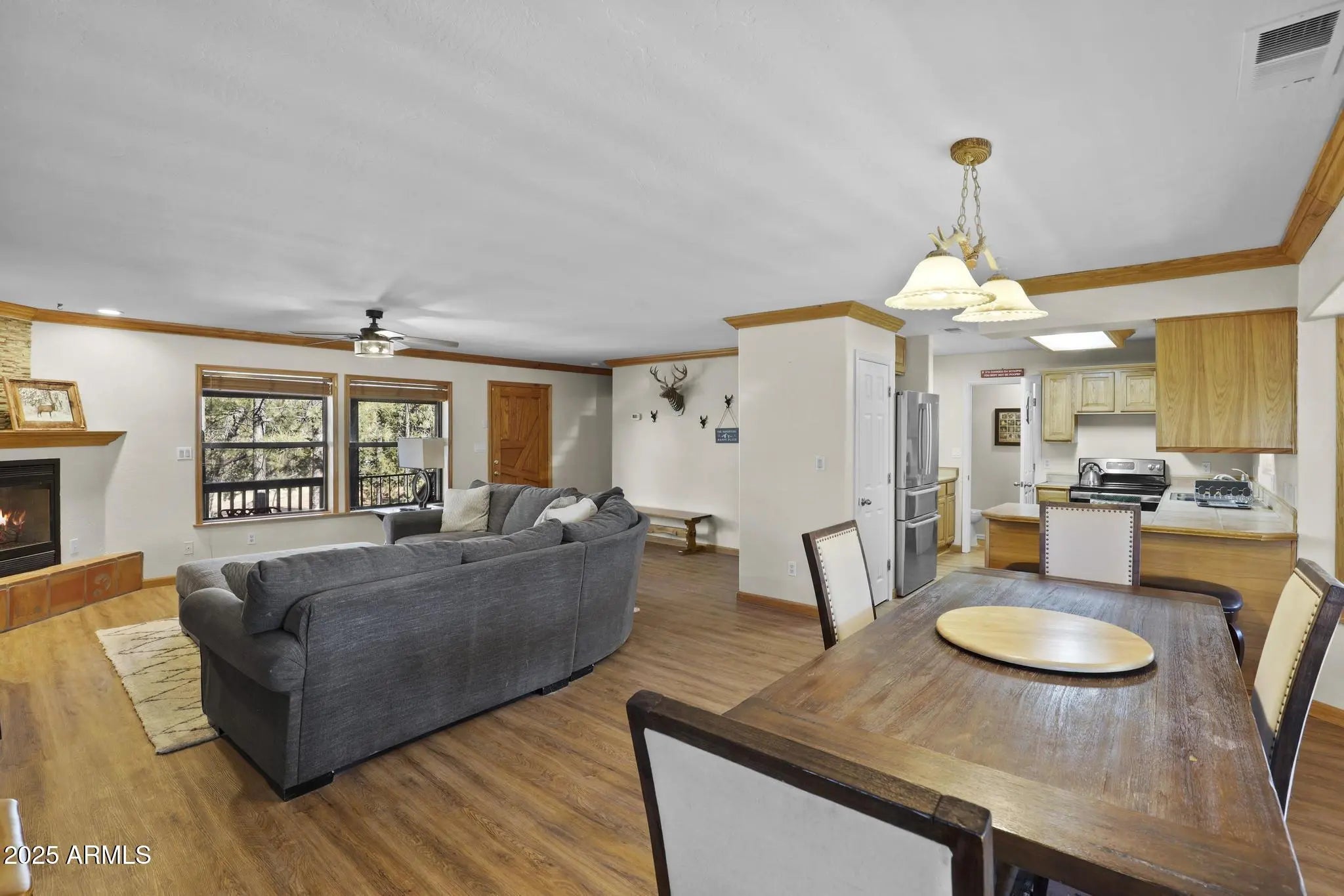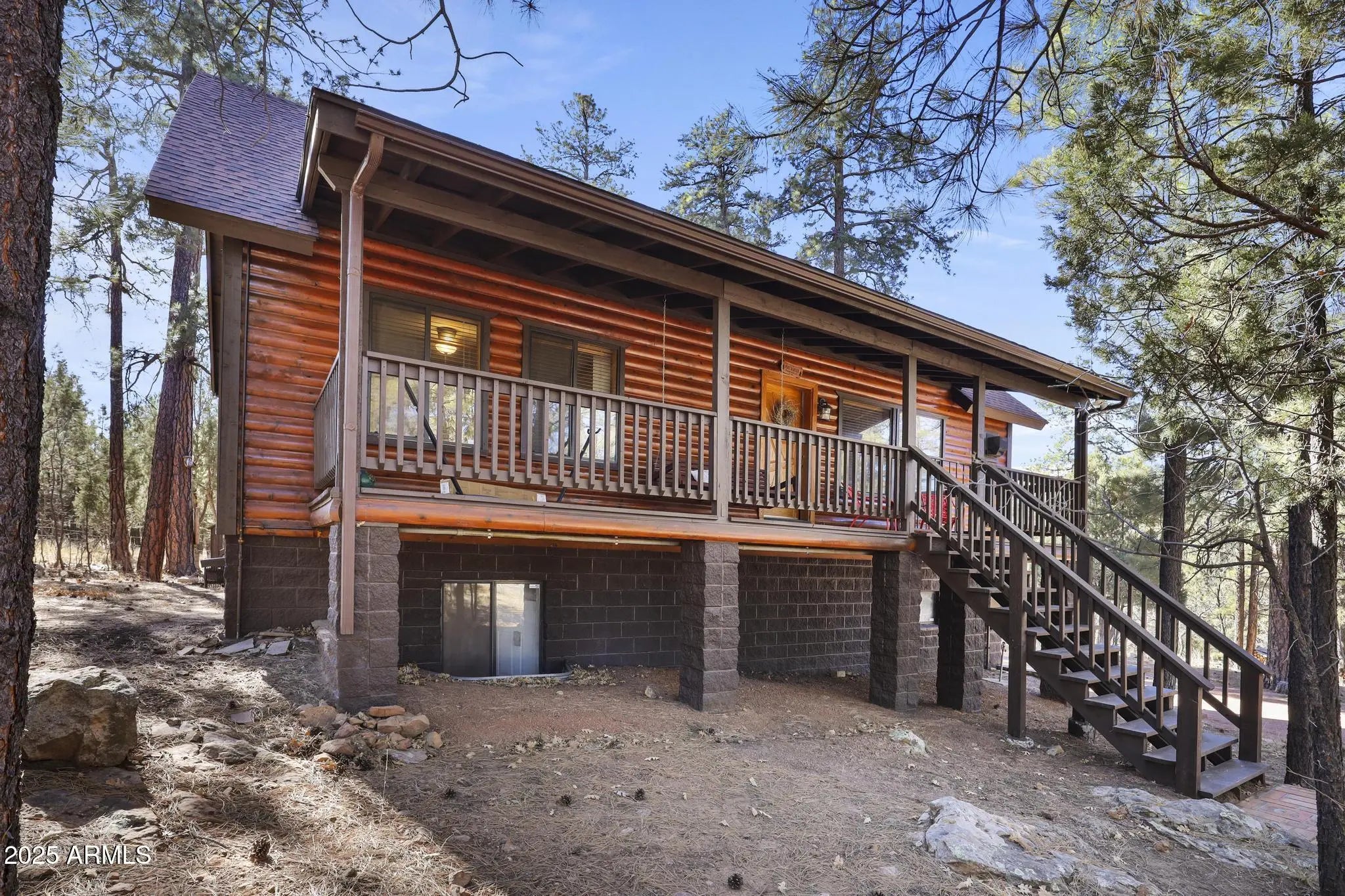 Welcome to your dream home in Happy Jack, AZ—a meticulously maintained single-family home that effortlessly harmonizes luxury and comfort. Set on almost an acre lot, this property is a haven for those craving both privacy and community, nestled within a prestigious fire-wise neighborhood brimming with mature trees. Step inside this spacious 3 story home and be greeted by an abundance of natural light filtering through great windows that seamlessly blend the interior with the scenic outdoors. The heart of the home boasts a stylish gas fireplace, creating a warm and inviting atmosphere for family gatherings. Enjoy the elegance of wood faux blinds, wood window trim, and crown molding throughout, which speak to the detail-oriented craftsmanship that defines this property. The spacious layout includes 3 beautifully appointed bedrooms, master on main living floor, and two and a half bathrooms, providing ample space for family and guests alike. The finished basement can be utililized many ways, as a large 4th bedroom (has 2 closets), a great bunkhouse for the kids, a large office, TV room or a versatile game room, offering the perfect retreat for entertainment or relaxation. The newly updated vinyl plank flooring is both chic and durable, enhancing the home's modern aesthetic while ensuring easy maintenance. With new appliances in the kitchen, preparing meals becomes a delightful experience, complemented by scenic views of your sprawling, lush surroundings. Kitchen has a breakfast bar as well as a large dining area for entertaining. The new roof ensures peace of mind, promising longevity and protection for years to come.Outside, the covered decks invite you to unwind and revel in your natural surroundings. Whether sipping morning coffee or hosting an evening gathering, the covered decks serve as an idyllic extension of the home's living space. A well-maintained exterior underscores the pride of ownership, while the dual garage offers abundant space for vehicles and storage featuring both an attached and a detached option to suit various needs., as well as another small shed for yard tools etc. Life in Happy Jack offers more than just a home, it's a lifestyle. Beyond your threshold, enjoy the serenity provided by the mature trees and expansive lot, or explore near lakes, reservoir, hiking and trail rides within a short drive. The community's rich and engaging environment speaks for itself. This property represents a perfect harmony of tranquility and luxurious charm, and it awaits your presence. Don't miss this opportunity , to make your dream home your reality! Furnished