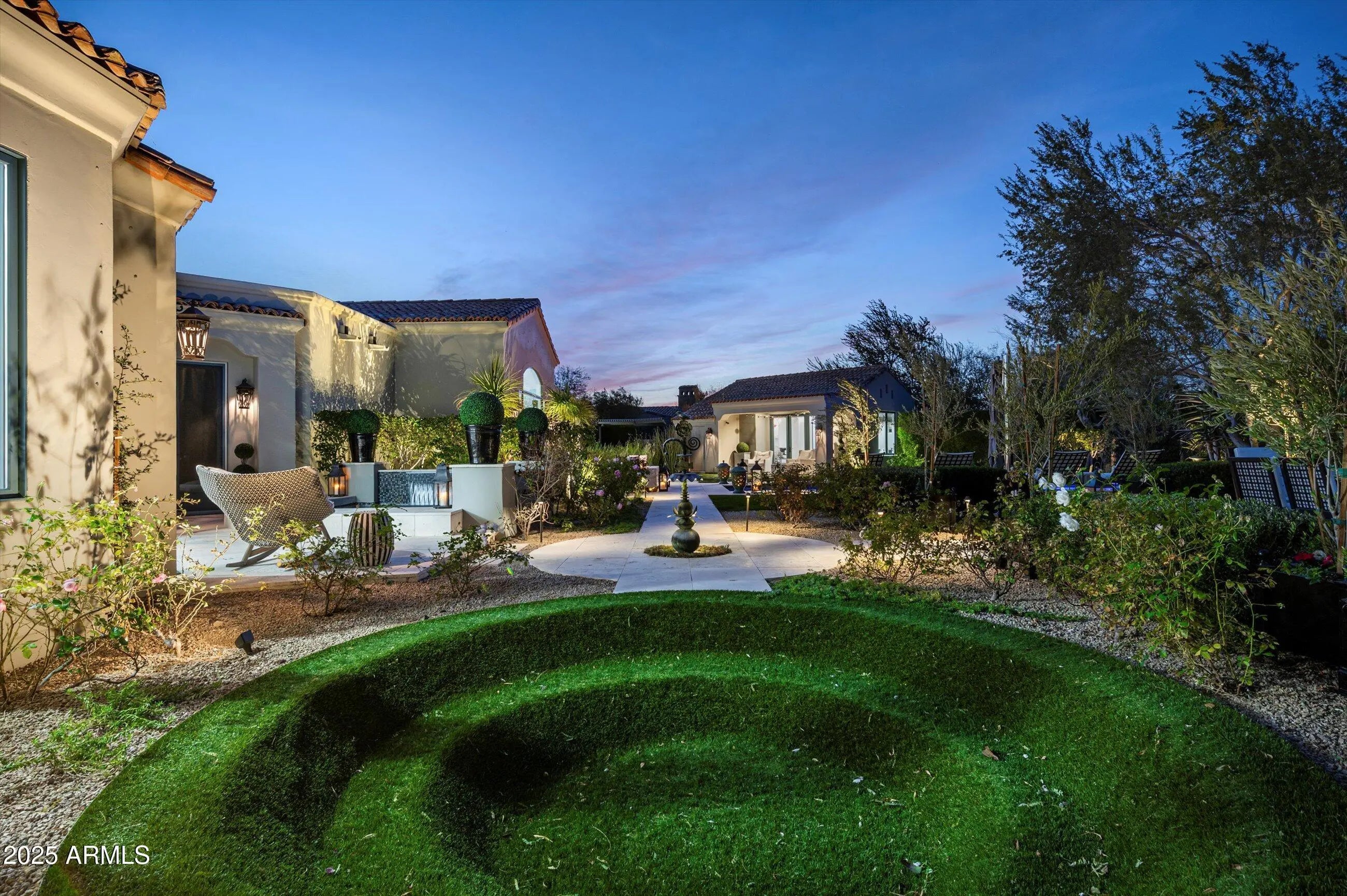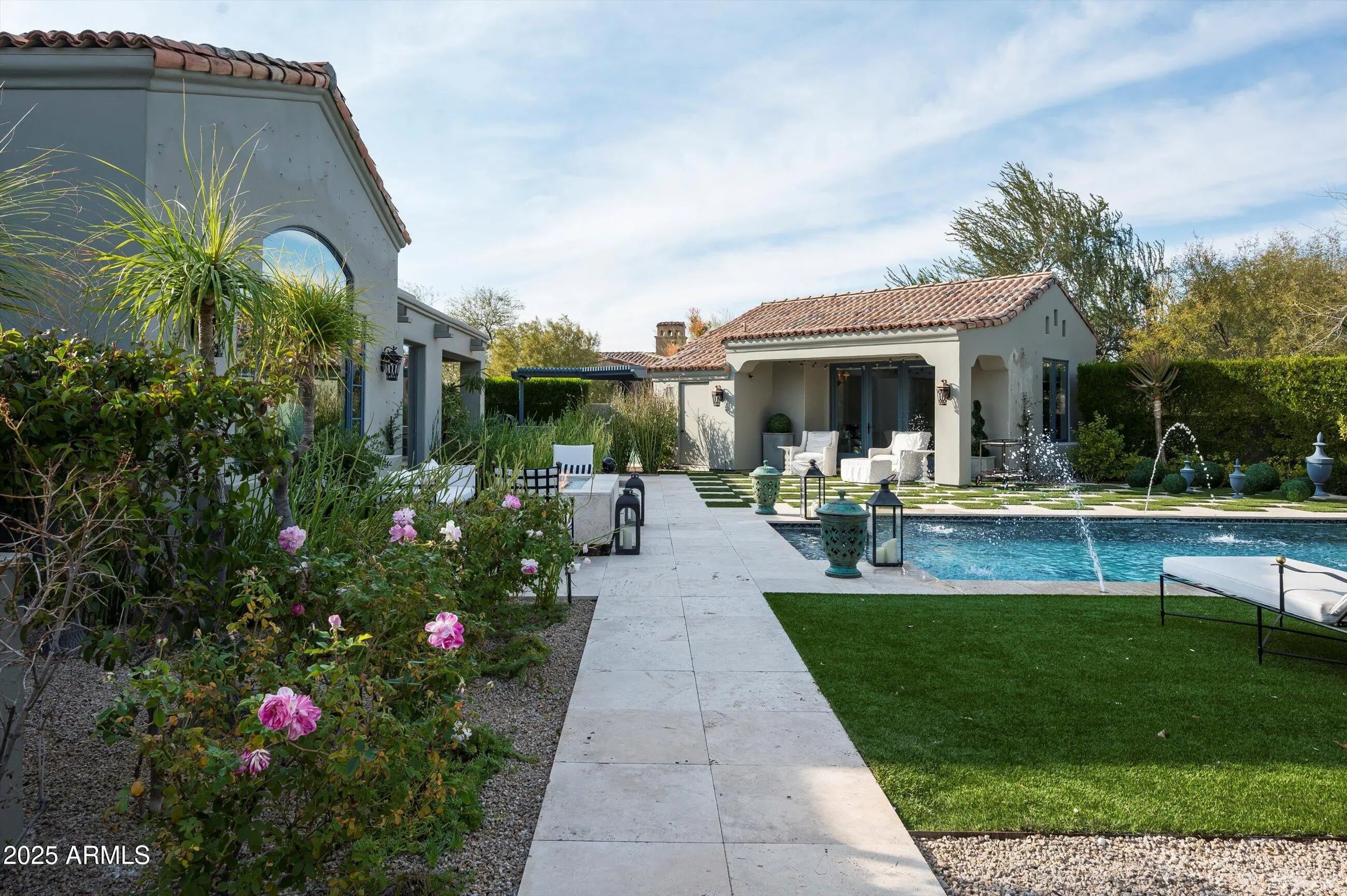 Graceful character and style, as if right out of a storybook, this custom one level estate is situated on a premium cul-de-sac homesite with an impressive approach and mountain backdrop in sought after Country Club at DC Ranch guard gated community. Renowned for its charming uniqueness, this masterpiece has been fully updated with meticulous focus on design detail and authentic finishes. With artistic diversity as a cornerstone, this extraordinary estate is one of a kind. Where resort meets fairytale, transport into a picturesque backyard with enchanting garden rooms defined with lush, manicured landscape and trees anchored with a striking pool with graceful deck streams. Get lost in the charming landscape, as each garden room unfolds into another one. Enjoy an outdoor eat in kitchen with pergola, separate stone deck dining area, turfed lounge area, prominent fire pit gathering area, turfed sunken conversation lounge, expanse with checkerboard stone and turf adds further appeal. Desirable home plan with detached guest house with living, bedroom and kitchenette, plus additional attached private entry casita, with sitting, flex/exercise room with two additional ensuite bedrooms split from primary suite. Spacious flex room with double built-in desk with command center, lounge and gathering areas with fireplace and wet bar, media/den off the grand family room with large, picturesque window bringing interior and exterior harmony. Marvel in the details from woodwork to wallpapers, first class finishes abound. Eat in kitchen with built-in corner nook boasts oversized island with state-of-the-art appliances including La Cornue gas range, double ovens, plus steam and microwave built-ins, warming drawer, 2 dishwashers, ice maker, and built-in fridge and freezer. Butler pantry with elegant temperature-controlled glass wine wall sits suitably between kitchen and dining. Private spa access off spacious primary suite with sitting area, hand laid Michael Aram tiled fireplace wall, with spirited spa like bath with free standing soaker tub and steam shower, three vanities, built-in Miele coffee bar, and dual wardrobes closets. First class finishes throughout with rich hardwood flooring to eye catching light fixtures, details abound. Captivating in every way, this is an exceptional property with distinct appreciation for elegance.