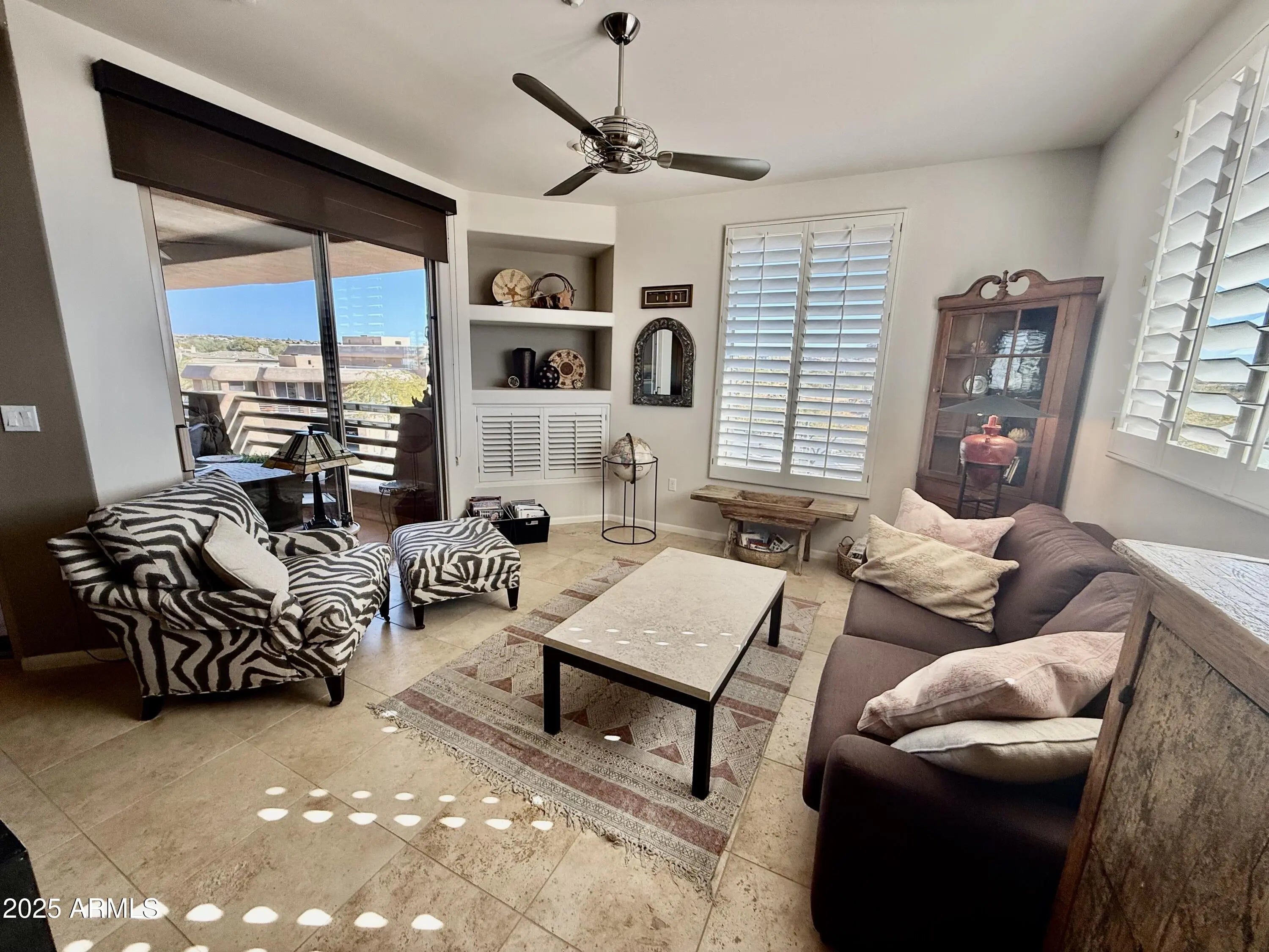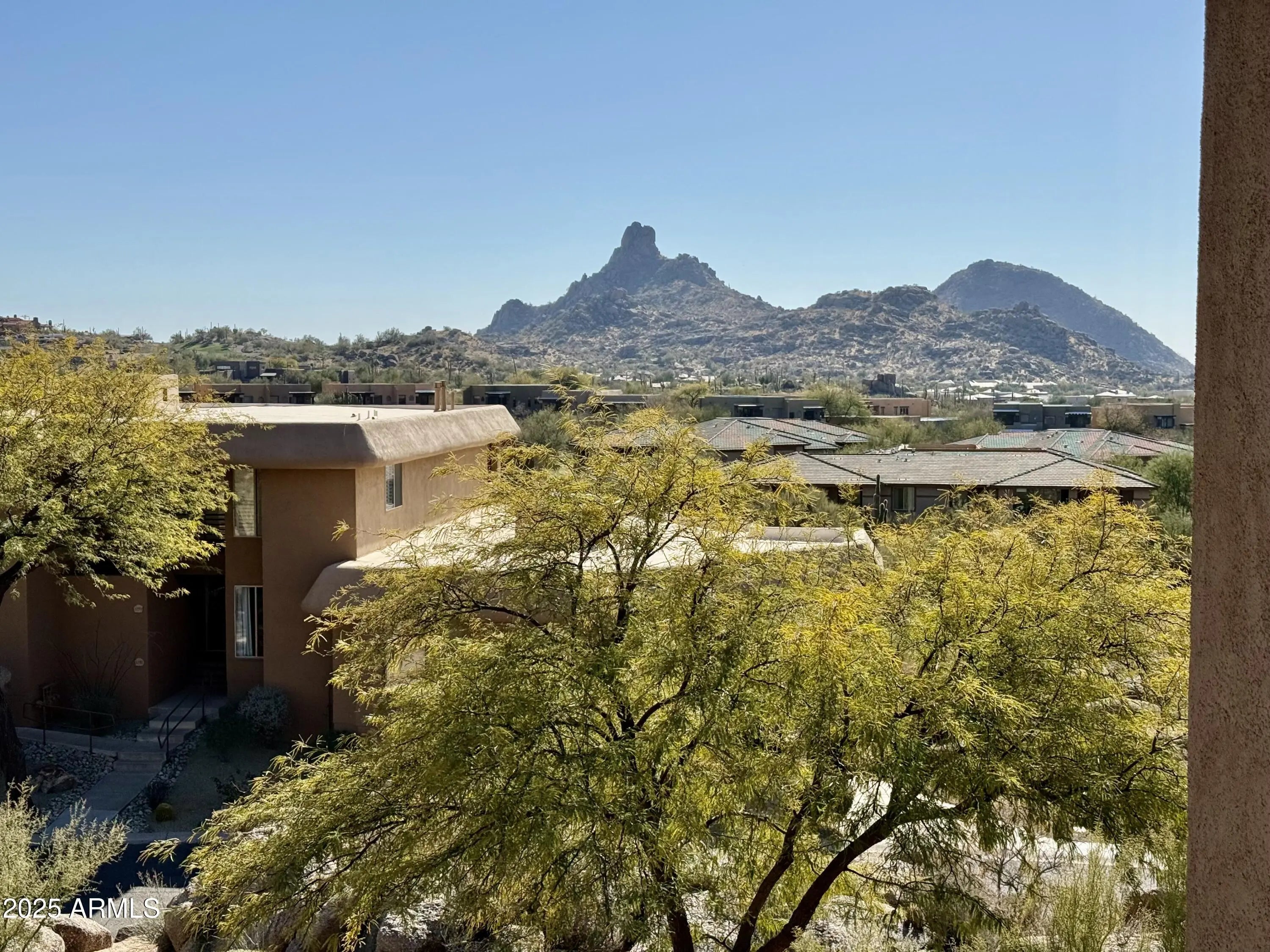 Experience the ultimate in desert living in this stunning top-floor villa, nestled within the prestigious Troon North Golf Community. Just a short walk to the clubhouse and restaurant, this 2-bedroom, 2-bathroom home with a den offers an open floor plan designed for comfort and style. Step inside your private elevator and arrive at your exclusive one-level retreat, where expansive desert views, including the iconic Pinnacle Peak and twinkling city lights, create a breathtaking backdrop. The spacious covered patio provides a peaceful setting to relax and take in the serene surroundings. This luxurious, Zen-like oasis is perfectly situated near the community pool and framed by stunning boulder outcroppings, offering a tranquil yet sophisticated escape. Inside, a gas fireplace adds warmth and ambiance, complementing the tasteful furnishings that make this villa feel like home. Available immediately and brand new to the seasonal market, this exceptional residence is ideal for those seeking a quiet, upscale lifestyle with easy access to world-class golf, hiking, biking, dining, and shopping. Don't miss this rare opportunity to enjoy the beauty and luxury of Troon North!
