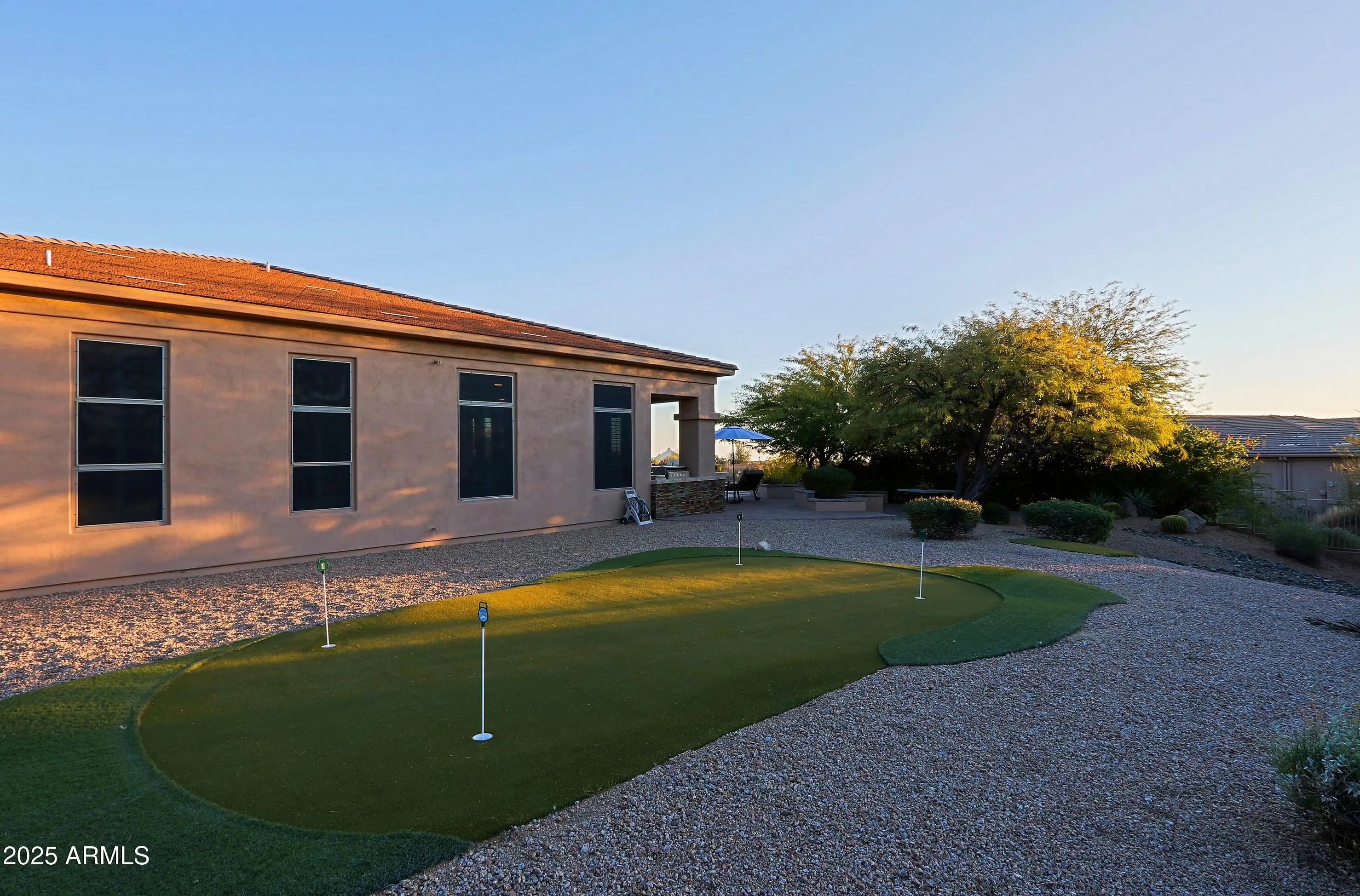 A home with so many exquisite features! Three bedrooms, 3.5 baths, den, study/library, large backyard and side yard with putting green, pool, spa and open spaces! Paved driveway to auto court and covered front entrance with an elevated frontage. Step into a lovely domed foyer with views to the living room, formal dining room and multiple windows to outdoor splendor and welcoming patio with pool. Livingroom has walled stone fireplace and hearth. Each side has designer niches. An inviting lounge area off foyer with built-in beverage bar (wine cooler and ''cask''). Shelving unit with unique display cabinet! Kitchen is stunning! Beautiful stone island with floating stone sides. Light toned cabinets accented with great backsplash. Charming sitting area at exit to patio. Click MORE Walled ovens, large built-in refrigerator, vented hood over gas range top. Open to great room. Kitchen and great room have doors to patio area and the convenient outdoor kitchen with grill, refrigeration, counter for seating. Hallway off kitchen to powder room with pedestal sink and decorator tiled wall. Double doors take you into primary bedroom and bath area. Carpeted spacious area. Doors to patio. Barndoor to primary bathroom. Split dual vanities. Wash/dryer in middle for convenience! Dressing area. Dual walk-in closets. Bedroom 2 and 3 both have own bathrooms with walk-in showers. Large den with wall of built-in shelving and drawers. Laundry room has counter space and storage space. Backyard paradise: Large pool with water features, raised area with spa and seating; another raised sitting area with matured plants in retainer wall. Two covered patio areas - one with the outdoor kitchen. Mountain views in distance and totally open and private space. Mature and manicured landscaping providing beauty, tranquility, and privacy. Gorgeous home on perfect lot with perfect design and amenities!