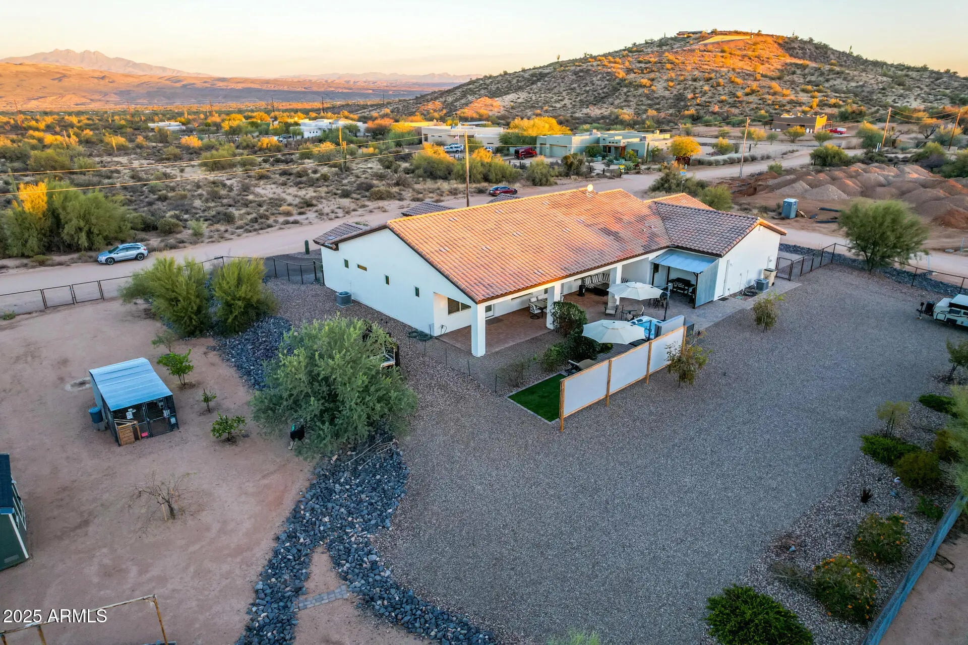 Experience refined desert living in this custom-built home on a fully fenced 1-acre lot in the coveted Rio Verde Foothills. Enjoy panoramic mountain views, NO HOA, and the convenience of EPCOR water—no hauling required. This elegantly designed single-level residence boasts 10-ft ceilings, sleek tile flooring throughout, and a luxurious primary suite with spa-style bath and expansive walk-in closet. The oversized 3-car garage, private hot tub, and entertainer's backyard elevate outdoor living. Additional highlights include a ready-to-plant irrigated garden, enclosed chicken coop, and 8x10 storage shed. Minutes from premier golf, Tonto National Forest, and endless recreation.