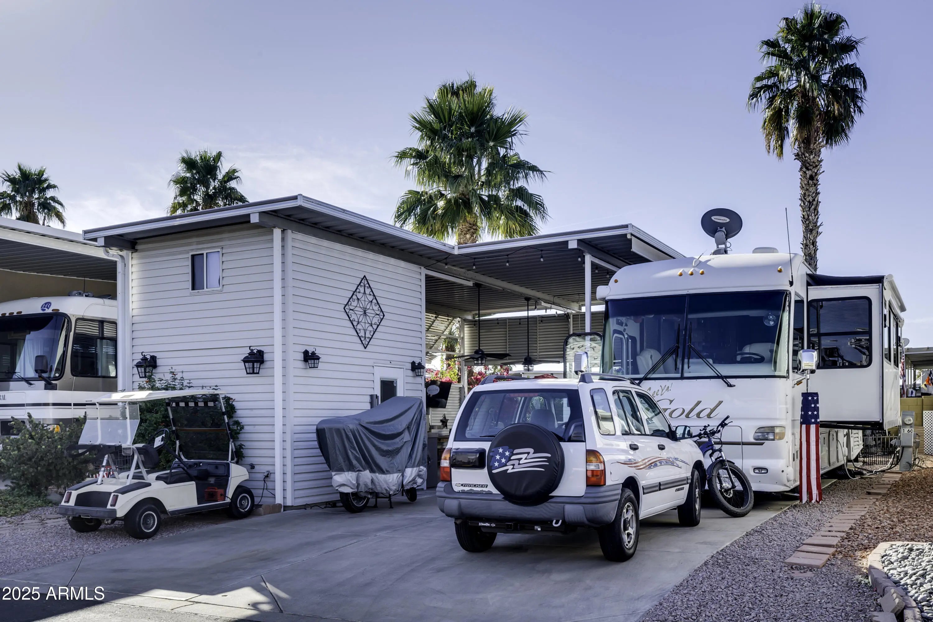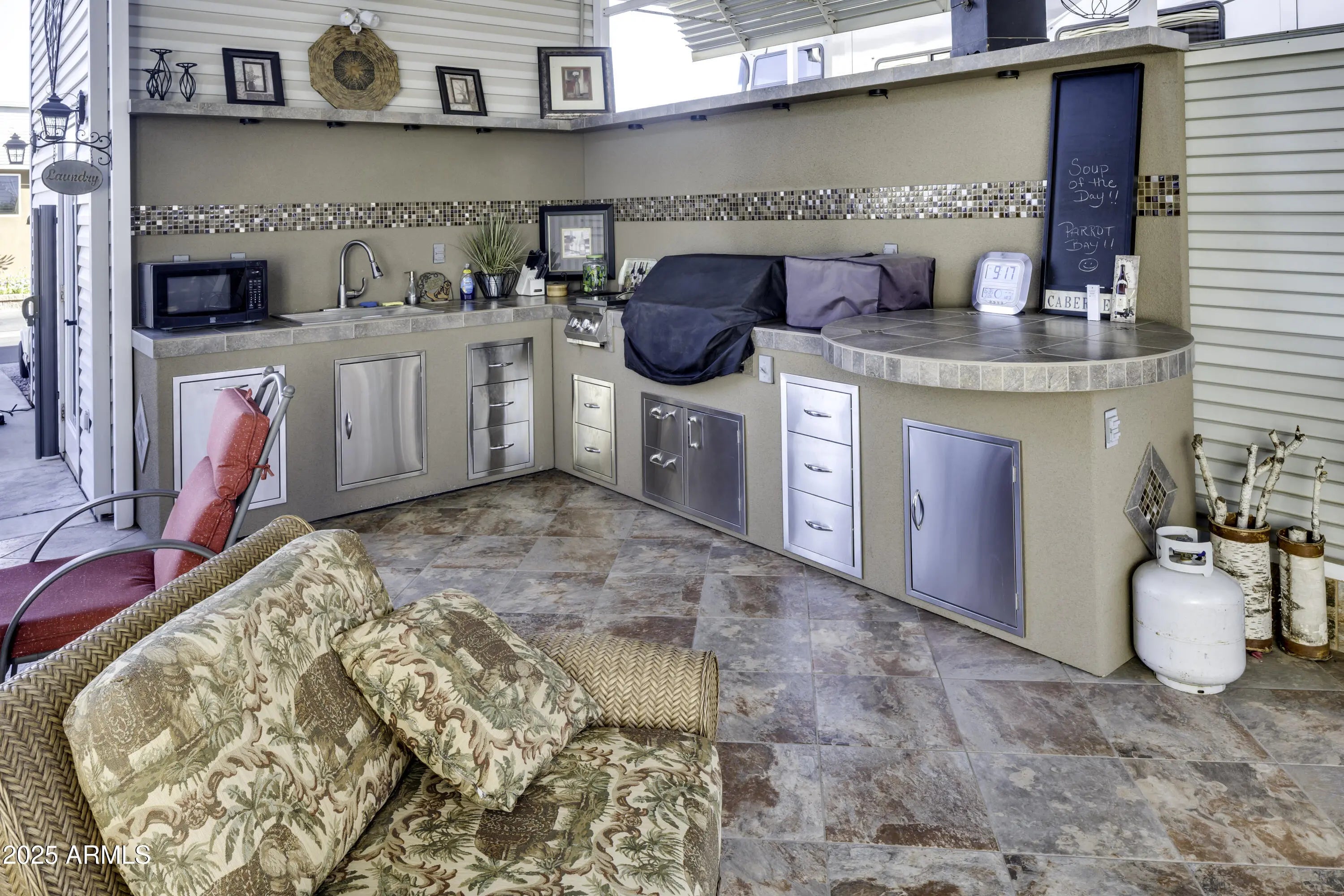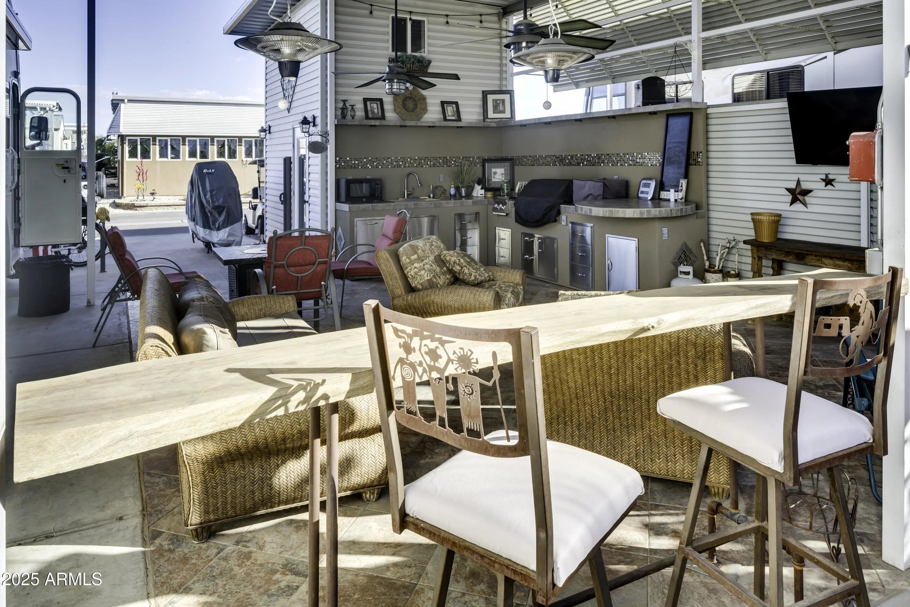 THIS RV LOT IS THE JEWEL OF THE RESORT. PRIVACY CREATED ON AN INTERIOR WALL. A DESIGNER KITCHEN HAS BEAUTIFUL STAINLESS CABINETS, GREAT BUILT-IN BBQ AND COOKTOP, CLASSY TILE COUNTERS WITH BAR SEATING, SINK, DISPOSAL AND DISHWASHER. ENJOY THE TILED OUTDOOR PATIO AREA FOR ALL TO ENJOY WITH TWO FANS TO KEEP YOU COOL. PATIO AREA ALSO HAS AWNING DROP DOWN SCREENS FOR LOTS OF PRIVACY. A TWO STORY SHED HAS STACKABLE W/D, REFRIGERATOR/FREEZER/ , LOTS OF CABINET SPACE AND AN ENCLOSED TOILET. ROOM FOR ALL YOUR EXTRAS IN THE SECOND FLOOR. AND DID I MENTION THERE IS A HOT TUB!!!!!! THIS PLACE HAS IT ALL.