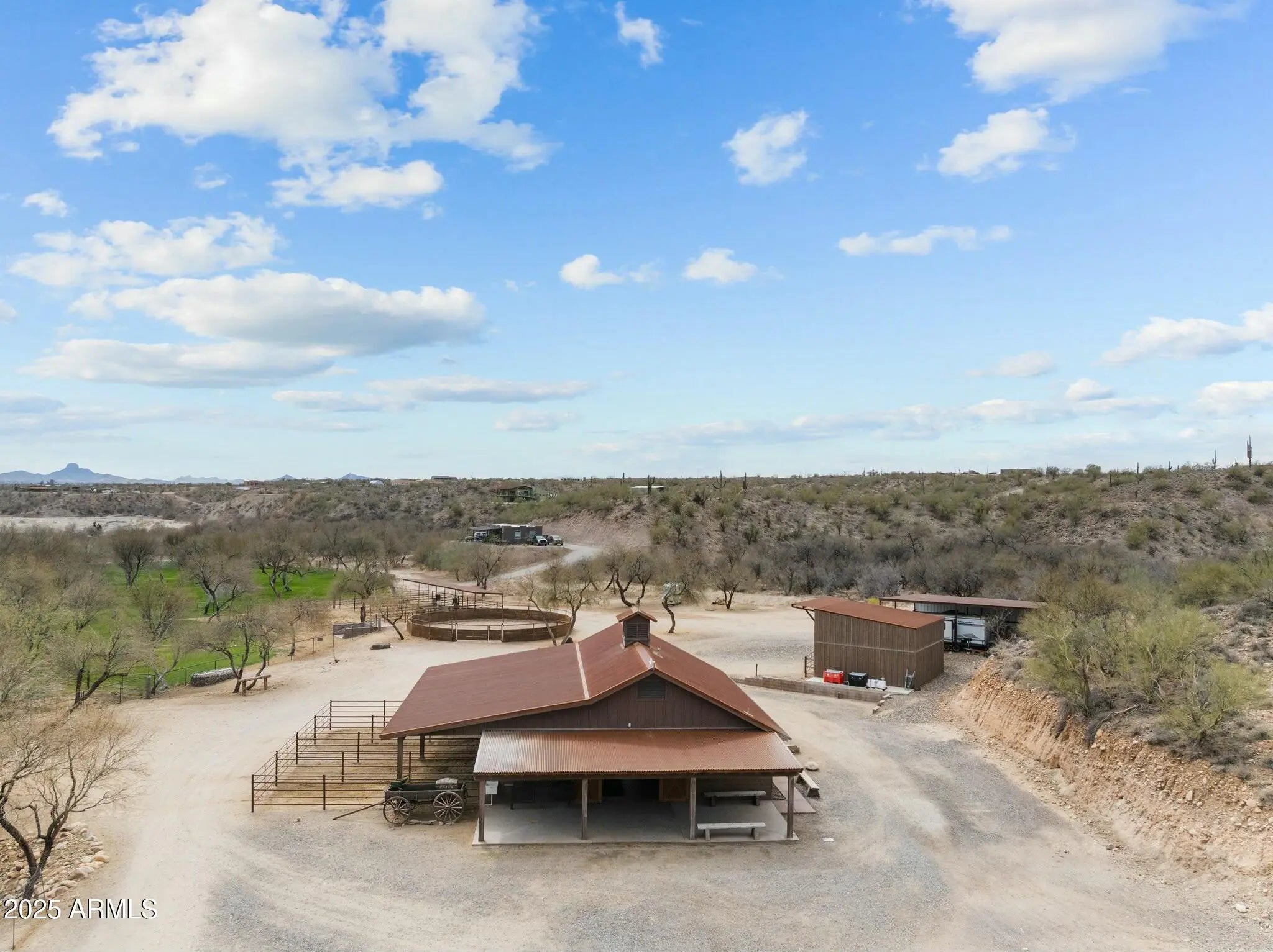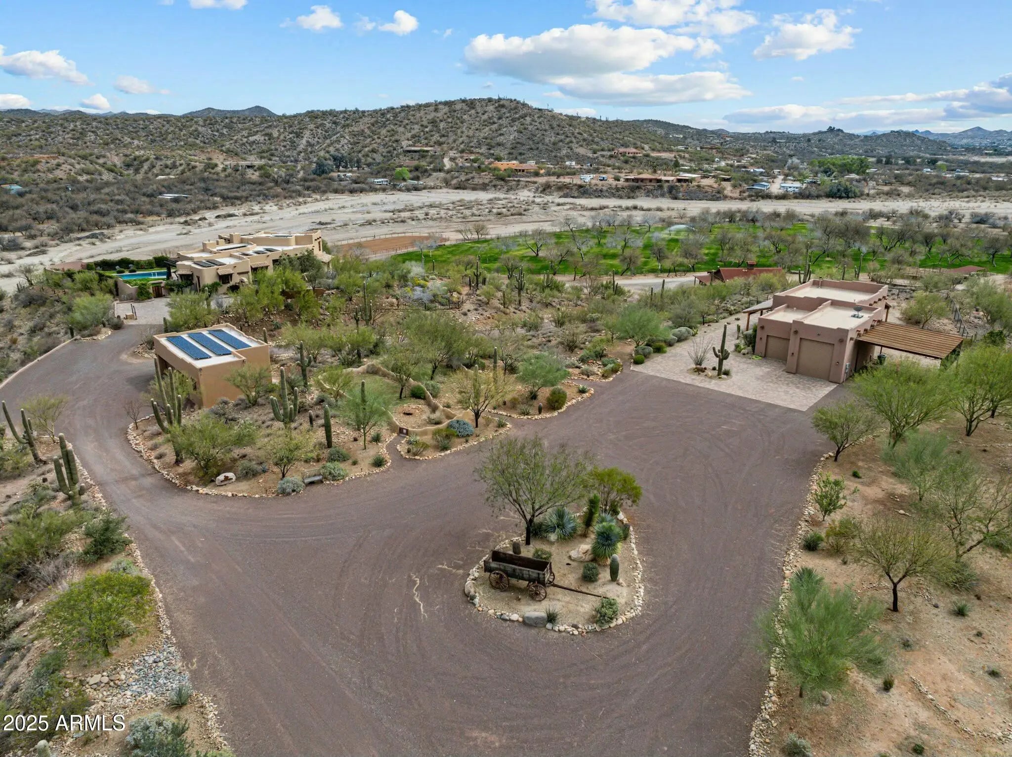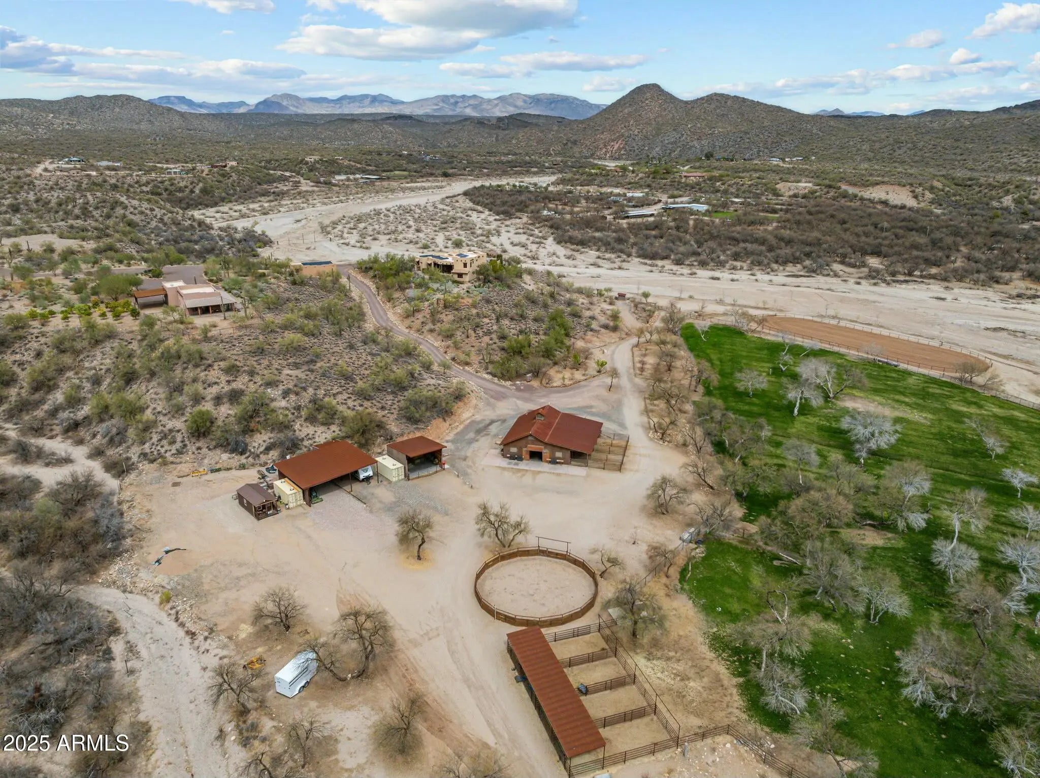 Premium Equestrian Estate! Stunning Territorial/Santa Fe Home designed by Chaves & Associates. Sitting overlooking the Hassayampa River in stunning desert surrounded with killer views. Primary home offers just under 4000 square feet of Western décor living space, 3 bedrooms plus a den or 4th bedroom. 4 full baths. Primary suite split floor plan. Large open floor plan with a gourmet kitchen with Granite countertops, custom made cabinetry, and breakfast bar. 3-car garage with workshop. There's a heated pool and above ground hot tub. Property includes an 1100 square foot 2-bed 1-bath casita with 2-car garage, plus RV garage and two vehicle carport. Approximately 9 acres of divided, fenced (2-acre) irrigated pastures, with plenty of mature mesquite trees for wonderful shade. There's an excellent 4-stall mare motel that can be divided to make 8 stalls, and a round pen. There's a barn with 4 stalls, turnouts and a wide breeze way, a complete apartment and plenty of storage. There's a large tack room with wash bay and a large, covered porch There's an equipment barn, hay barn, two sealed sea-crates for grain storage. Caretakers housing is 1-year-old 1500 square foot double wide modular home. Property is located at the end of Tellier Trail very private and quiet rancho that is only 10 minutes from downtown. With miles of riding trails in your backyard. This is a perfect must see for the anyone with Equestrian needs in Wickenburg's thriving horsemen's world.