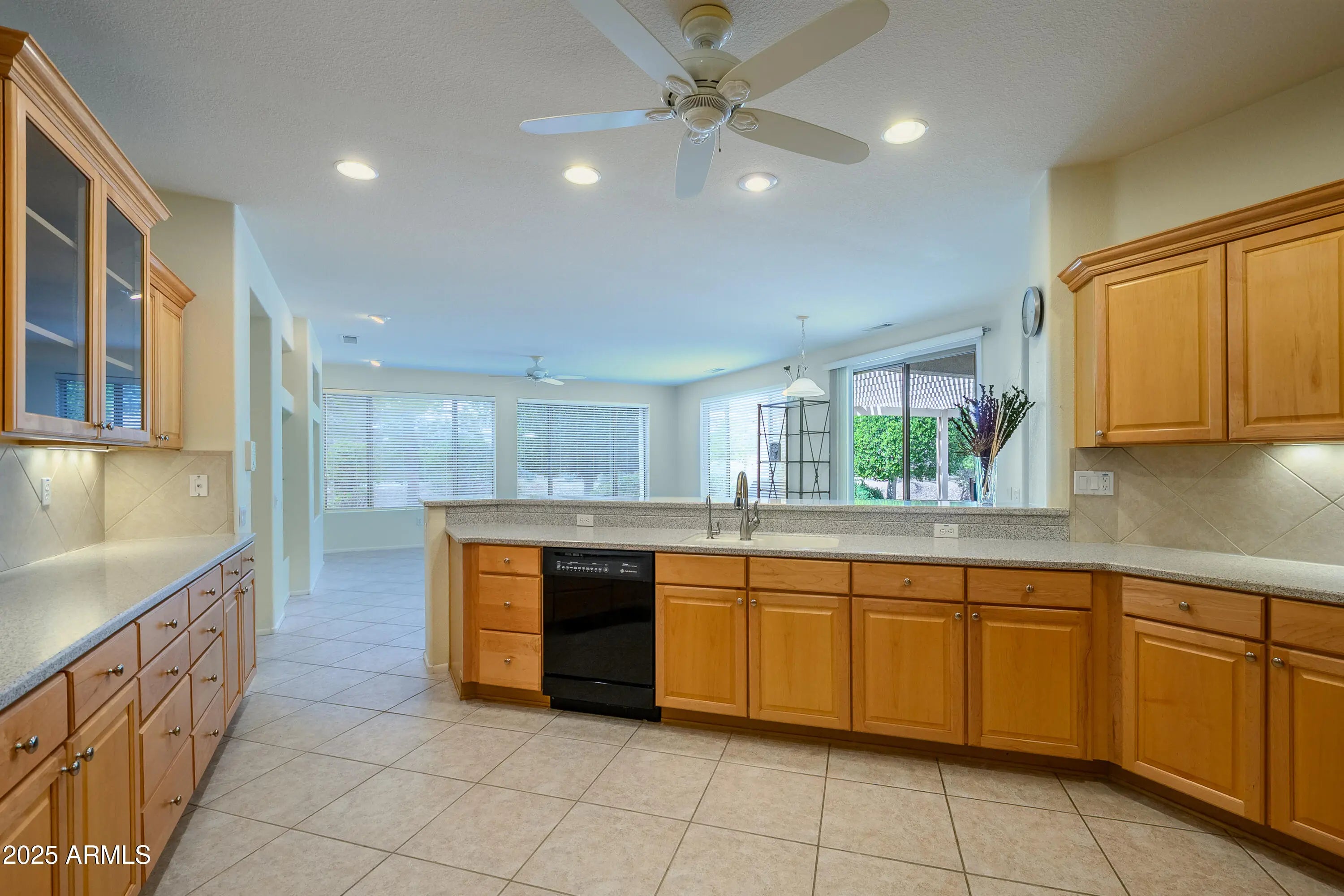 Sun City Grand Stonecrest floorplan home, 3 bedroom 2 bath with Primary bedroom on opposite side of the home. This home has a comfortable sitting area at the front courtyard, as you enter the home you will find vaulted ceilings, Media wall, Tile & carpet in all the right places. The kitchen has Granite countertops, Maple Cabinets and Black appliances. NEW HVAC UNITS JULY 2025.