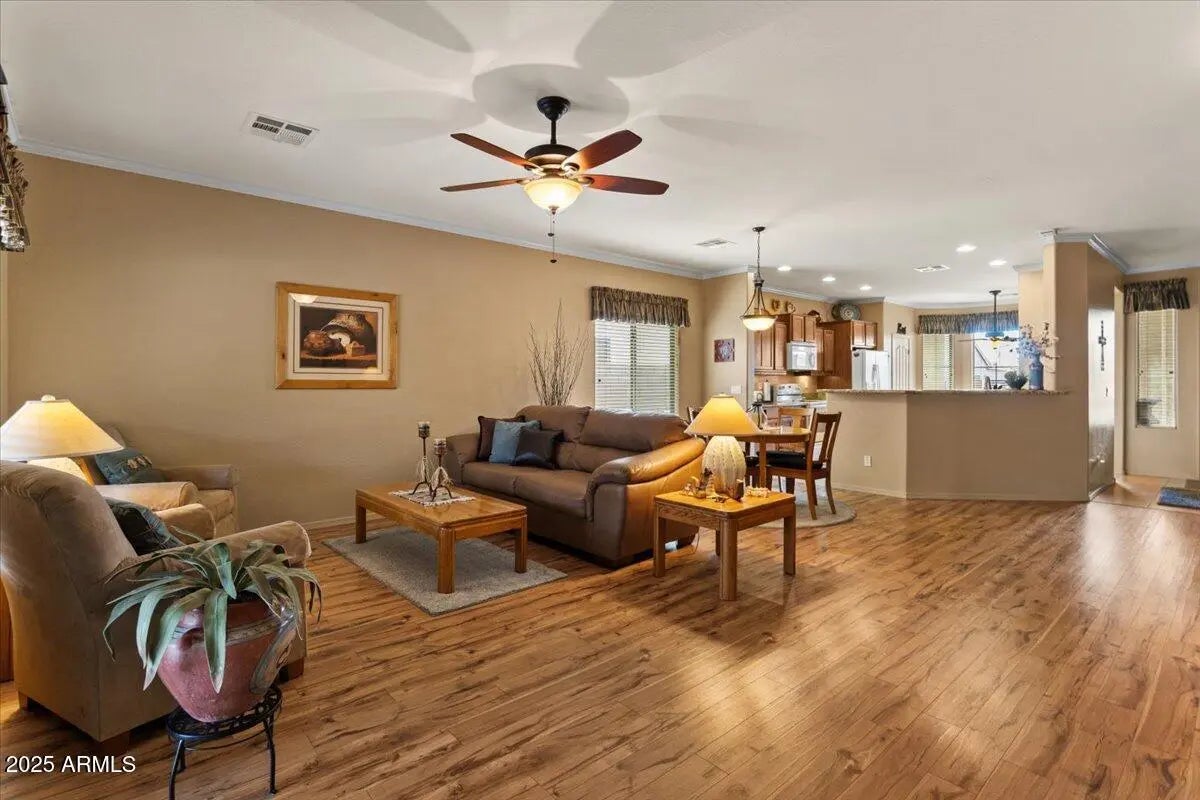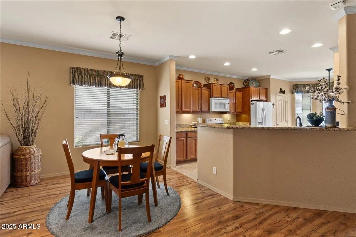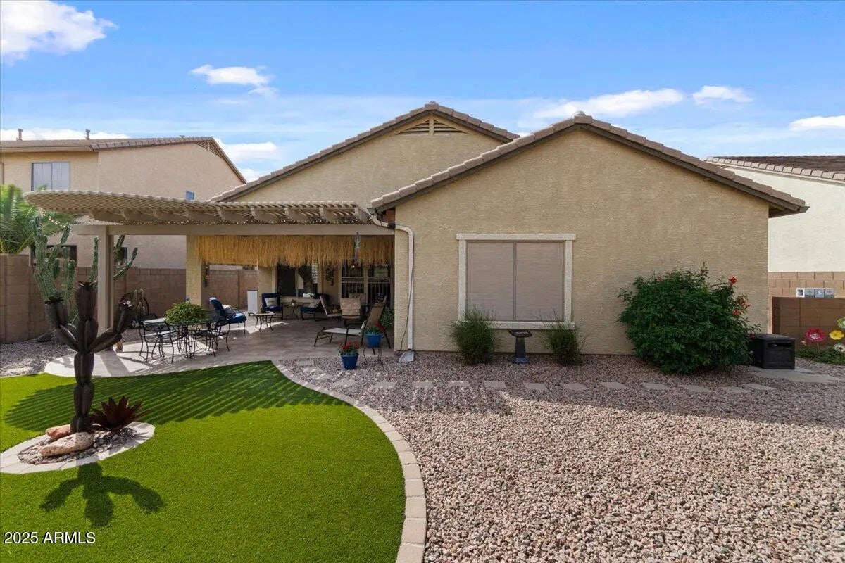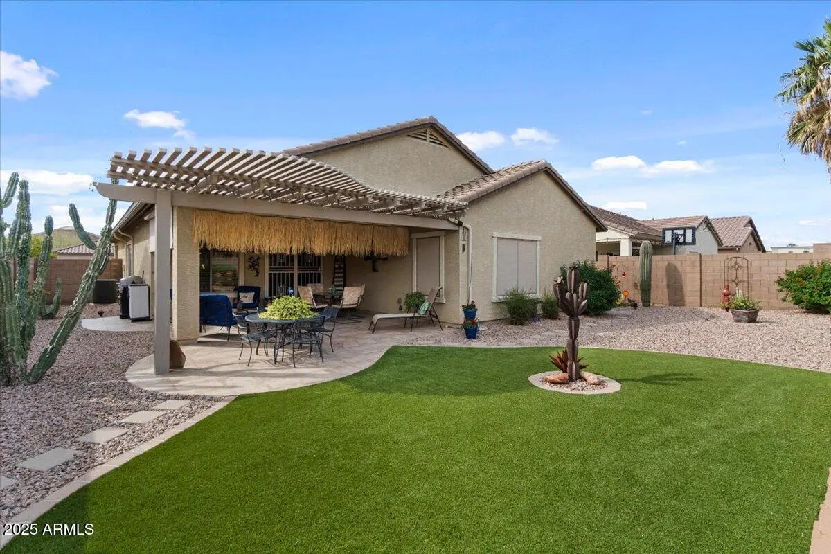 Prepare to be impressed! This charming home boasts numerous upgrades, featuring a spacious kitchen with ample storage, white appliances, and a sunny breakfast nook. Durable hard flooring in high-traffic zones complements plush bedroom carpets. Elegant crown molding enhances the interior. The living room flows seamlessly to a delightful backyard with synthetic grass and a pergola-covered patio, ideal for outdoor enjoyment. The expansive primary suite offers a luxurious bath with dual sinks, a separate shower, and a garden tub. The garage is equipped with built-in cupboards and a shop sink for added convenience. Enjoy a prime location near schools and shopping in the desirable Villago community. List of upgrades in the document tab
