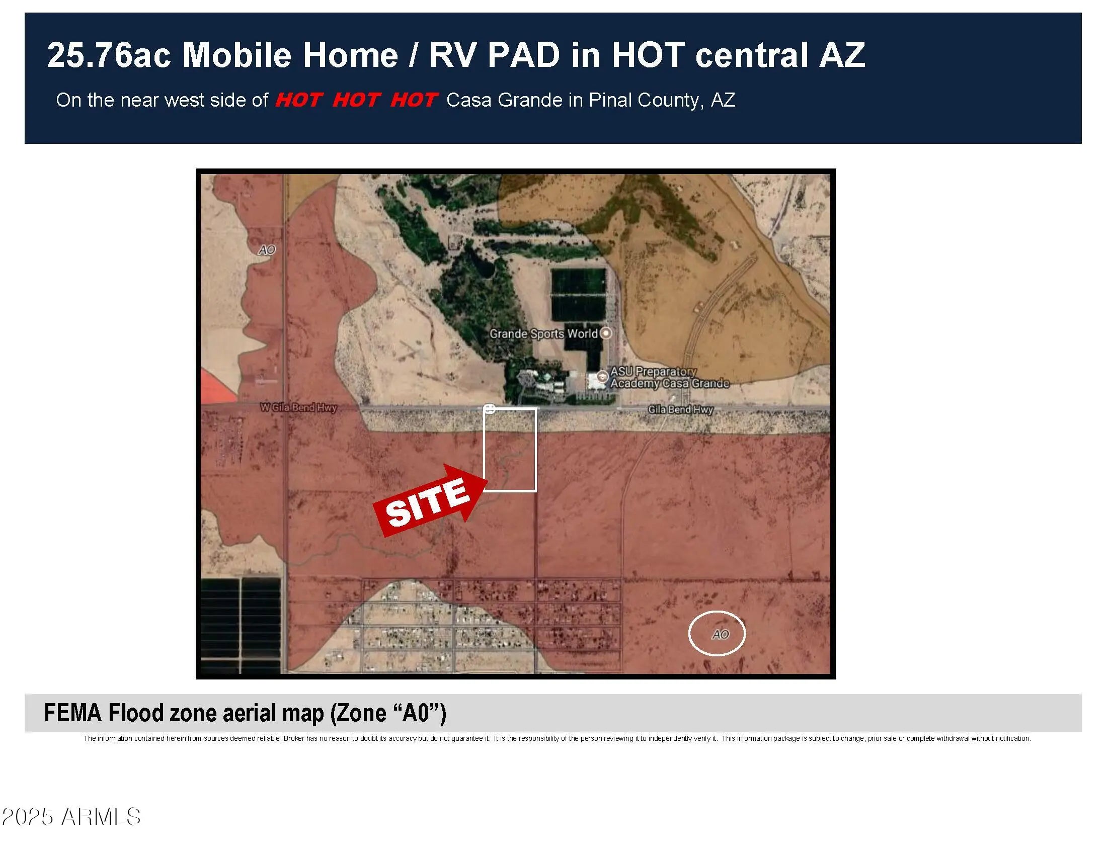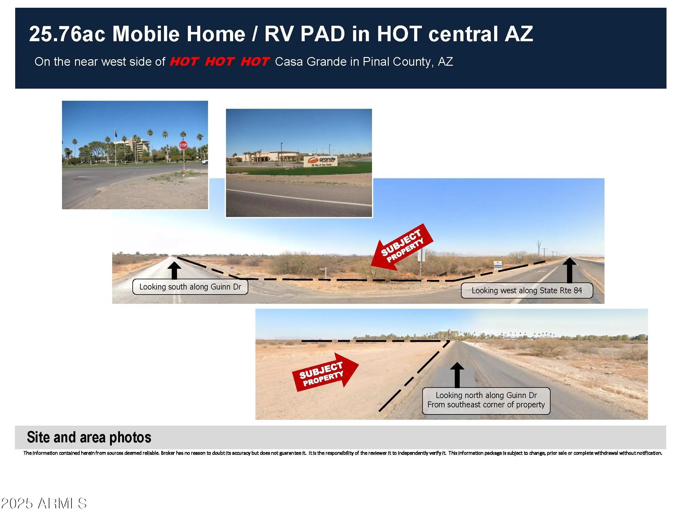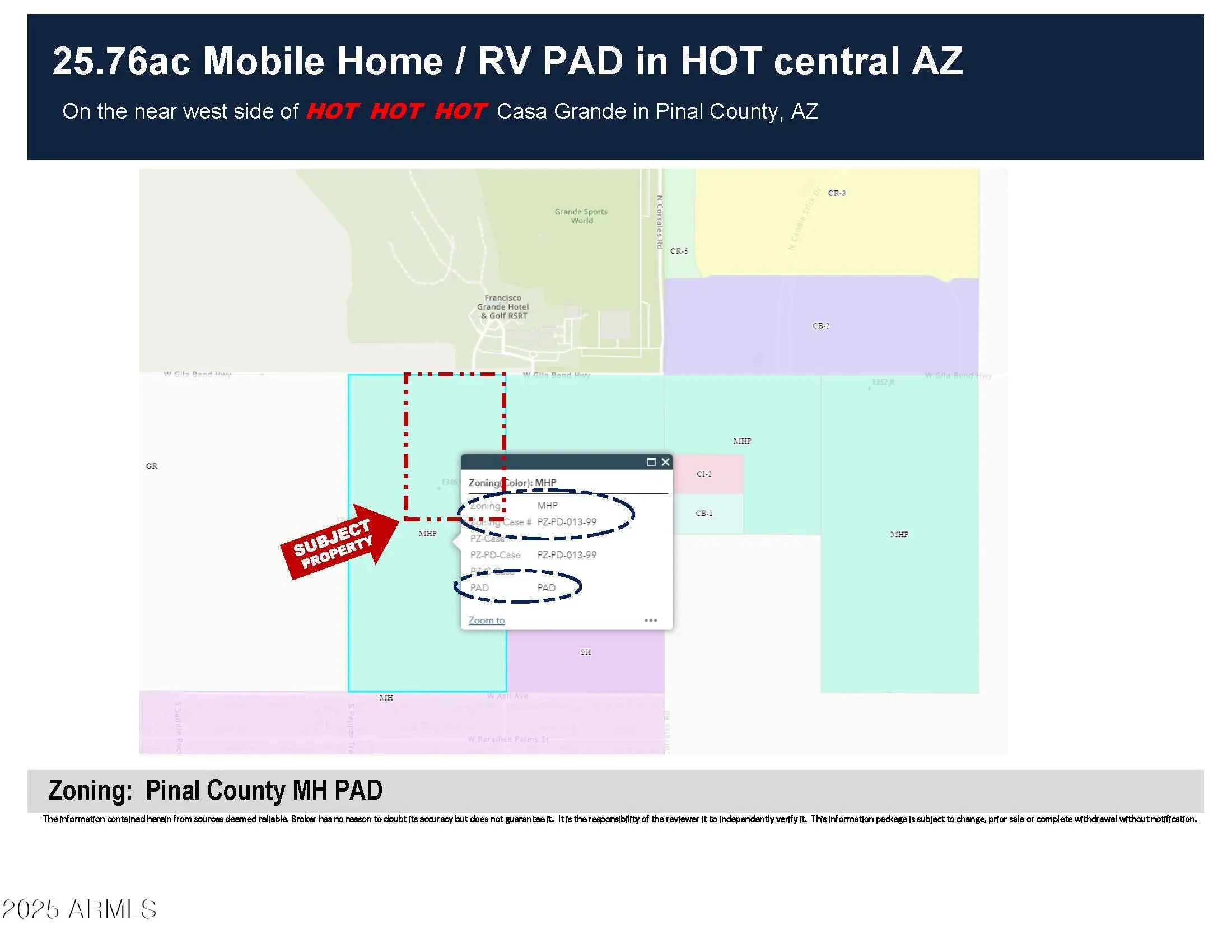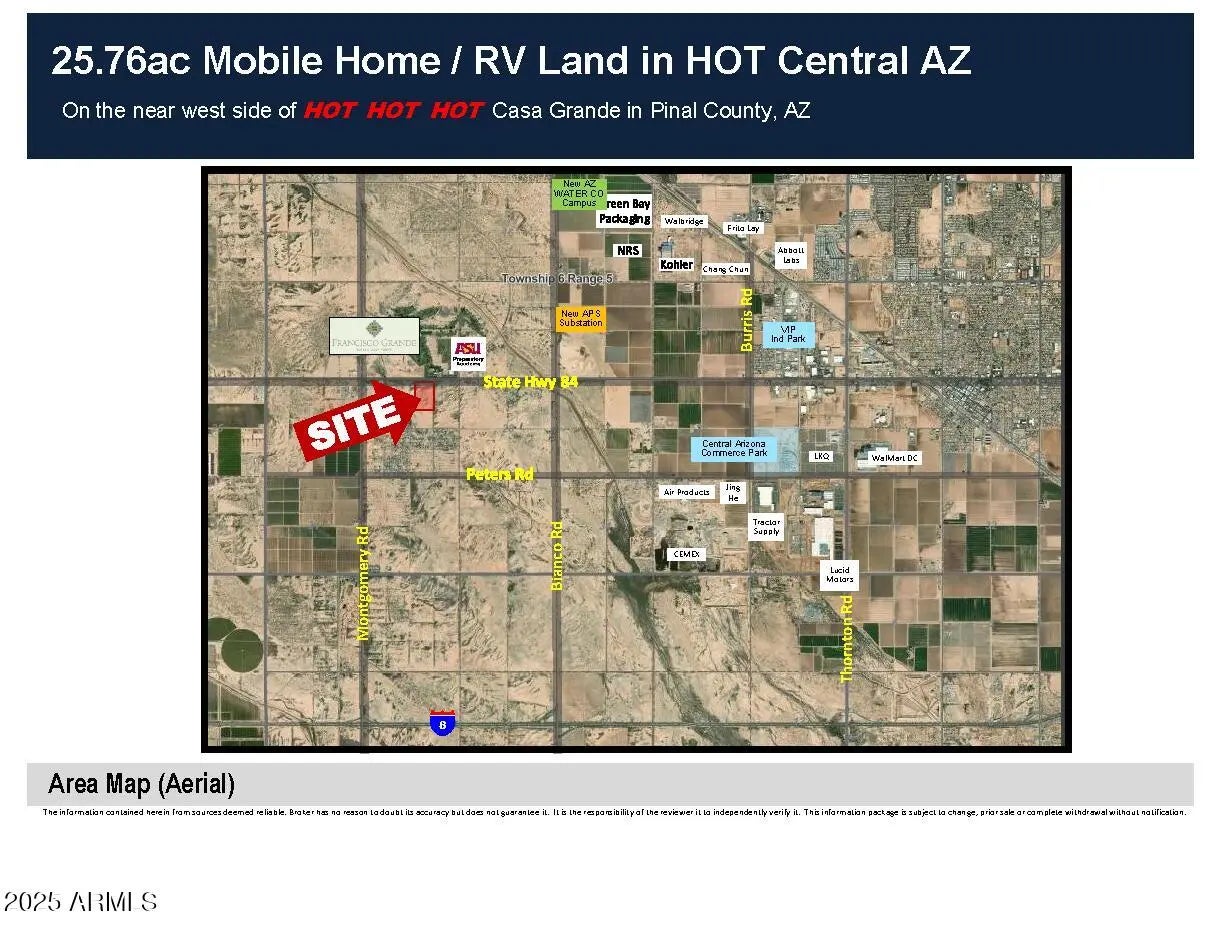 25.76ac Mobile Home / RV Land in HOT Central AZ Looking for a development parcel in the Path of Progress? This is it. Build your dreams on this parcel directly across AZ State Hwy 84 from the Francisco Grande Resort with frontage on two paved roads, power all around, a water main along the east boundary (Guinn Dr) and MH PAD zoning (Pinal County) ... what are you waiting for? MH park, RV, workforce housing, pick any combination and roll your own!