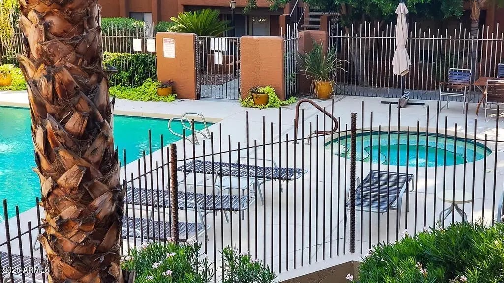 Occupied until 3/31/25, available 4/1/2026. Fantastic 2 bedroom, fully furnished condo! This poolside 1st floor unit overlooks the community greenscape from its private front patio, just steps away from the pool and spa. Upgraded kitchen with oversized breakfast bar open to the dining area and living room for a light and bright feel. Large laundry room off kitchen with tons of space for storage! Primary bedroom has a large King size bed, 2 closets and smart TV. The second bedroom has a Queen size bed and large closet. This community is located right across the street from the new PV Development and right in between the 51 and 101 freeways - this is the perfect spot for traveling professionals, close to mountain preserves for hiking, great restaurants, golf courses, and retail shopping.