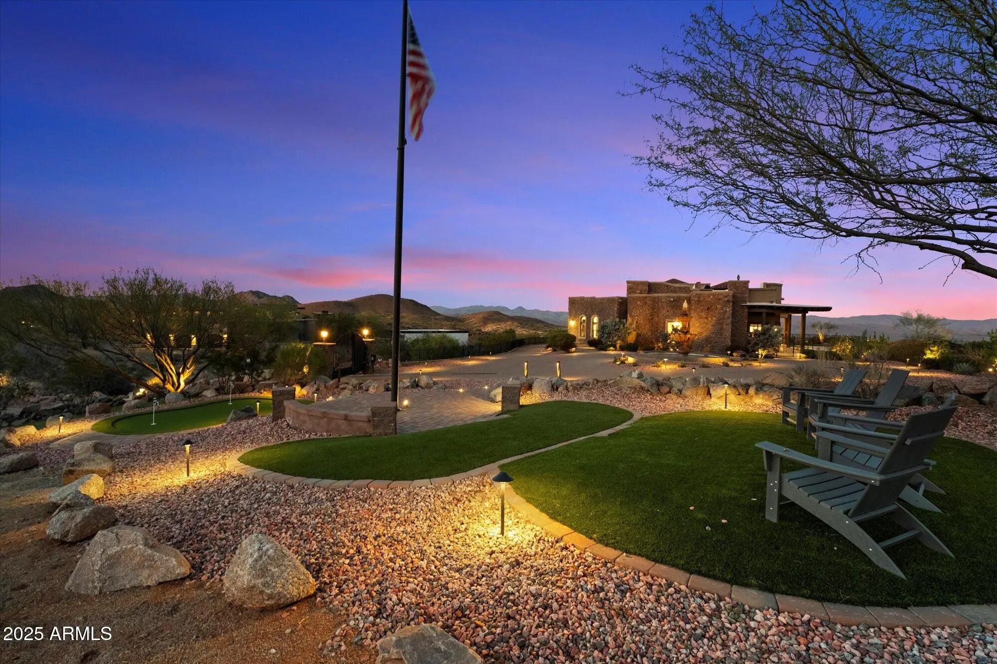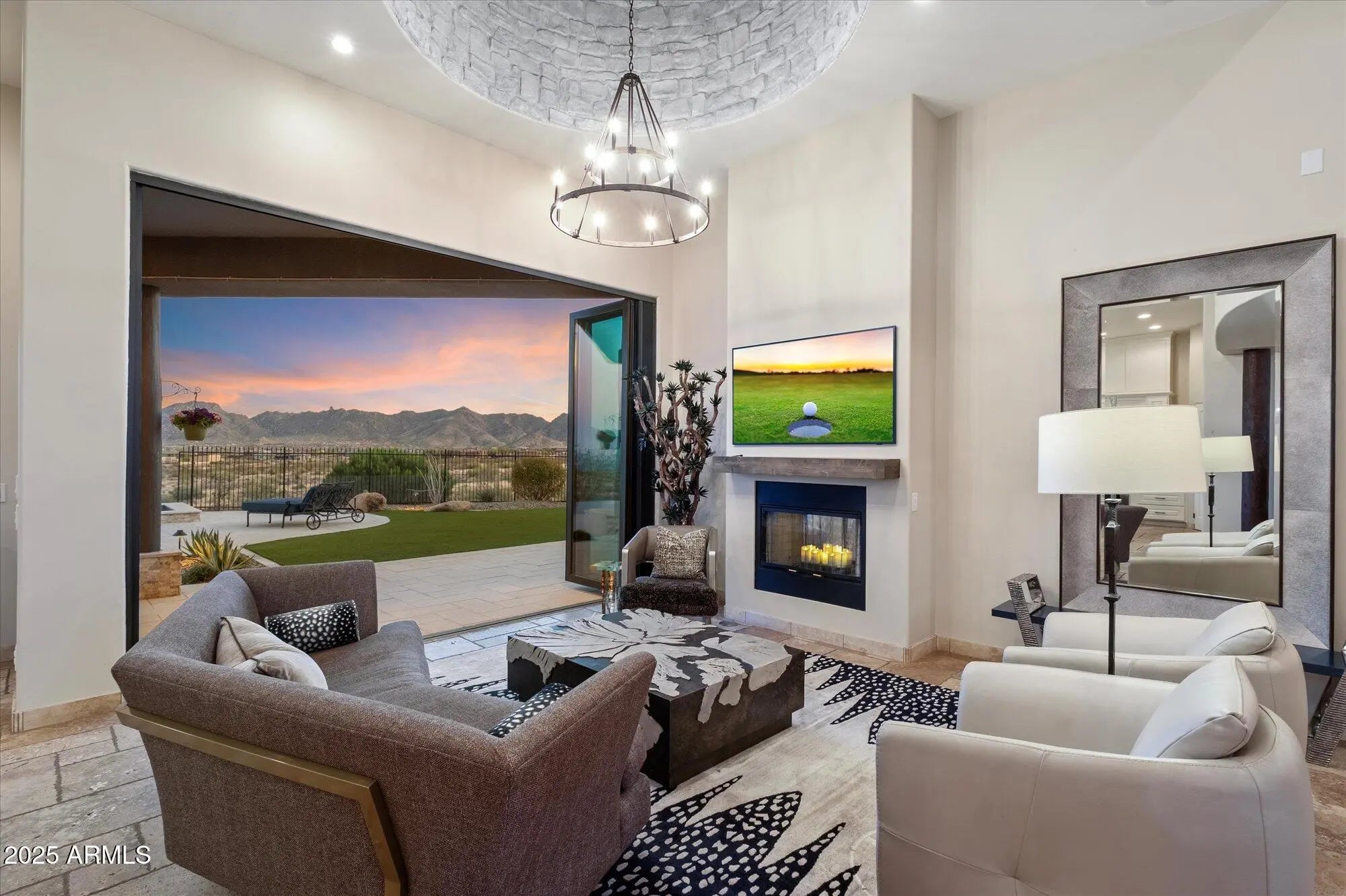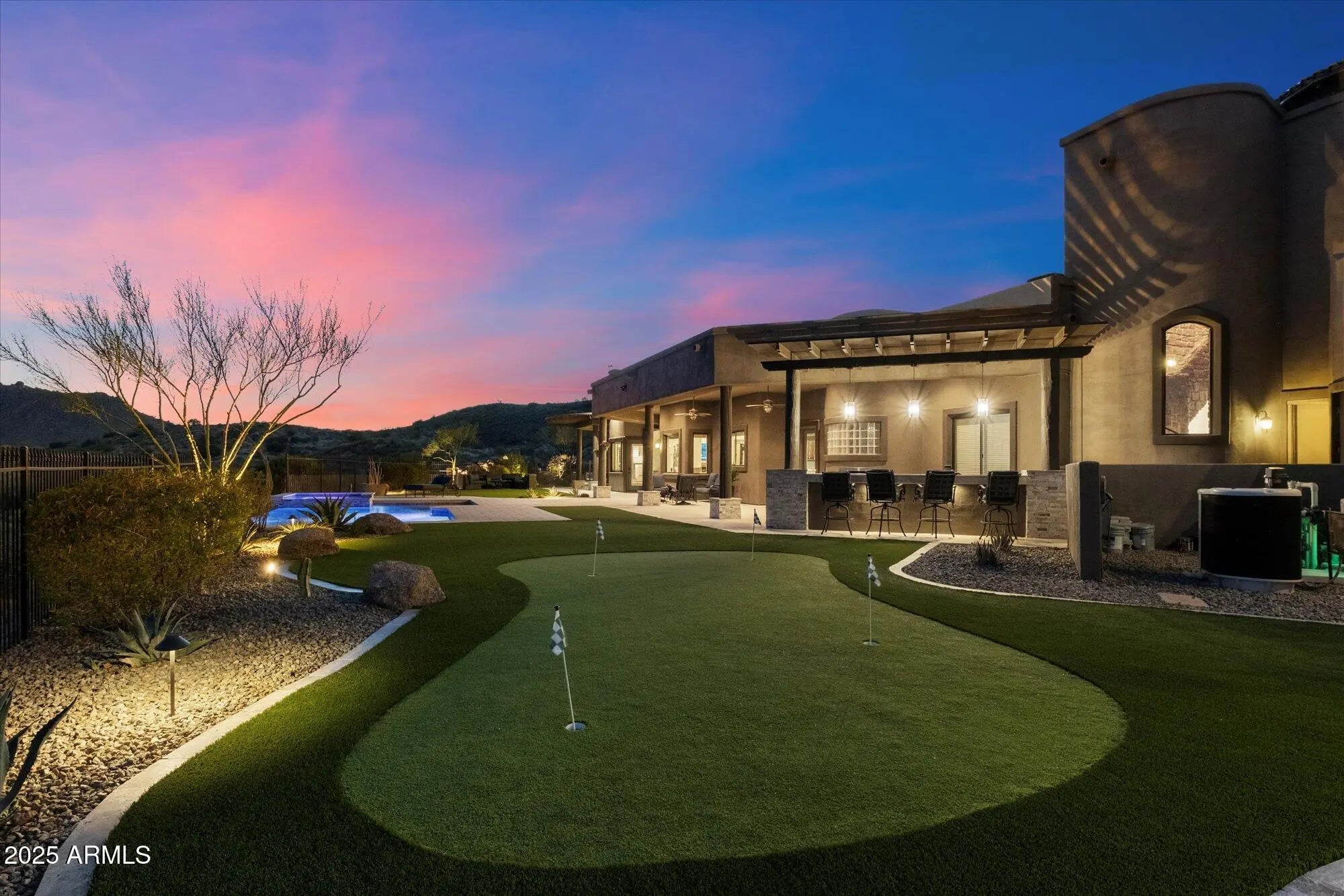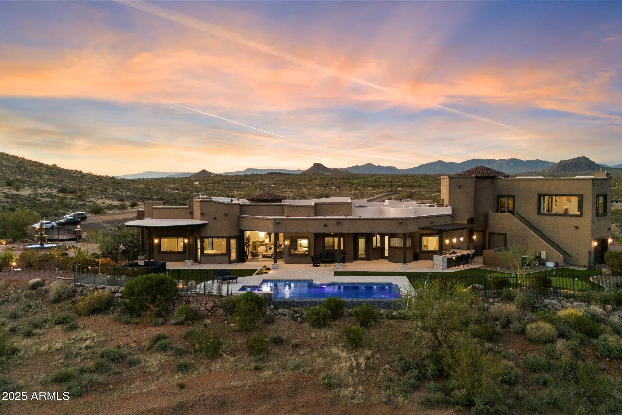 Outstanding value in N. Scottsdale! Upscale luxury meets desert serenity at this 5,110 sq. ft. custom Scottsdale estate on 2.98 elevated acres with sweeping mountain views. A show-stopping 5-car glass-door garage welcomes car lovers. Inside: five ensuite bedrooms offer sanctuary and seclusion, each with private patios and curated views, a chef's kitchen flowing to a spectacular signature living area with 16-ft sliding glass wall, opening to a south-facing yard with infinity pool, spa, misting system, putting green and outdoor kitchen. Enjoy a professional grade home theater and commercial-grade internet. Minutes to Scottsdale National and the Four Seasons. The best of Scottsdale living. Where luxury meets the desert sky. 27411 N. 120th St. 2023-2025 Home Upgrades and Enhancements Exterior 120th Street was privately paved in 2024 by homeowner from Dynamite Blvd. to the driveway-note that Google Maps may not yet reflect this. Backyard & Pool/Spa Renovation: Automated pool equipment and plumbing; Pool resurfaced with PebbleTec finish; Full outdoor kitchen with built-in BBQ, smoker, and sink; Wraparound misting system on terrace; Cool deck pavers installed throughout backyard; Artificial turf with custom putting green; Outdoor lighting system around the entire property; Renovated irrigation system; Front flagpole added along with a second putting green; and, Full exterior stucco painting. Interior Upgrades 16-ft. folding glass door system with retractable screen in great room; Professional Home Theater System; Projector and surround sound system integrated into walls and ceiling (media room); Equipment housed discreetly in media room closet; Epoxy-coated floors in garage sized to accommodate a sports car lift; Three new full-view glass garage doors installed; Designer chandeliers and sconces throughout; Dining room detailed with grasscloth wallpaper; and, Remodeled powder room with updated finishes. Technology & Electronics Exterior surveillance camera system; Commercial-grade wired internet; and, Whole-home Sonos sound system.