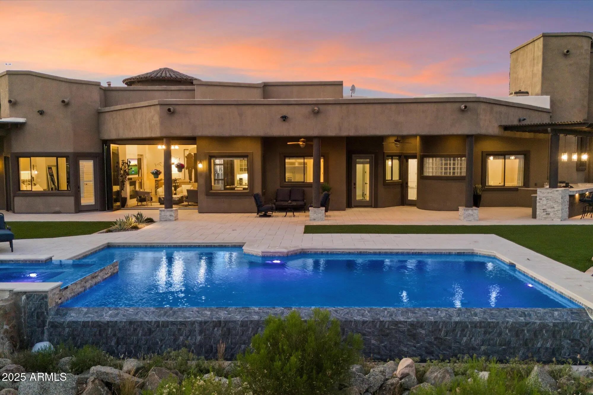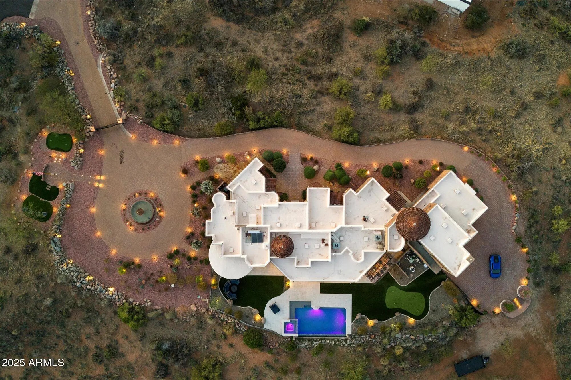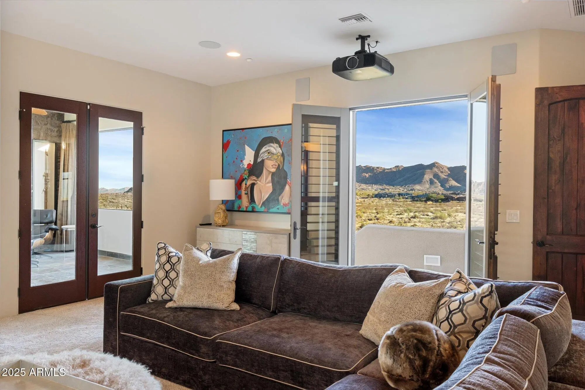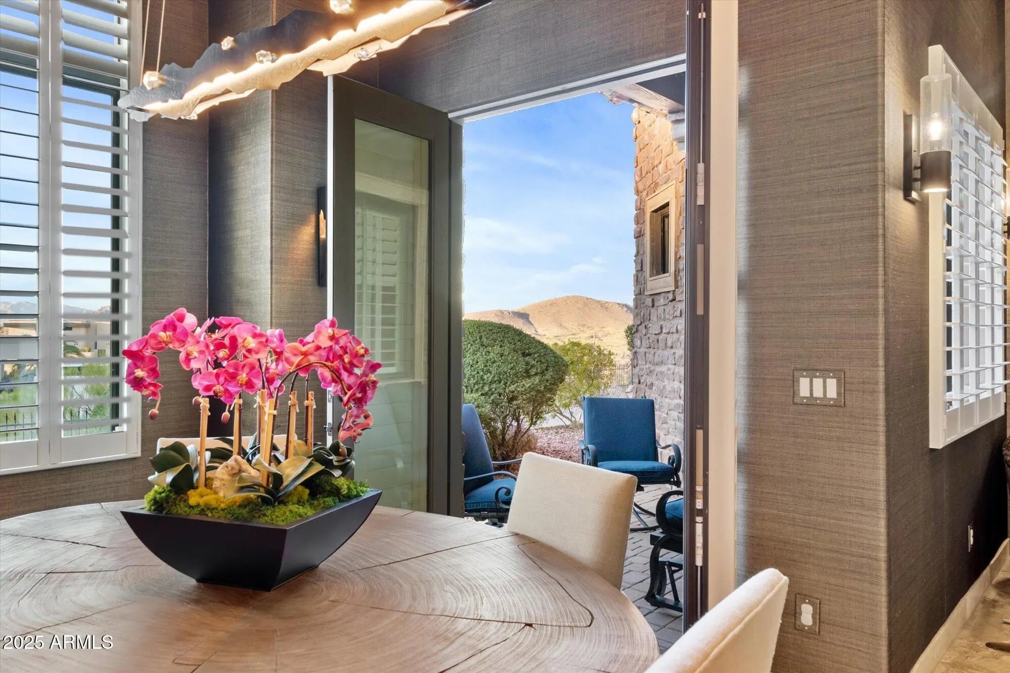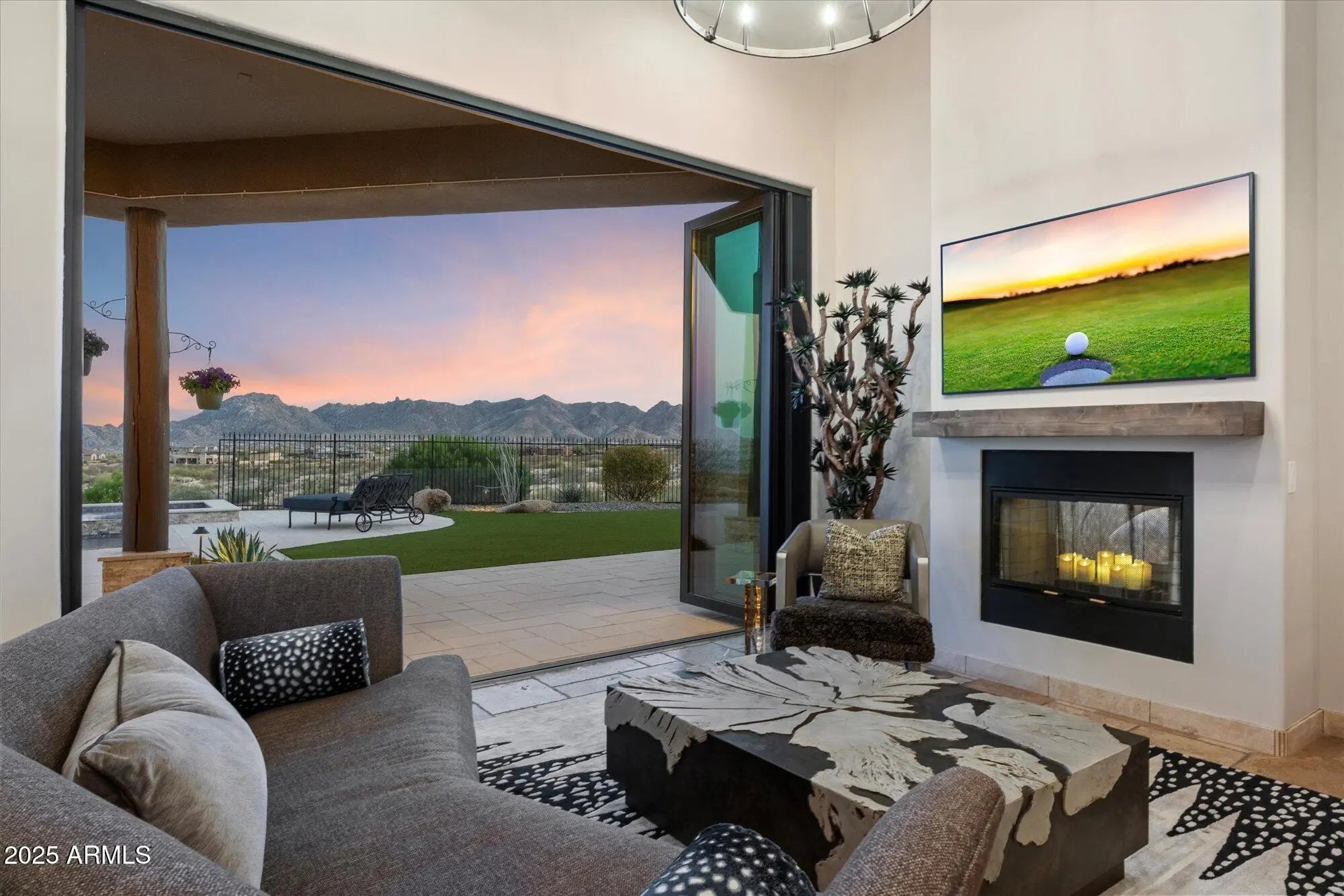 Outstanding value in N. Scottsdale! Upscale luxury meets desert serenity at this 5,110 sq. ft. custom Scottsdale estate on 2.98 elevated acres with sweeping mountain views. A show-stopping 5-car glass-door garage welcomes car lovers. Inside: five ensuite bedrooms offer sanctuary and seclusion, each with private patios and curated views, a chef's kitchen flowing to a spectacular signature living area with 16-ft sliding glass wall, opening to a south-facing yard with infinity pool, spa, misting system, putting green and outdoor kitchen. Enjoy a professional grade home theater and commercial-grade internet. Minutes to Scottsdale National and the Four Seasons. The best of Scottsdale living. Where luxury meets the desert sky. 27411 N. 120th St. 2023-2025 Home Upgrades and Enhancements Exterior 120th Street was privately paved in 2024 by homeowner from Dynamite Blvd. to the driveway-note that Google Maps may not yet reflect this. Backyard & Pool/Spa Renovation: Automated pool equipment and plumbing; Pool resurfaced with PebbleTec finish; Full outdoor kitchen with built-in BBQ, smoker, and sink; Wraparound misting system on terrace; Cool deck pavers installed throughout backyard; Artificial turf with custom putting green; Outdoor lighting system around the entire property; Renovated irrigation system; Front flagpole added along with a second putting green; and, Full exterior stucco painting. Interior Upgrades 16-ft. folding glass door system with retractable screen in great room; Professional Home Theater System; Projector and surround sound system integrated into walls and ceiling (media room); Equipment housed discreetly in media room closet; Epoxy-coated floors in garage sized to accommodate a sports car lift; Three new full-view glass garage doors installed; Designer chandeliers and sconces throughout; Dining room detailed with grasscloth wallpaper; and, Remodeled powder room with updated finishes. Technology & Electronics Exterior surveillance camera system; Commercial-grade wired internet; and, Whole-home Sonos sound system.