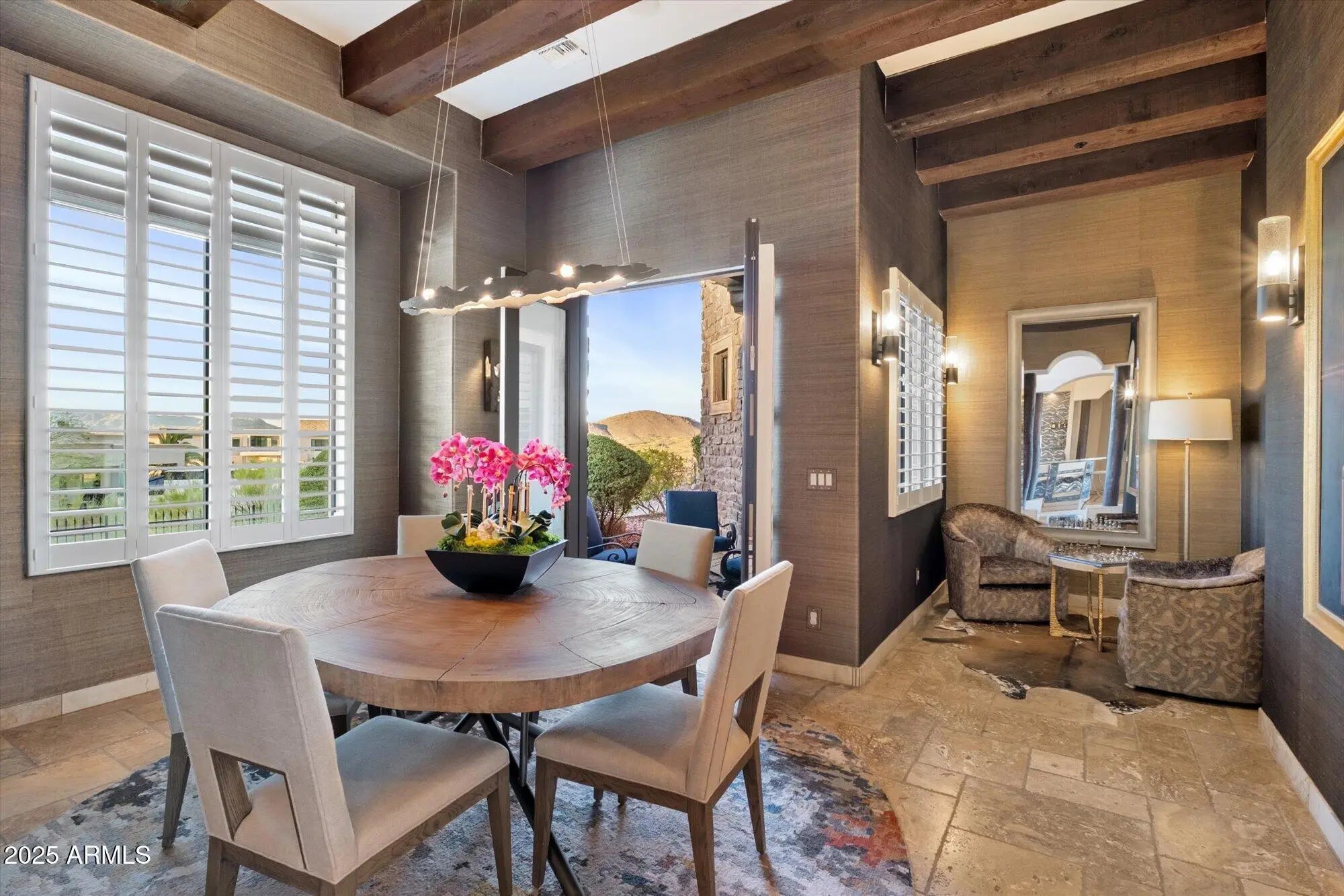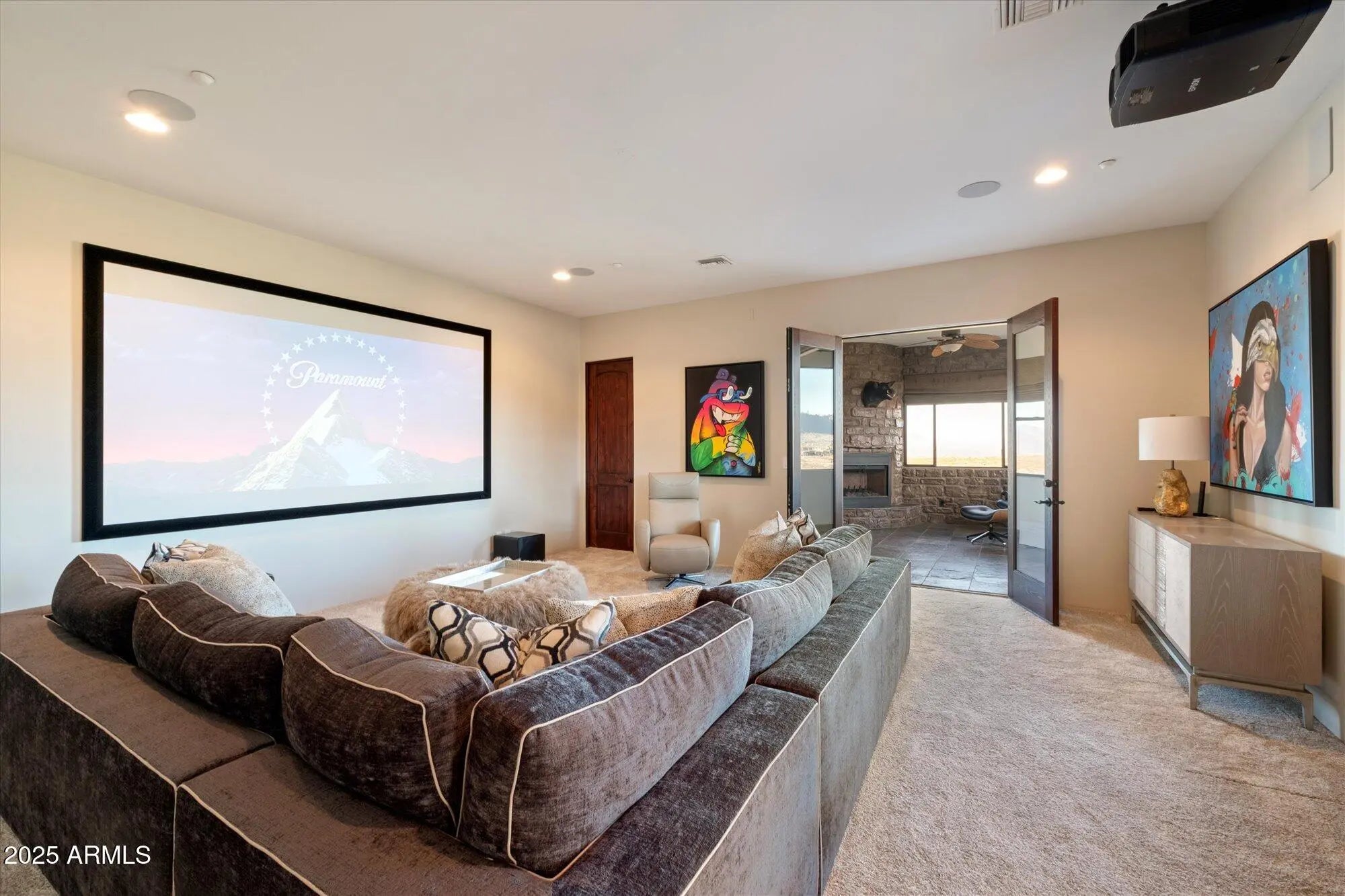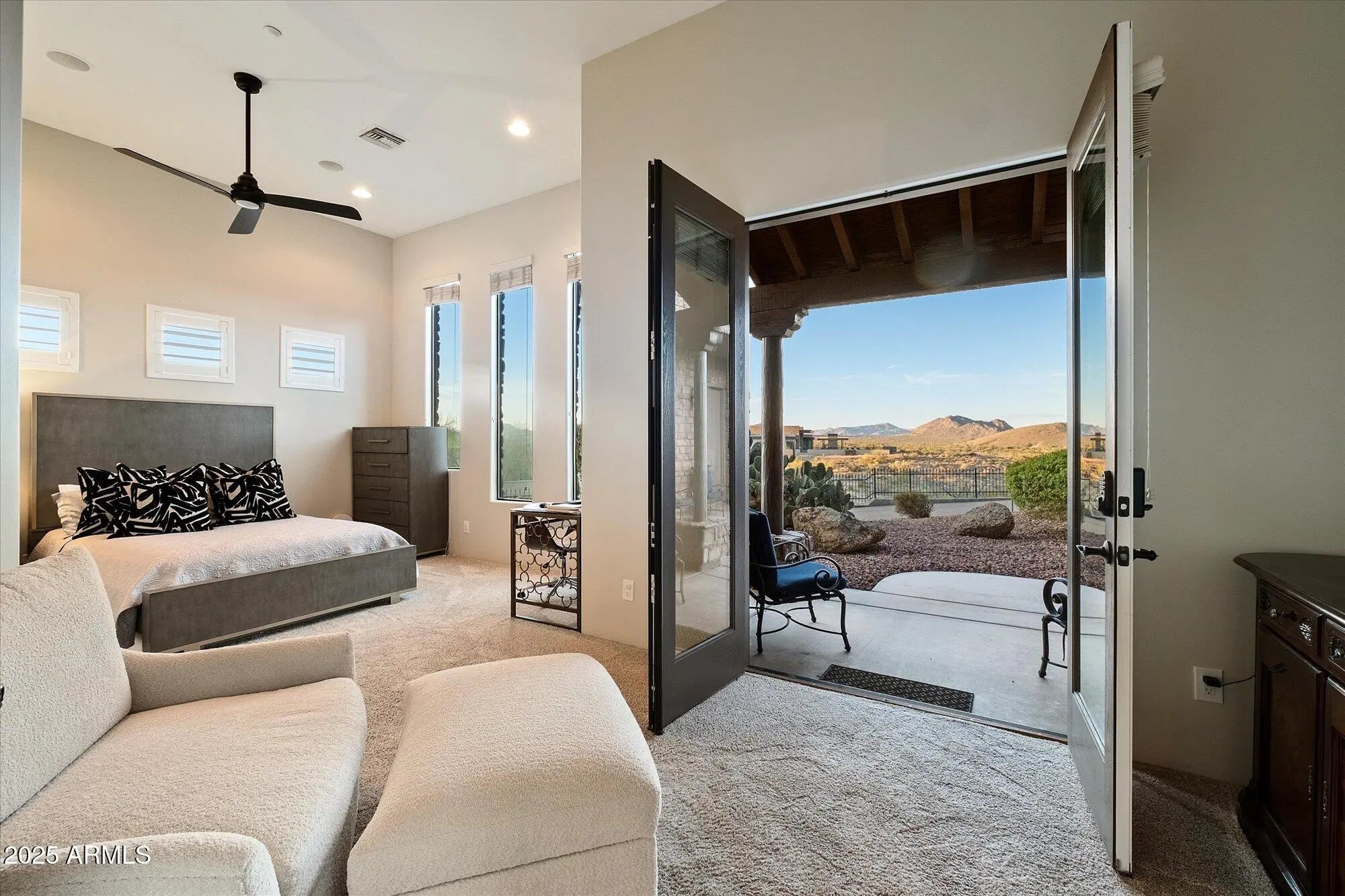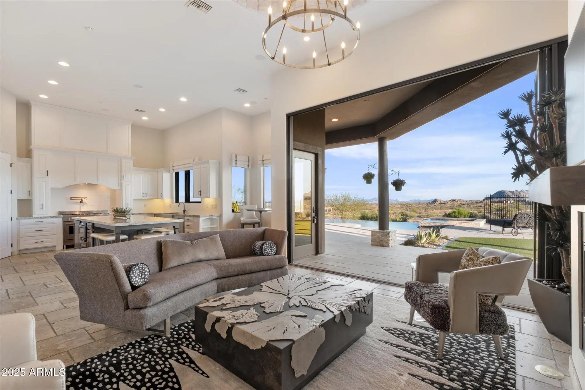 Outstanding value in N. Scottsdale! Upscale luxury meets desert serenity at this 5,110 sq. ft. custom Scottsdale estate on 2.98 elevated acres with sweeping mountain views. A show-stopping 5-car glass-door garage welcomes car lovers. Inside: five ensuite bedrooms offer sanctuary and seclusion, each with private patios and curated views, a chef's kitchen flowing to a spectacular signature living area with 16-ft sliding glass wall, opening to a south-facing yard with infinity pool, spa, misting system, putting green and outdoor kitchen. Enjoy a professional grade home theater and commercial-grade internet. Minutes to Scottsdale National and the Four Seasons. The best of Scottsdale living. Where luxury meets the desert sky. 27411 N. 120th St. 2023-2025 Home Upgrades and Enhancements Exterior 120th Street was privately paved in 2024 by homeowner from Dynamite Blvd. to the driveway-note that Google Maps may not yet reflect this. Backyard & Pool/Spa Renovation: Automated pool equipment and plumbing; Pool resurfaced with PebbleTec finish; Full outdoor kitchen with built-in BBQ, smoker, and sink; Wraparound misting system on terrace; Cool deck pavers installed throughout backyard; Artificial turf with custom putting green; Outdoor lighting system around the entire property; Renovated irrigation system; Front flagpole added along with a second putting green; and, Full exterior stucco painting. Interior Upgrades 16-ft. folding glass door system with retractable screen in great room; Professional Home Theater System; Projector and surround sound system integrated into walls and ceiling (media room); Equipment housed discreetly in media room closet; Epoxy-coated floors in garage sized to accommodate a sports car lift; Three new full-view glass garage doors installed; Designer chandeliers and sconces throughout; Dining room detailed with grasscloth wallpaper; and, Remodeled powder room with updated finishes. Technology & Electronics Exterior surveillance camera system; Commercial-grade wired internet; and, Whole-home Sonos sound system.