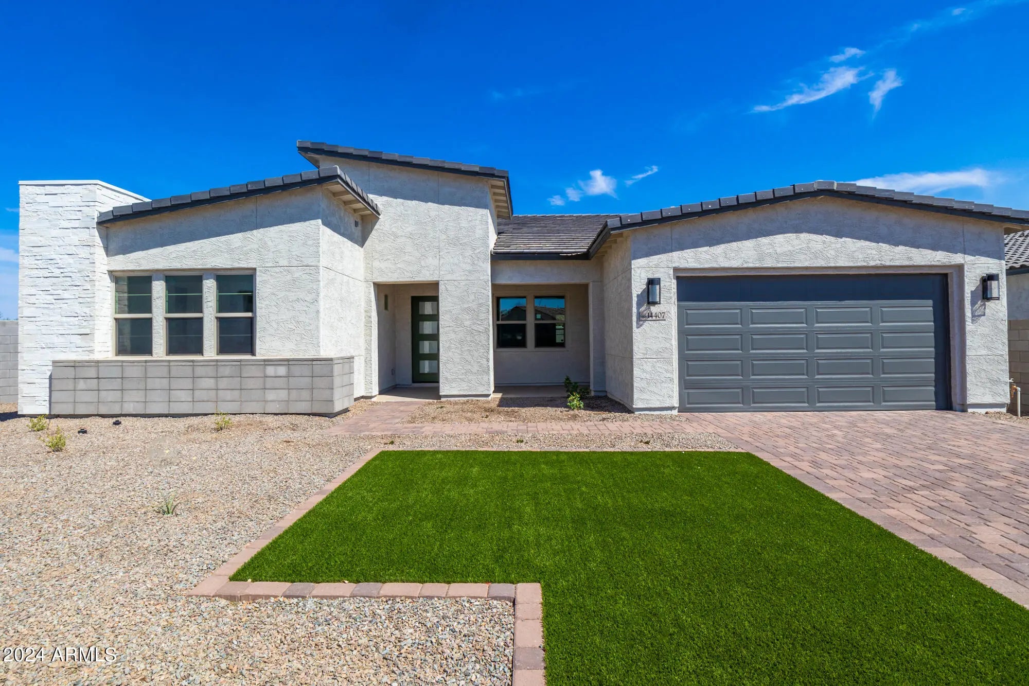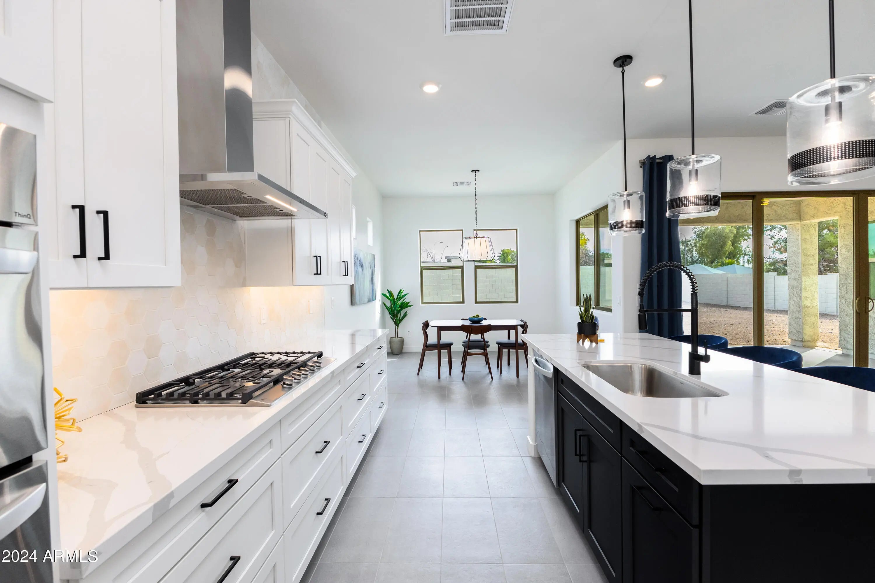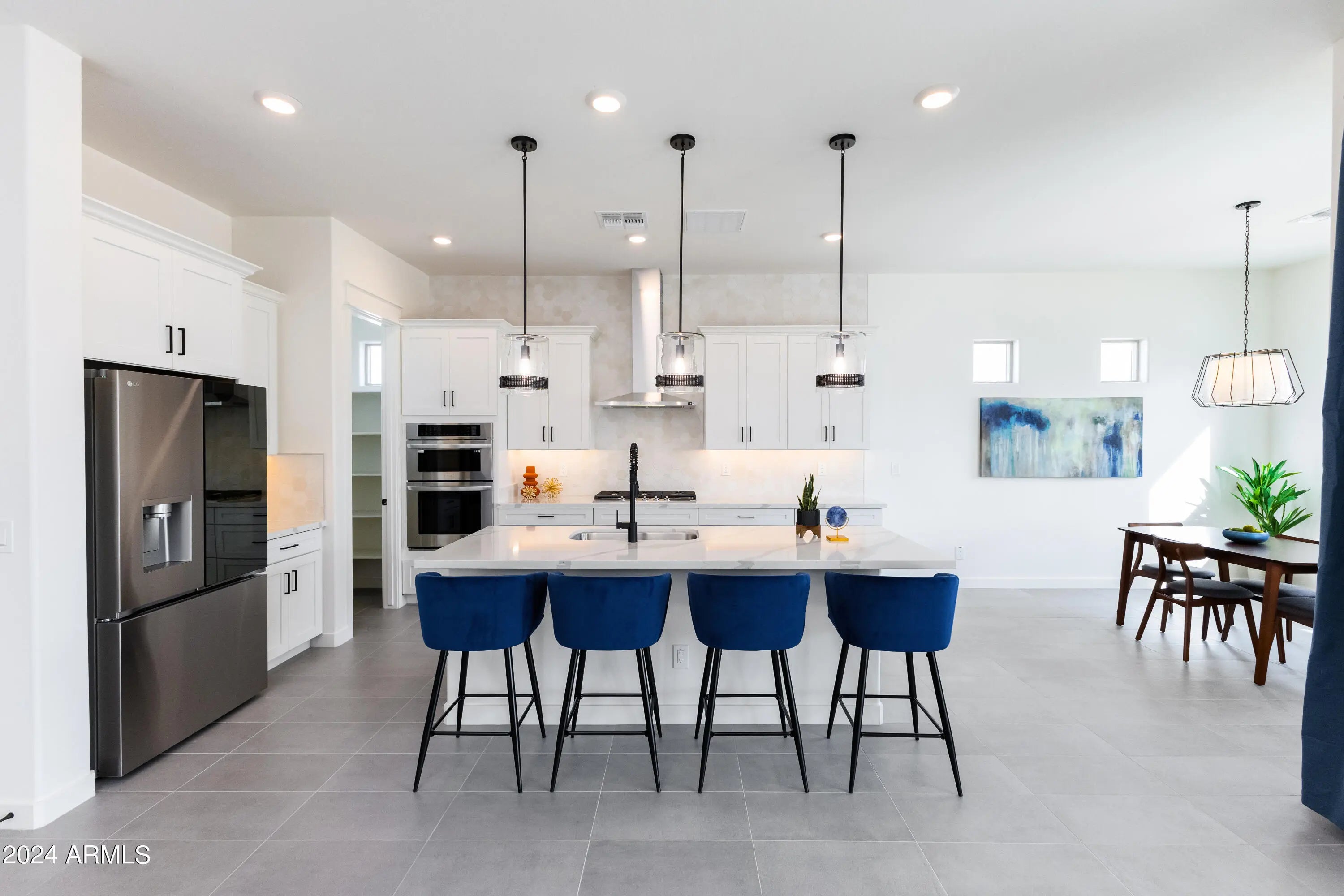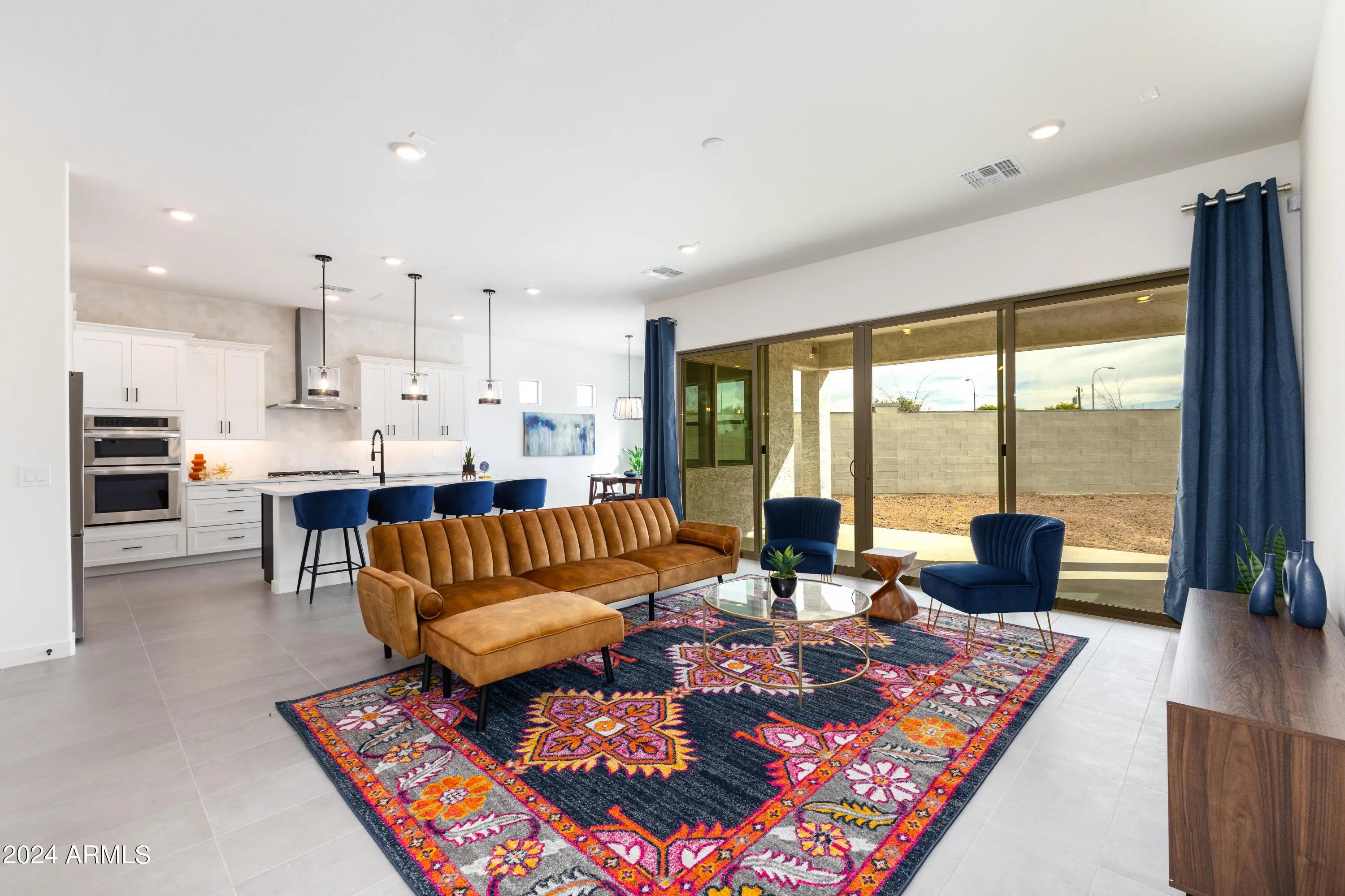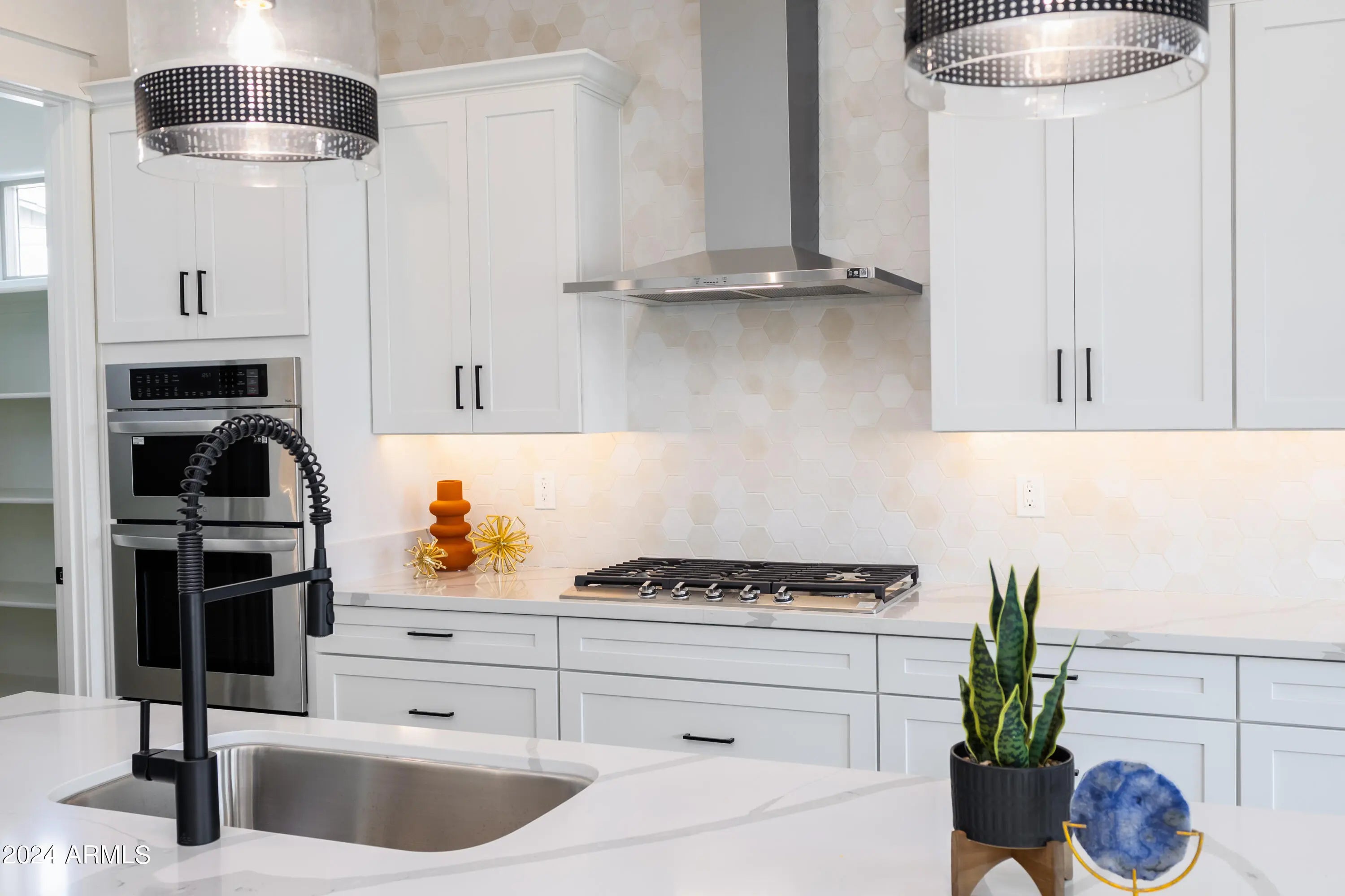 QUICK MOVE-IN This beautifully designed single-level home on an 11,334 sq. ft. lot offers 3 bedrooms and 3 full bathrooms, including a private retreat with a kitchenette, sitting area, walk-in closet, and full bath—perfect for guests, in-laws, or multi-generational living. The spacious 3-car tandem garage provides ample storage, while the extended covered patio with multi-sliding glass doors creates seamless indoor-outdoor living. Inside, the gourmet kitchen is equipped with LG wall ovens, Calacatta Devine quartz countertops in both the kitchen and laundry room, and striking 42'' white and caviar shaker cabinets throughout. Thoughtful upgrades include custom electrical and low-voltage packages, premium finishes, and a flexible floor plan.
