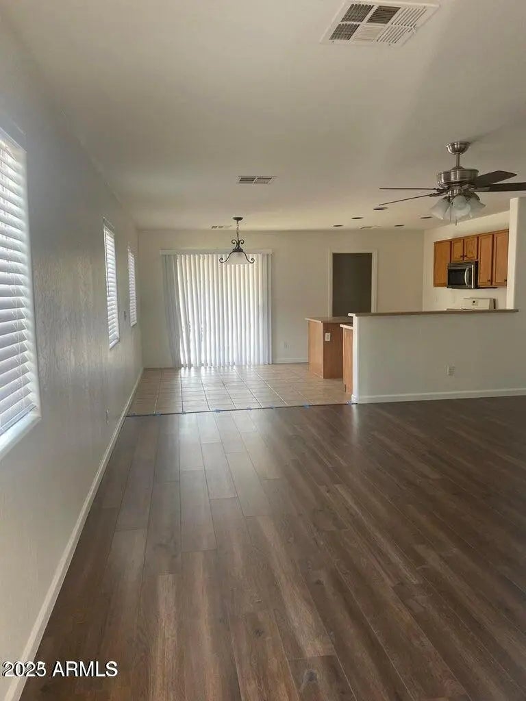Surprise Farms 3 bedroom 2 bath with a great room, Great community with biking and walking paths and children's play area. Beautiful laminate flooring in great room, tile in traffic areas and carpet in the bedrooms. Ceiling fans, recessed lights in the kitchen, raised panel doors. North South exposure. Double sinks and walk in closet in Master Bedroom. A second walk in closet in bedroom 2.