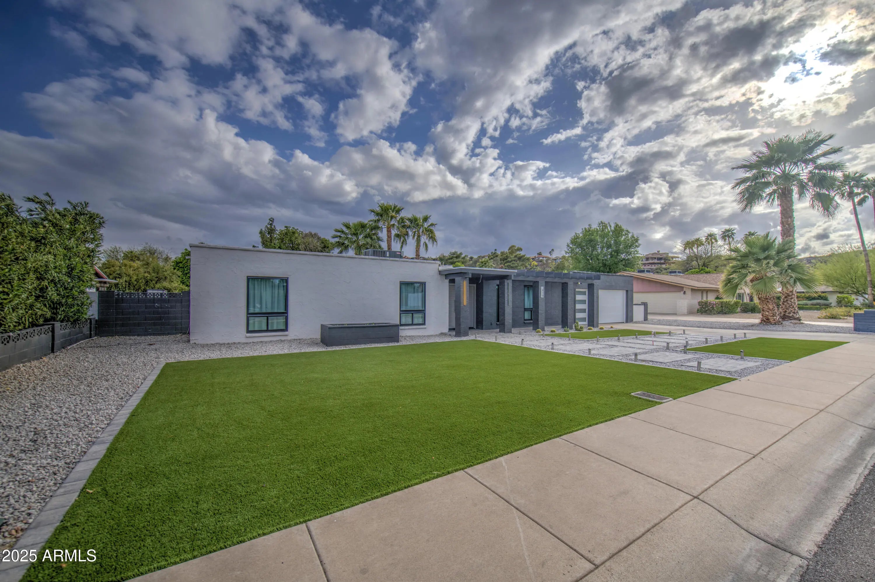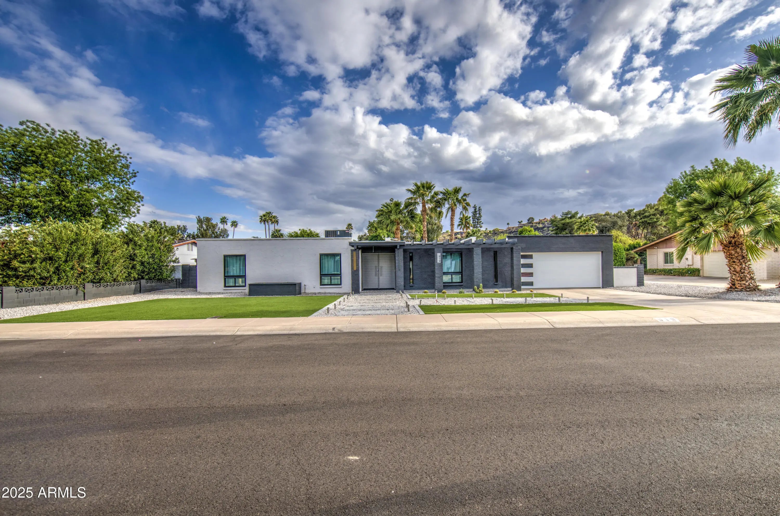Nestled in the coveted Moon Valley neighborhood, this redesigned Mid-century modern home blends style and function. Just minutes from hiking trails and golf courses, it's ideal for outdoor enthusiasts. The home boasts 4 spacious bedrooms, 2 bathrooms, and premium finishes throughout. The kitchen features a large waterfall island, quartz countertops, custom cabinetry, and a mini walk-in butler's pantry. The master bath includes a walk-in shower with dual rainfall showerheads, tile work, LED accents, and a touchscreen mirror. Upgrades include new A/C, water heater, roof, windows, doors, and garage door. The backyard offers stunning mountain views, lush greenery, and a beautiful pool.