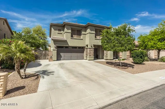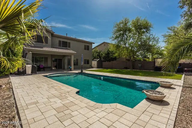 Welcome to Cobblestone's Fulton community, where this stunning home boasts an impressive array of features, including five-plus bedrooms, a pool, pergola, butler pantry, and dedicated office. Upon entering, you'll notice the upgraded flooring with large wood-look tile planks and a large pantry with a sliding barn door. The large open-concept kitchen features SS appliances and plenty of cabinet space. Enjoy relaxing evenings on the patio before taking a dip in the expansive pool surrounded by travertine pavers. Unwind in the pergola surrounded by trees for the perfect shade. Upstairs you will enjoy the spacious master suite with an executive shower and walk-in closet. Additionally, the home features leased solar panels and newer AC unit.