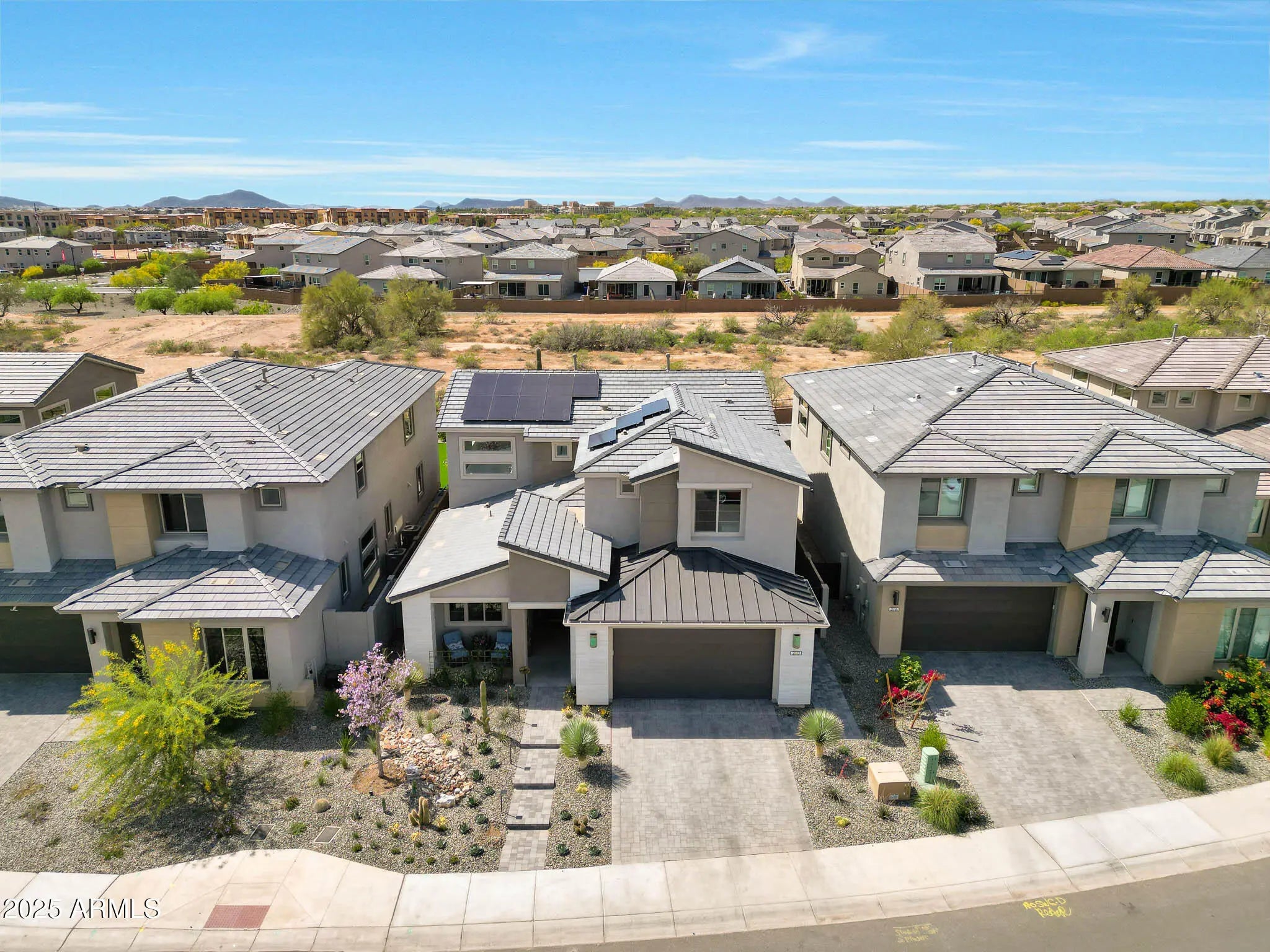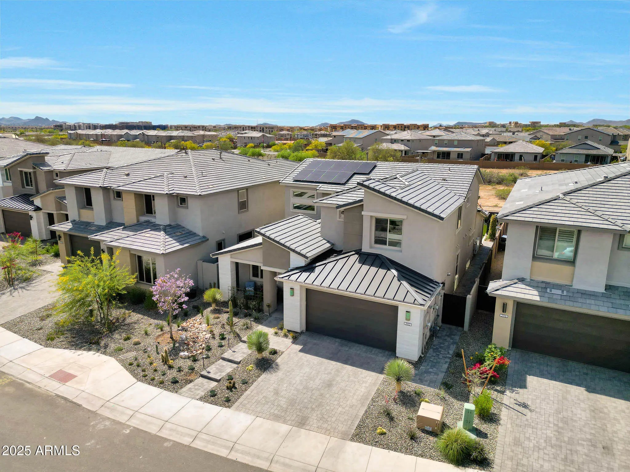 Welcome to 21112 N 60th Place, nestled in the coveted Talinn at Desert Ridge community. This stunning Prato floor plan, completed in 2024, offers the perfect blend of modern luxury and low-maintenance comfort. Boasting six generously sized bedrooms, five beautifully appointed bathrooms, and a versatile flex space ideal for a home office, gym, or guest retreat, this home adapts effortlessly to your lifestyle. At the heart of the home, a light-filled open-concept living area is framed by multi-slide corner doors that blur the lines between indoor and outdoor living. Entertain with ease in the chef's kitchen, featuring top-of-the-line appliances and sleek finishes, or unwind in your own backyard oasis complete with a custom-designed pool and spa. With tasteful upgrades throughout— wood flooring, owned solar panels, and lush yet low-maintenance landscapingthis home is designed for carefree living. Located just minutes from Desert Ridge Marketplace, Mayo Clinic, major freeways, JW Marriott, and Wildfire Golf Club, you'll enjoy both convenience and connection, all within the highly rated Paradise Valley School District. Whether you're looking for a full-time residence or a luxurious second home, 21112 N 60th Place is Scottsdale living at its finest.