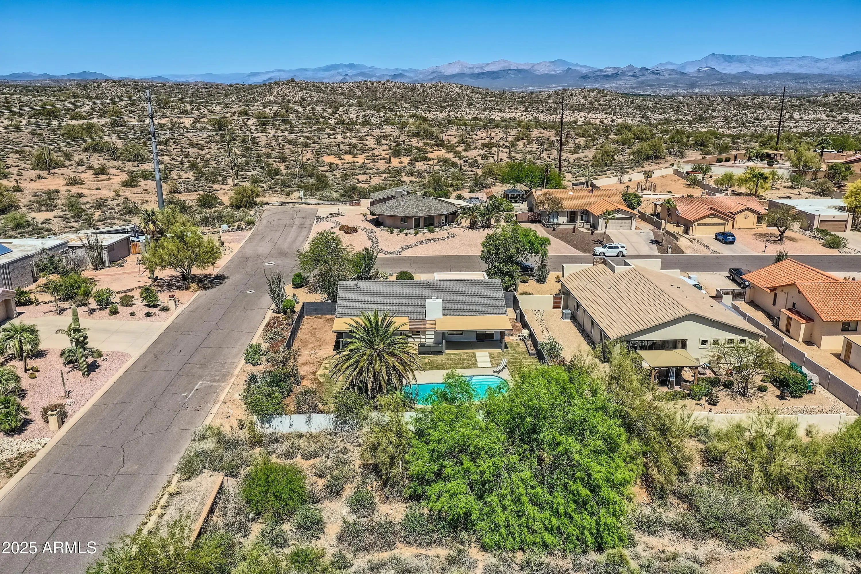 This newly updated quiet retreat offers an oasis paradise with mountain views. Just steps from the desert preserve and walking trails. Nestled in this quaint corner of town makes it the perfect setting for those relaxing quiet dark sky star gazing nights. As a corner lot backing up to a wash you have extra privacy. You are walking distance to the famous Mexican Cantina Masquedores where you can enjoy Taco Tuesday while sipping on a refreshing Margarita and then walk home and relax by the pool in your private oasis backyard with mountain views. 700sf of covered patio space as well as a front sitting area courtyard enhance the outdoor living lifestyle. Oversized corner lot with corner side RV gate access parking allows plenty of room for parking options. This beautiful, professionally updated home offers soaring ceilings an open floor plan and plenty of natural light. Updates include new luxury vinyl plank flooring, Italian entry tile, fresh paint inside and out, custom cabinets, slab counters, primary bath, guest bath, light fixtures, plumbing fixtures, ceiling fans, custom fireplaces, outdoor kitchen, new roof and much more. Have company in town that don't like to go on hiking trails? Then also steps away you can rent E Bikes and take them on a grand tour of the most amazing town Arizona has to offer. No HOA. No NPOA. Great for short term rental opportunities.