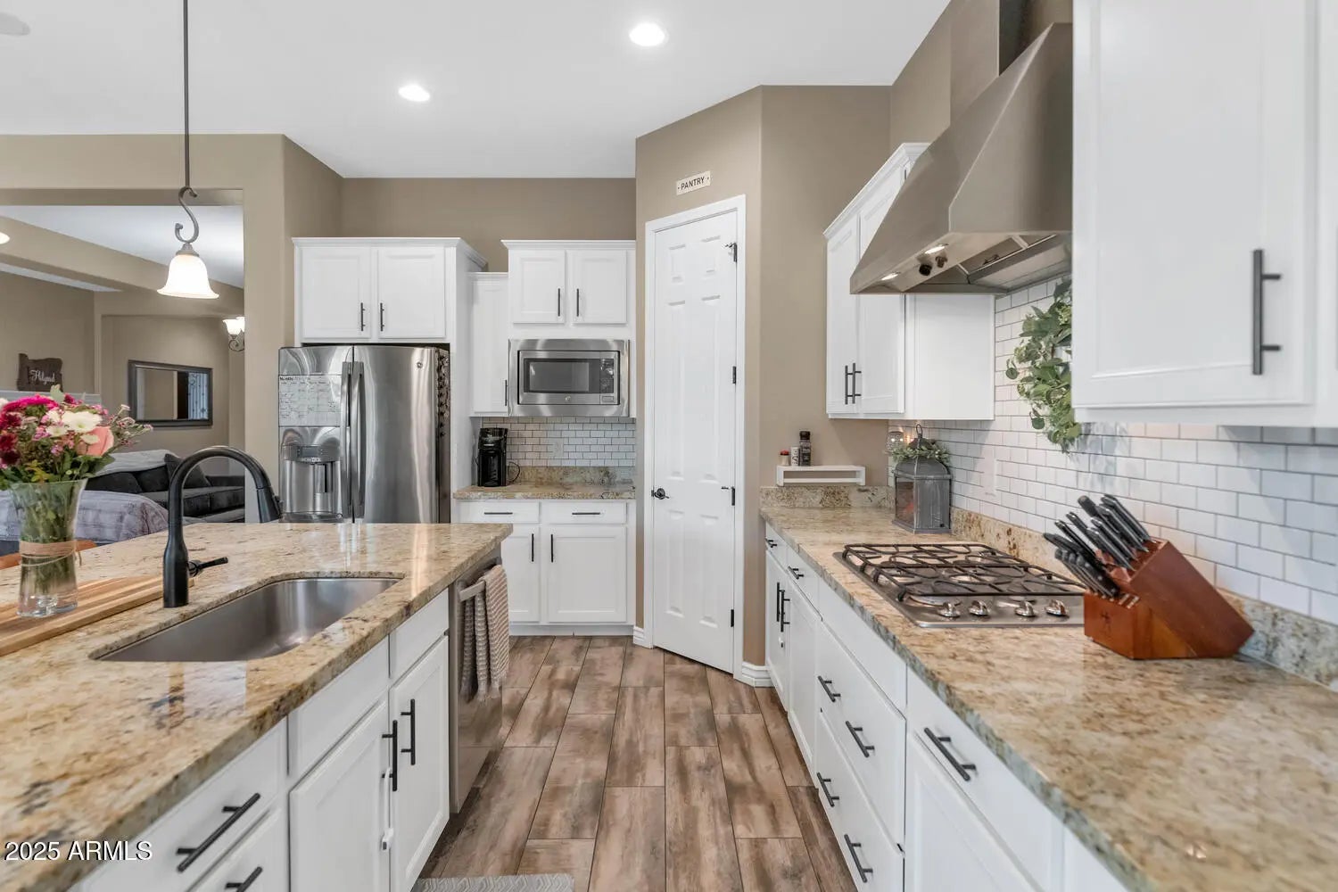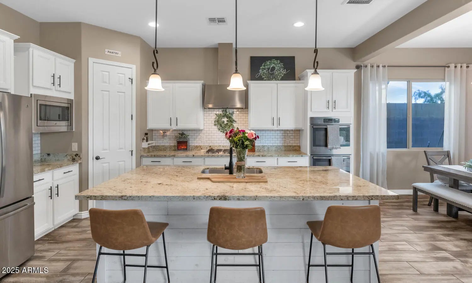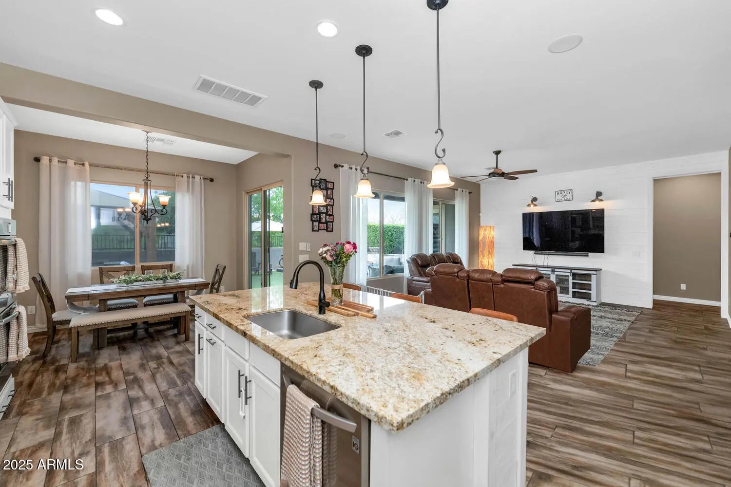 Nestled within the prestigious Sonoran Commons community, this immaculate home boasts stunning curb appeal, with mountain views, desert landscaping & pavers from the driveway leading to the entry. This spacious 4 bedroom/3 bath home plus anoffice/bonus room features a 3-car garage with epoxy flooring, energy-efficient solar and convenient access to major highways, close to the TSMC chip manufacturing plant, plus a wide selection of shopping, dining, hiking, and more! Step through the custom wrought iron door into a thoughtfully designed open floor plan, highlighted by tile flooring with a wood-grain finish, neutral paint throughout, stylish sliding barn doors, LED lighting, a cozy built-in wall fireplace, a separate office or den, shiplap accent wall, oversized windows, and expansive glass sliding doors that create seamless indoor-outdoor living. The chef's kitchen is a dream, showcasing white cabinetry with crown molding, stainless steel appliances, gas cooktop with custom vent, double ovens, granite countertops, tile backsplash, a walk-in pantry, and an oversized island with seating. The family room is adjacent to the kitchen, just perfect for your everyday family lifestyle, a formal living room/dining room with sliding doors to the covered patio creates charm and convenience to this unique family home. The private primary suite offers direct access to the backyard and pool area through its own patio door, along with a bath featuring dual sinks, shower, dark wood finishes, and plenty of space for relaxation. You will love the resort-style backyard retreat featuring low-maintenance artificial turf, a spacious covered patio with a custom ramada with pavers, and a sparkling 5.5' deep Pebble Tec pool complete with a Baja step, umbrella holder, and soothing water bowl fountains. Located with a green belt behind you. Don't miss out on this incredible opportunity to own your dream home!