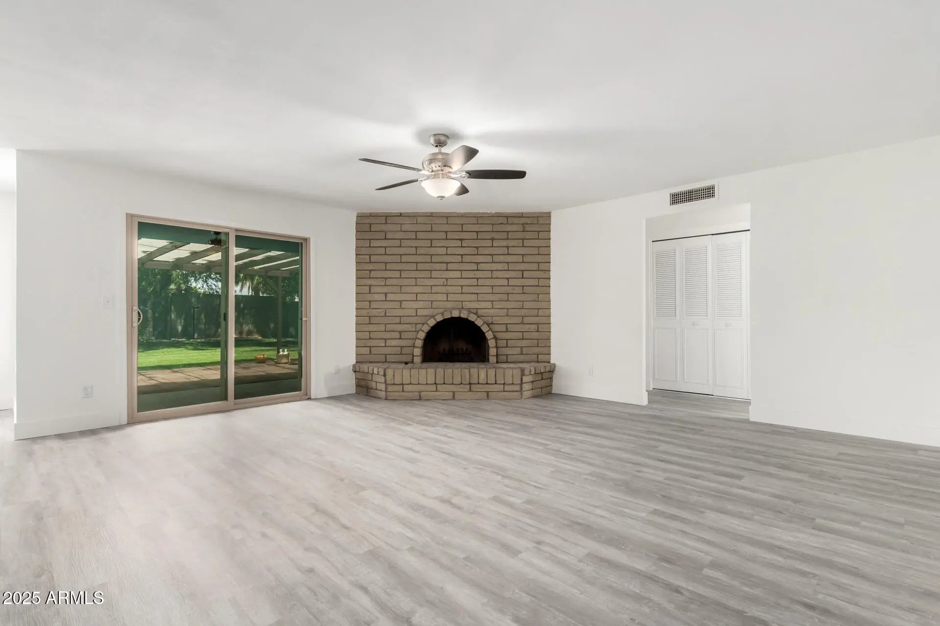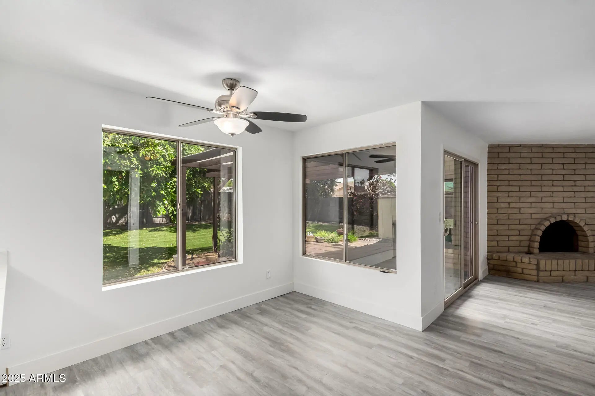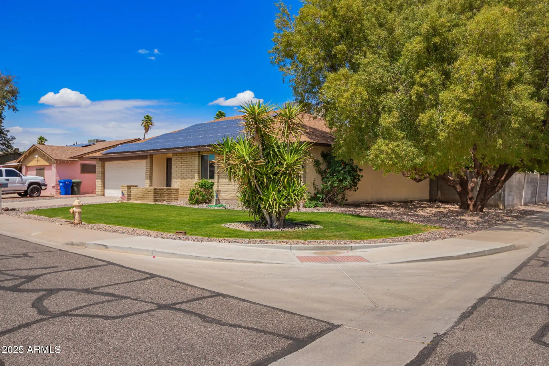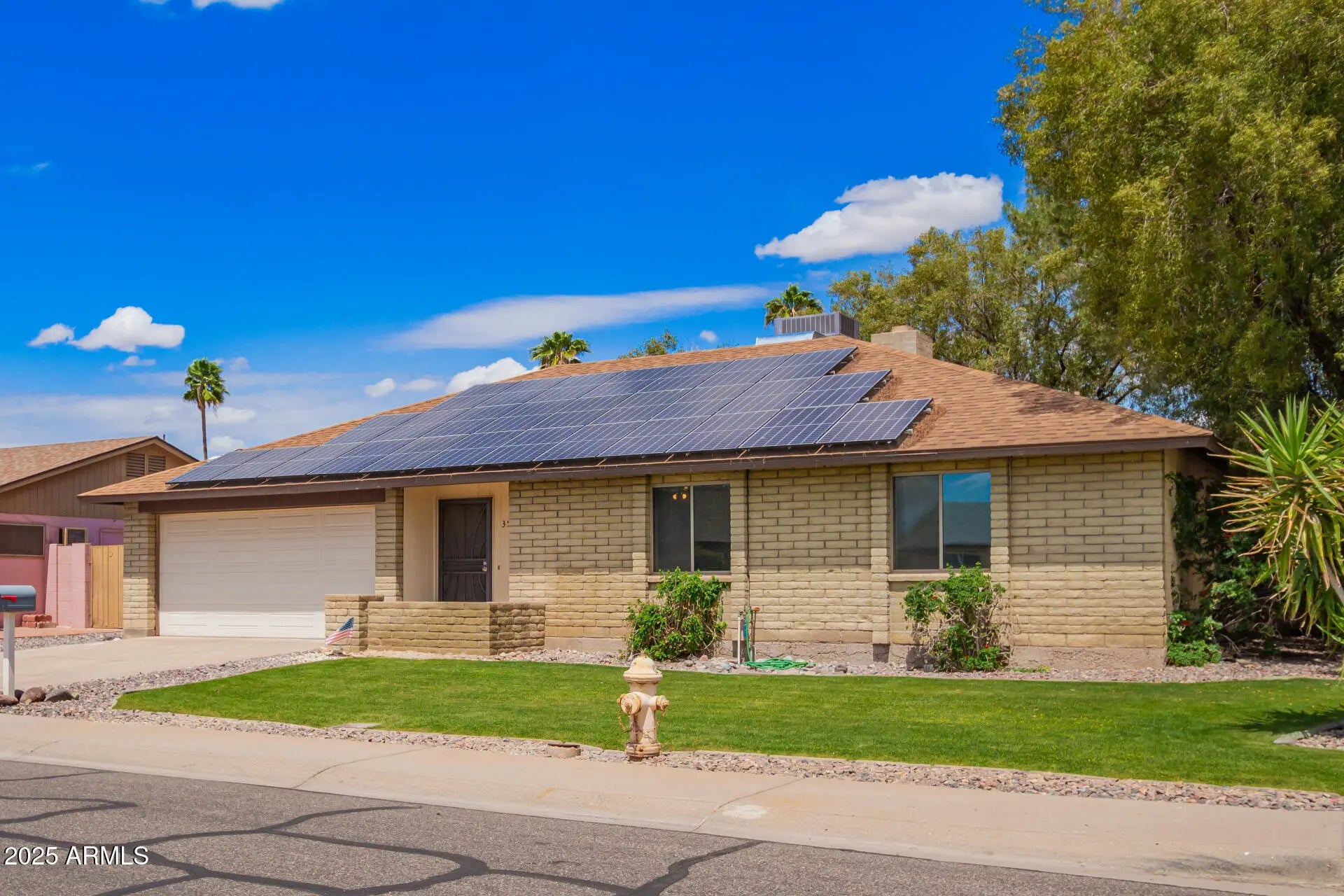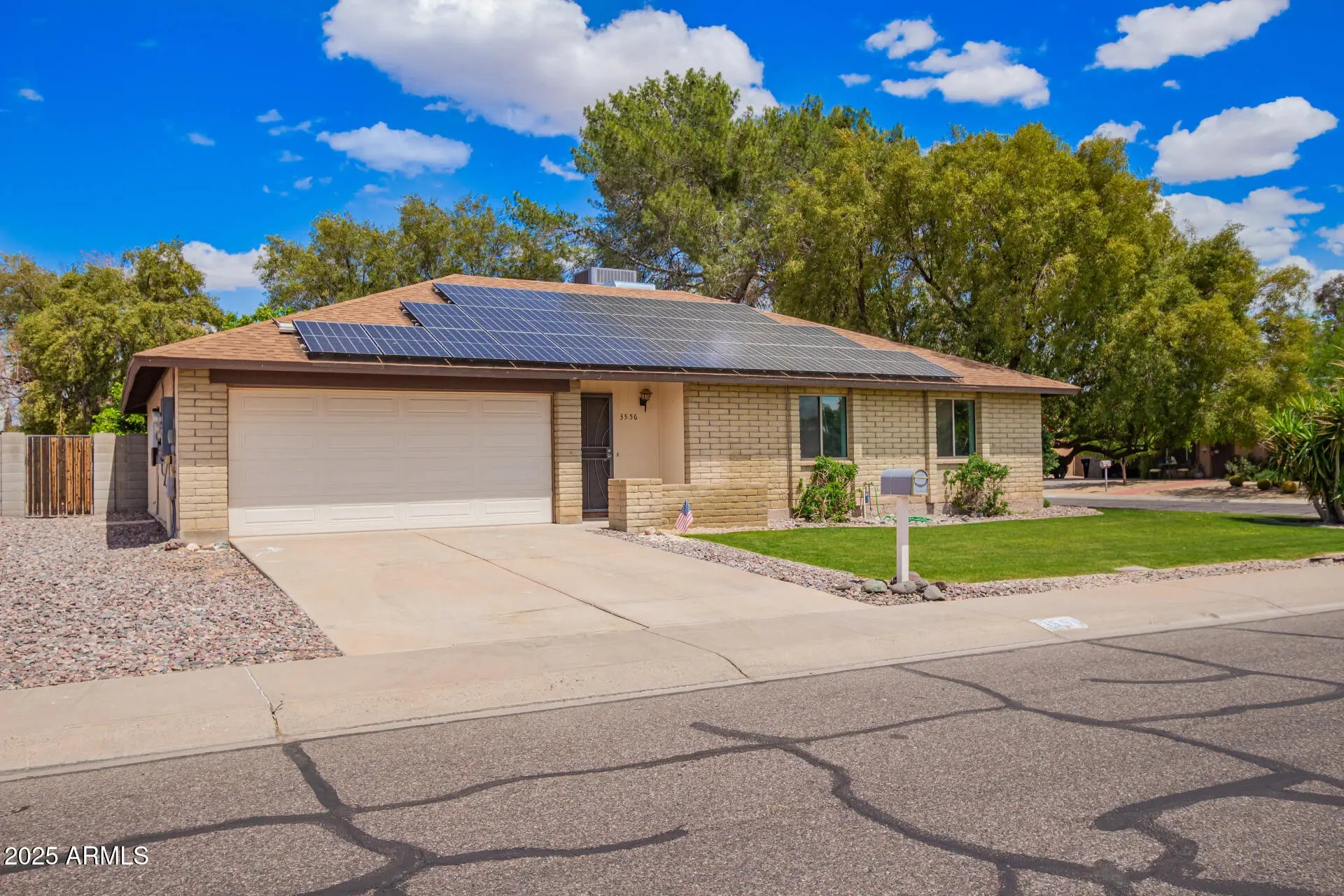 Situated on a PRIME corner lot! Fall in love with this energy-efficient 3-bedroom home adorned with owned solar panels (no payments or transfer)! From the moment you enter, you will be greeted by the large living room featuring wood-look flooring, fresh neutral paint, and a floor-to-ceiling brick fireplace. The upscale eat-in kitchen provides stainless steel appliances, crisp white cabinets, sleek quartz counters, and a breakfast bar. Retreat to the bright primary bedroom with sliding glass doors leading to the back patio and a private ensuite with a glass step-in shower.Full two car garage, All appliances are included for added convenience! Relax in the serene backyard, offering a covered patio, storage shed, and citrus trees. This fantastic home is ready to move in and enjoy.